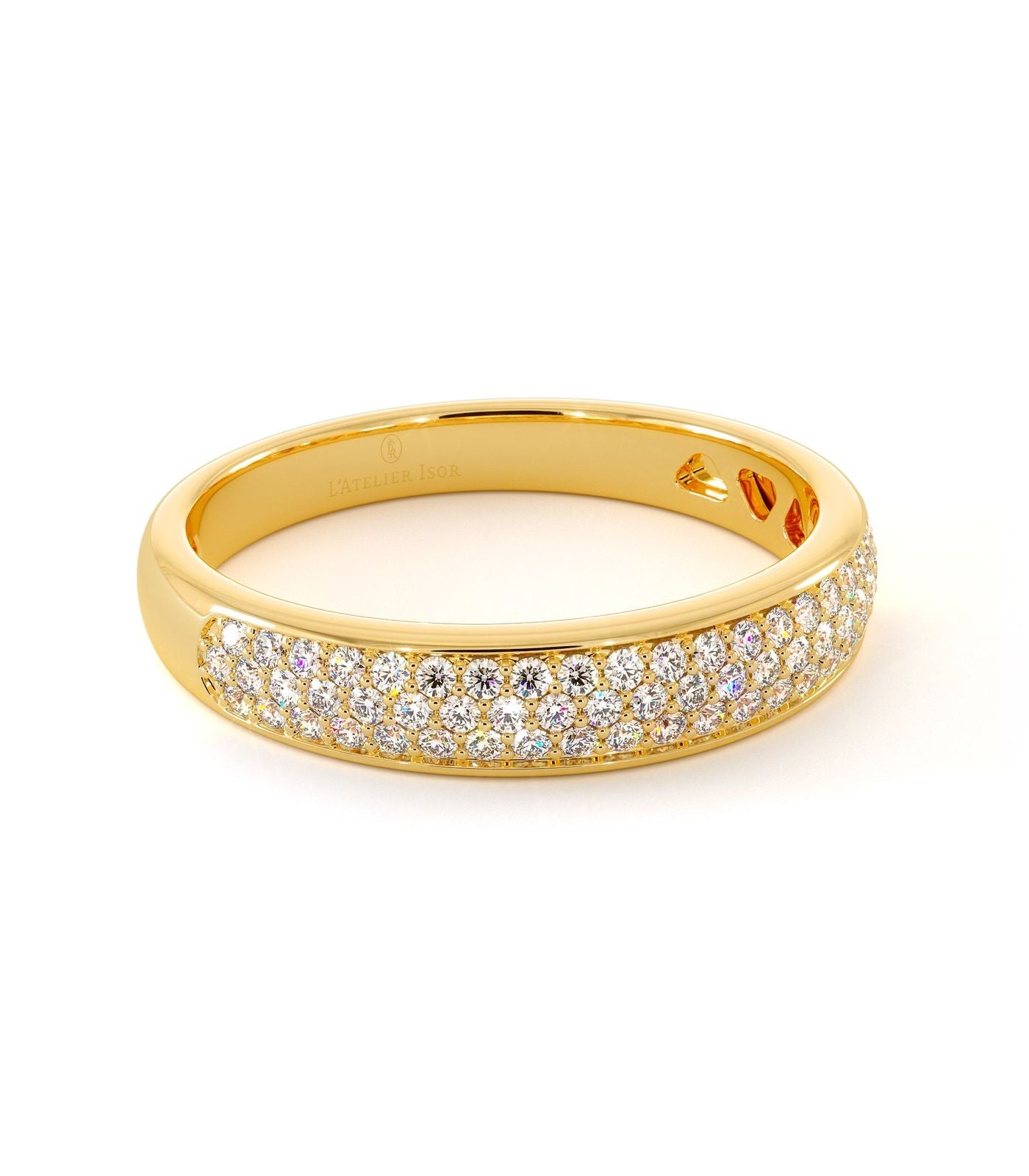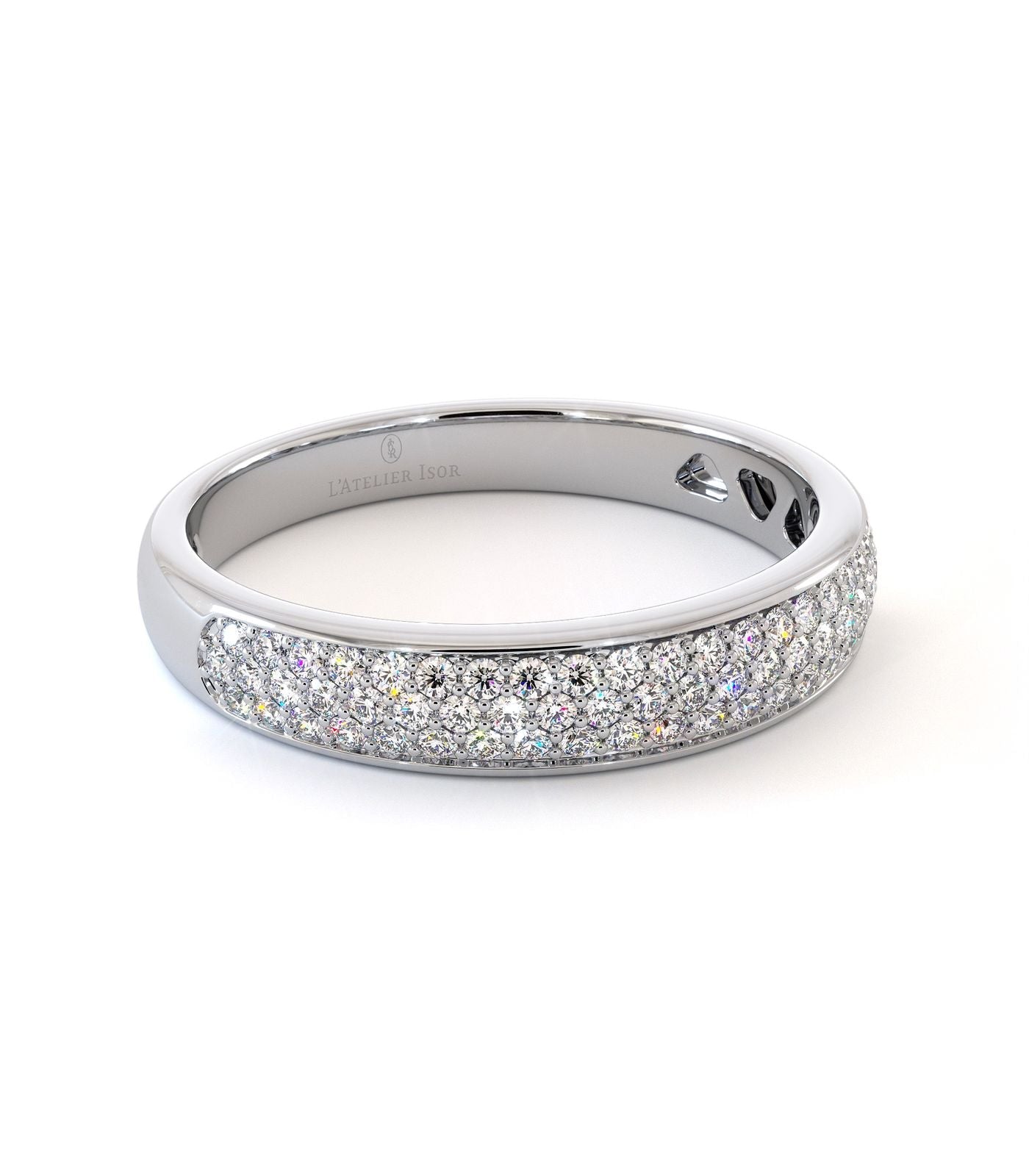 Eblouissante, l’alliance AMANDINE en or 18 carats est parsemée d’un tapis de petits diamants brillants de 0,30 poids carat total. Cette magnifique bague de mariage est le résultat d’un travail minutieux de pavage en diamants éclatants réalisée par nos experts. L’alliance AMANDINE épouse parfaitement le solitaire TIAMA, un solitaire aux finitions lisses et élégantes. Vous pouvez également vous laissez séduire par une bague de fiançailles unique réalisée sur-mesure pour épouser cette bague de mariage. Comme tous nos bijoux alliant l’or et le diamant, la bague de mariage AMANDINE existe en or jaune, en or blanc et en or rose.