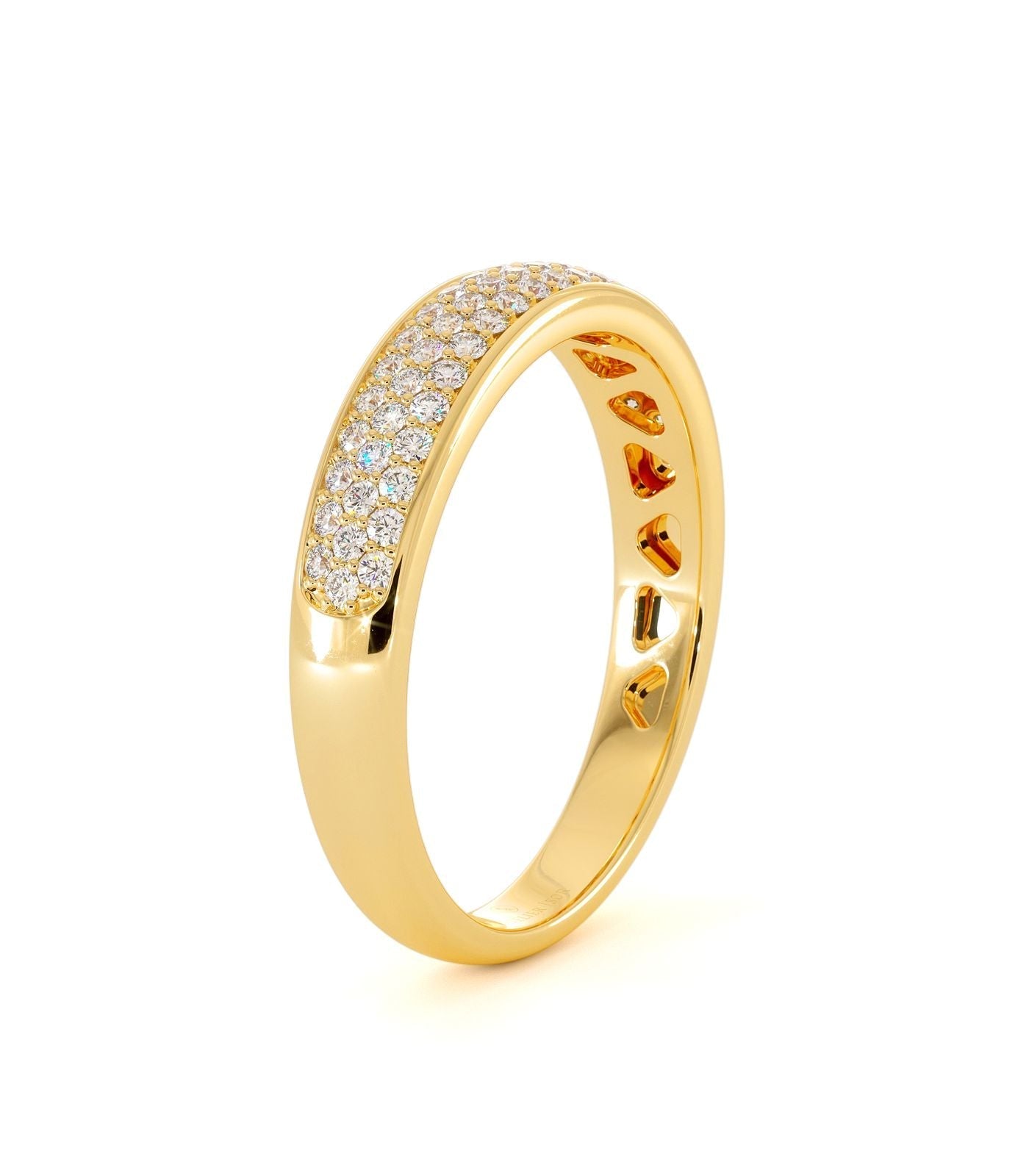 Eblouissante, l’alliance AMANDINE en or 18 carats est parsemée d’un tapis de petits diamants brillants de 0,30 poids carat total. Cette magnifique bague de mariage est le résultat d’un travail minutieux de pavage en diamants éclatants réalisée par nos experts. L’alliance AMANDINE épouse parfaitement le solitaire TIAMA, un solitaire aux finitions lisses et élégantes. Vous pouvez également vous laissez séduire par une bague de fiançailles unique réalisée sur-mesure pour épouser cette bague de mariage. Comme tous nos bijoux alliant l’or et le diamant, la bague de mariage AMANDINE existe en or jaune, en or blanc et en or rose.