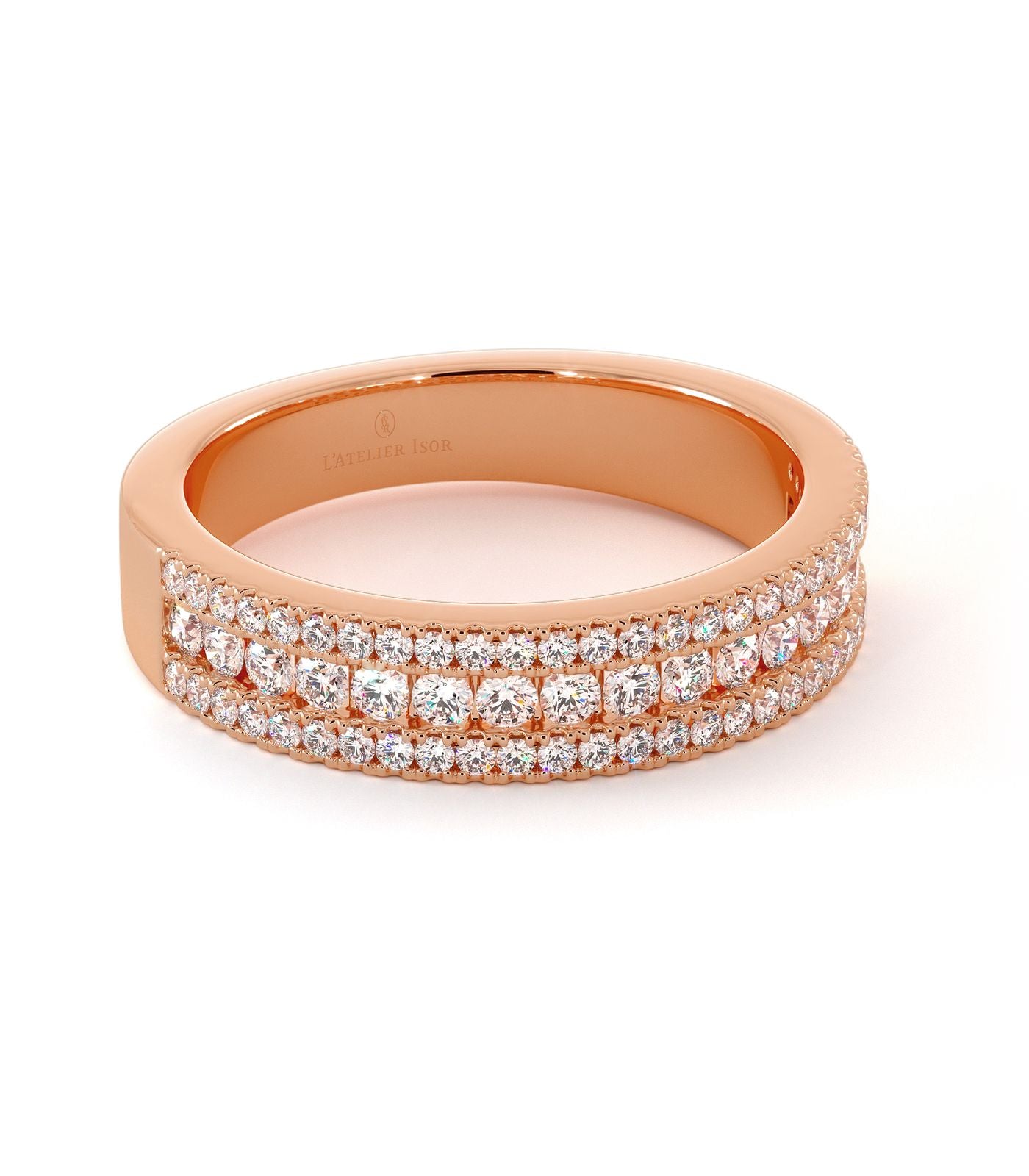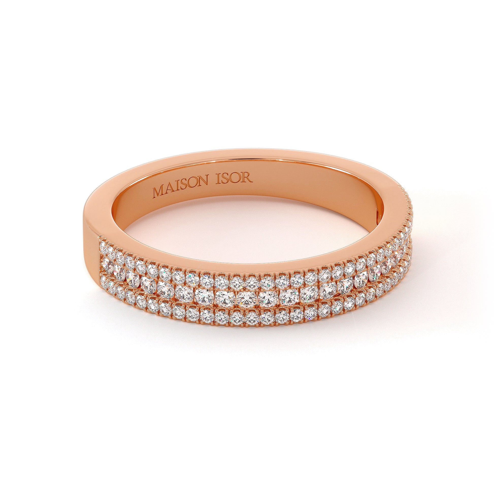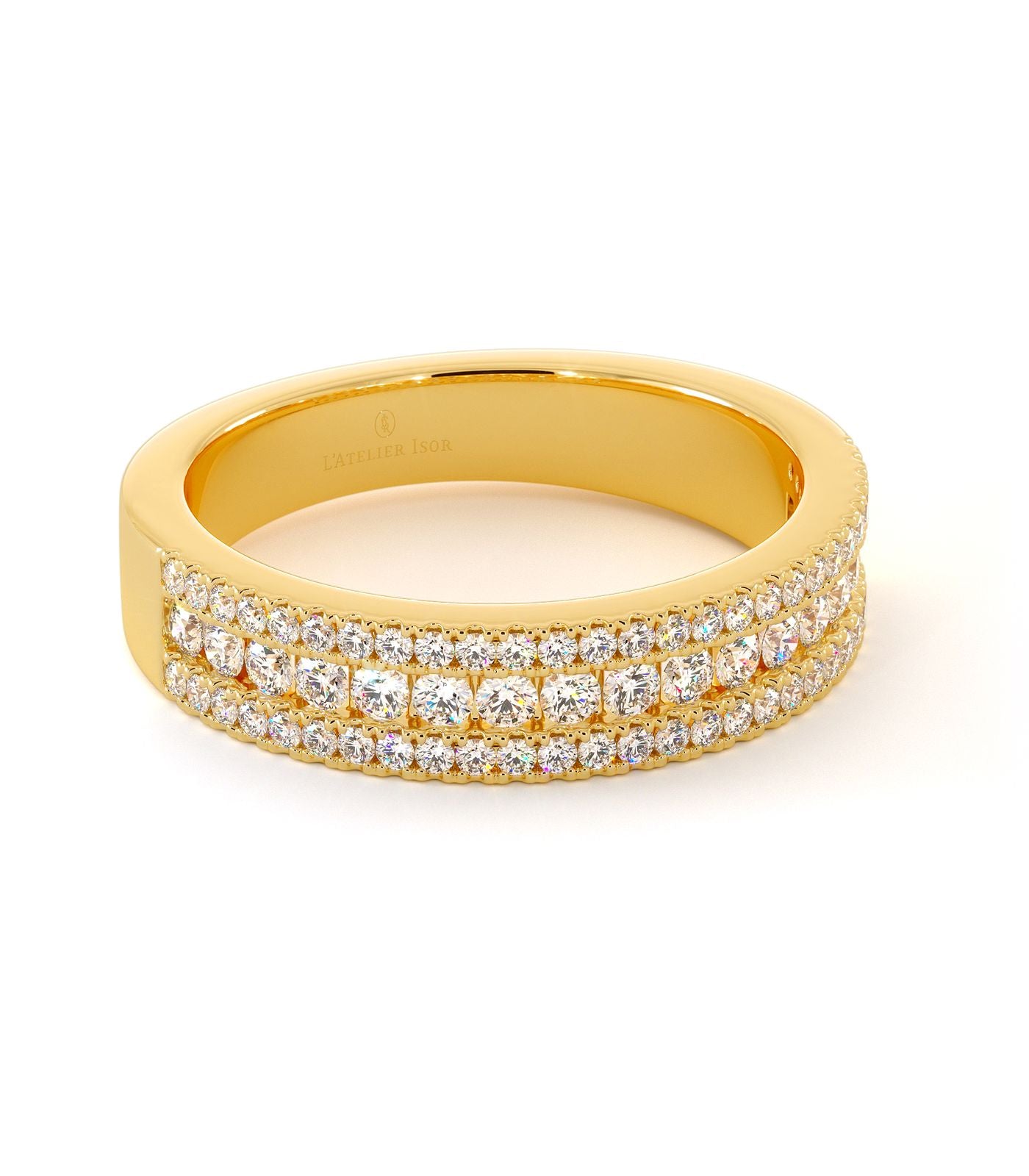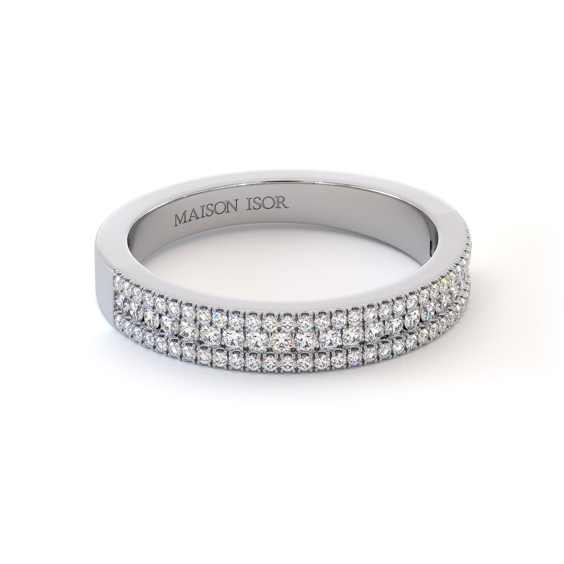 Alliance Hirado en or 750/1000, pavée de diamants taille brillant, sertie sur trois rangées. Elle se distingue par son éclat et son équilibre parfait. Disponible en deux versions : 0,33 ct et 0,55 ct.