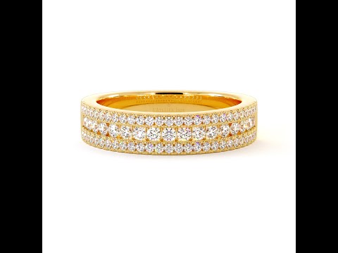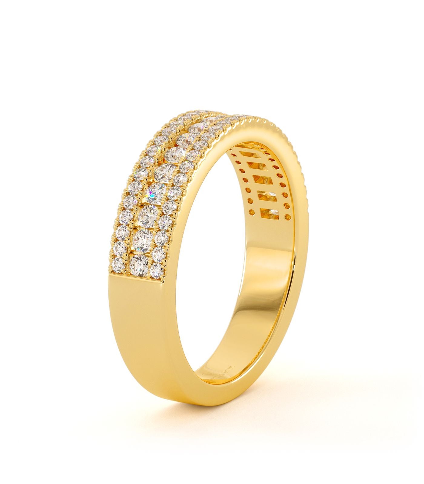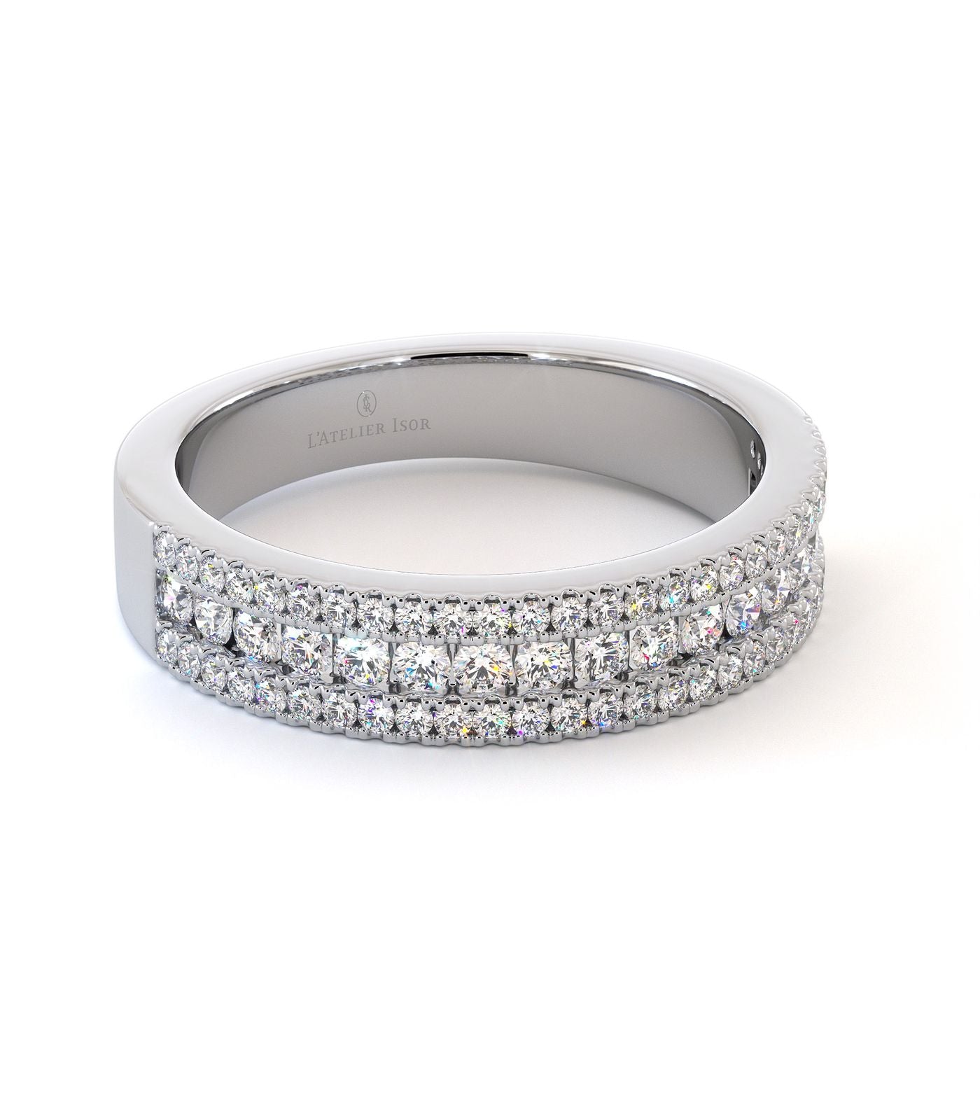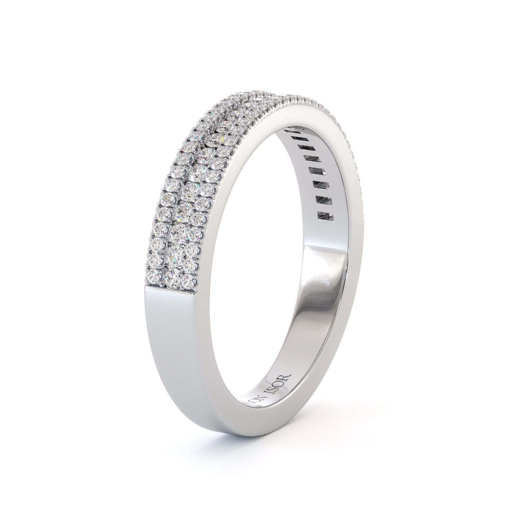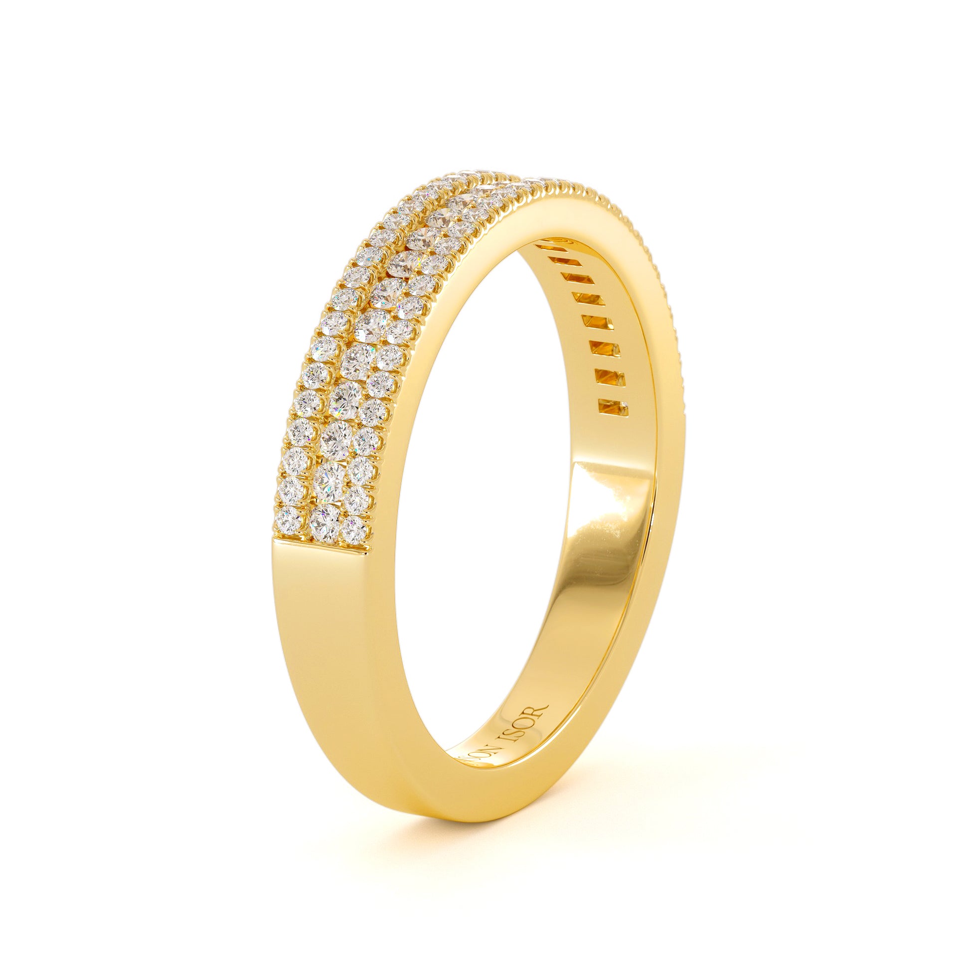Alliance Hirado en or 750/1000, pavée de diamants taille brillant, sertie sur trois rangées. Elle se distingue par son éclat et son équilibre parfait. Disponible en deux versions : 0,33 ct et 0,55 ct.