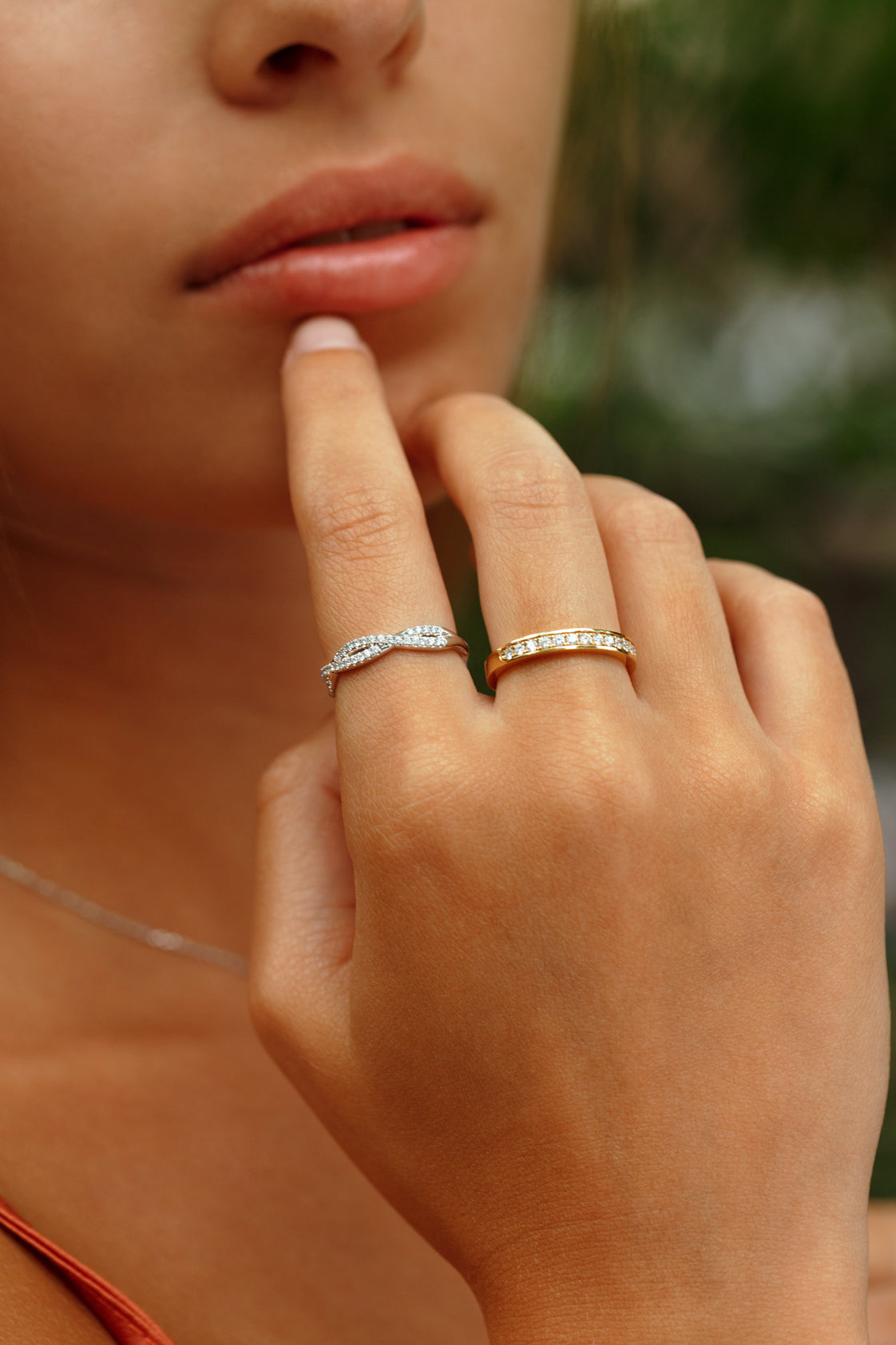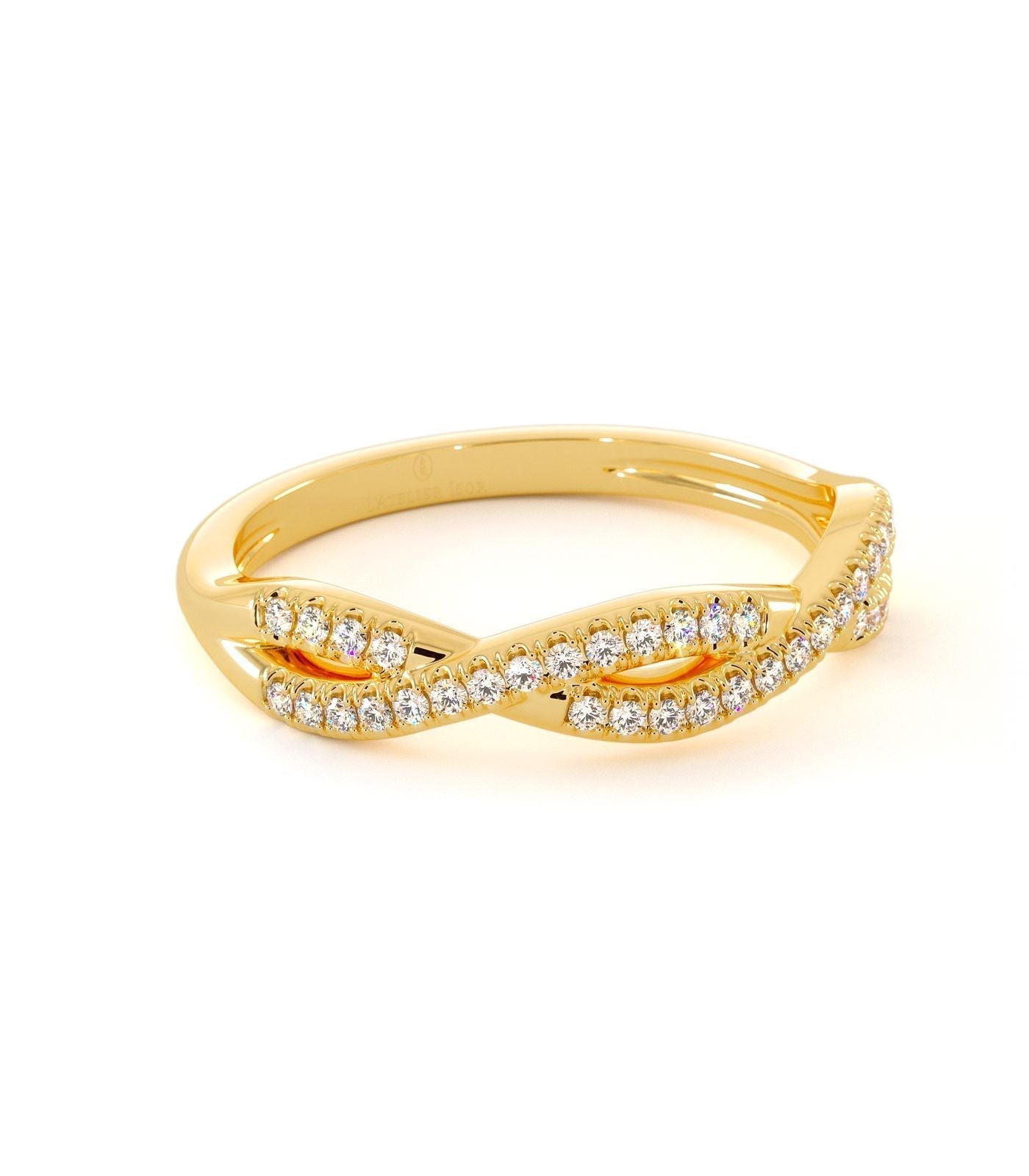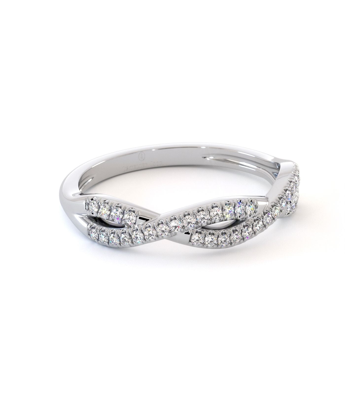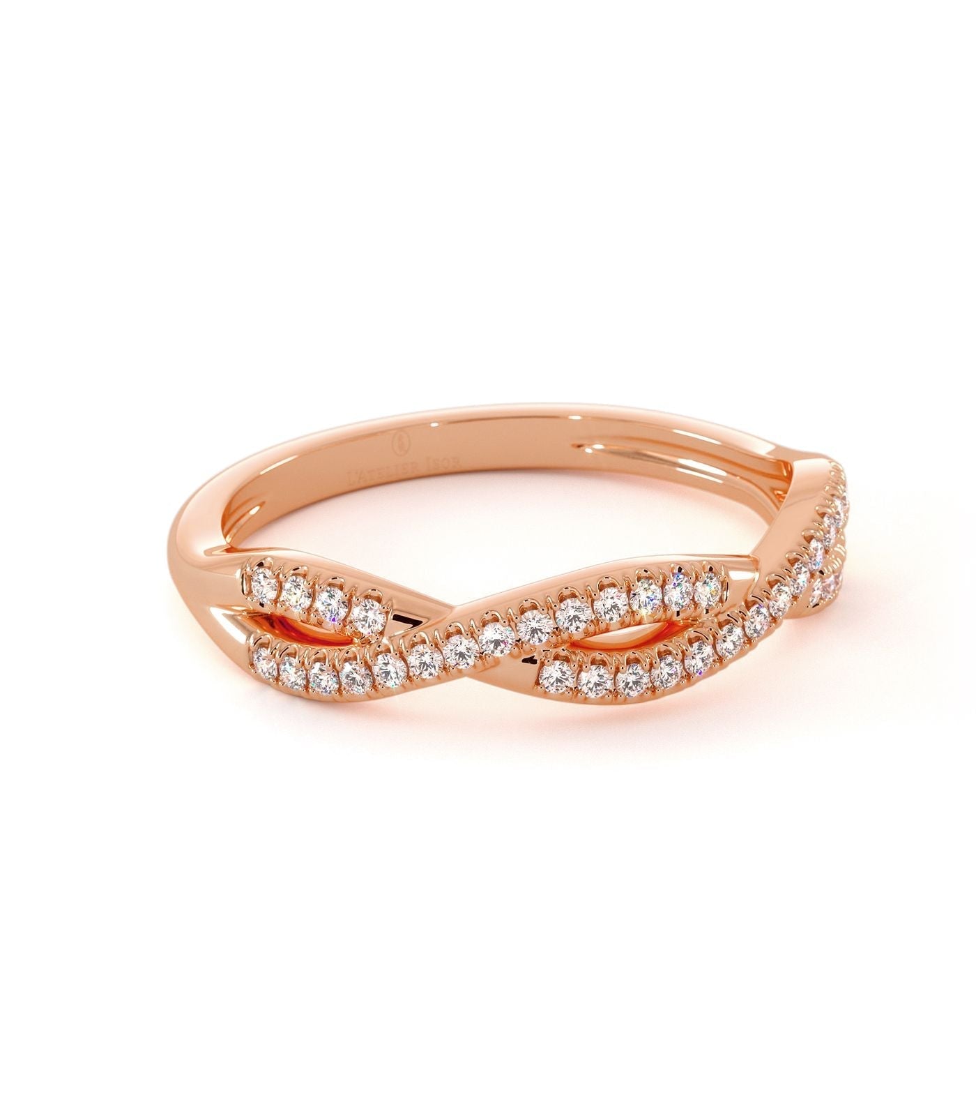 Alliance Java en or 750/1000, tour complet, composée de deux anneaux torsadés pavés de diamants taille brillant.Un design sculptural et moderne, alliant originalité et éclat. Poids total diamant : 0,20 ct.