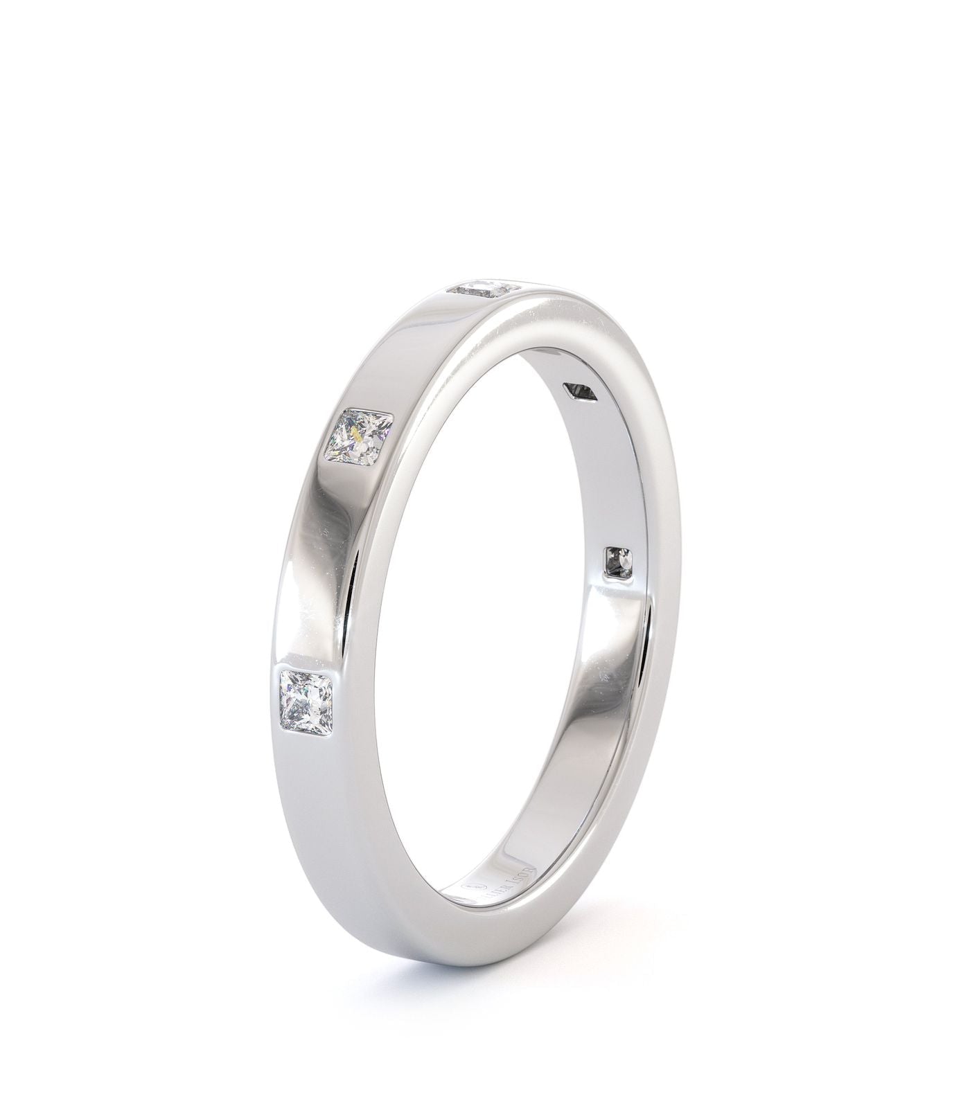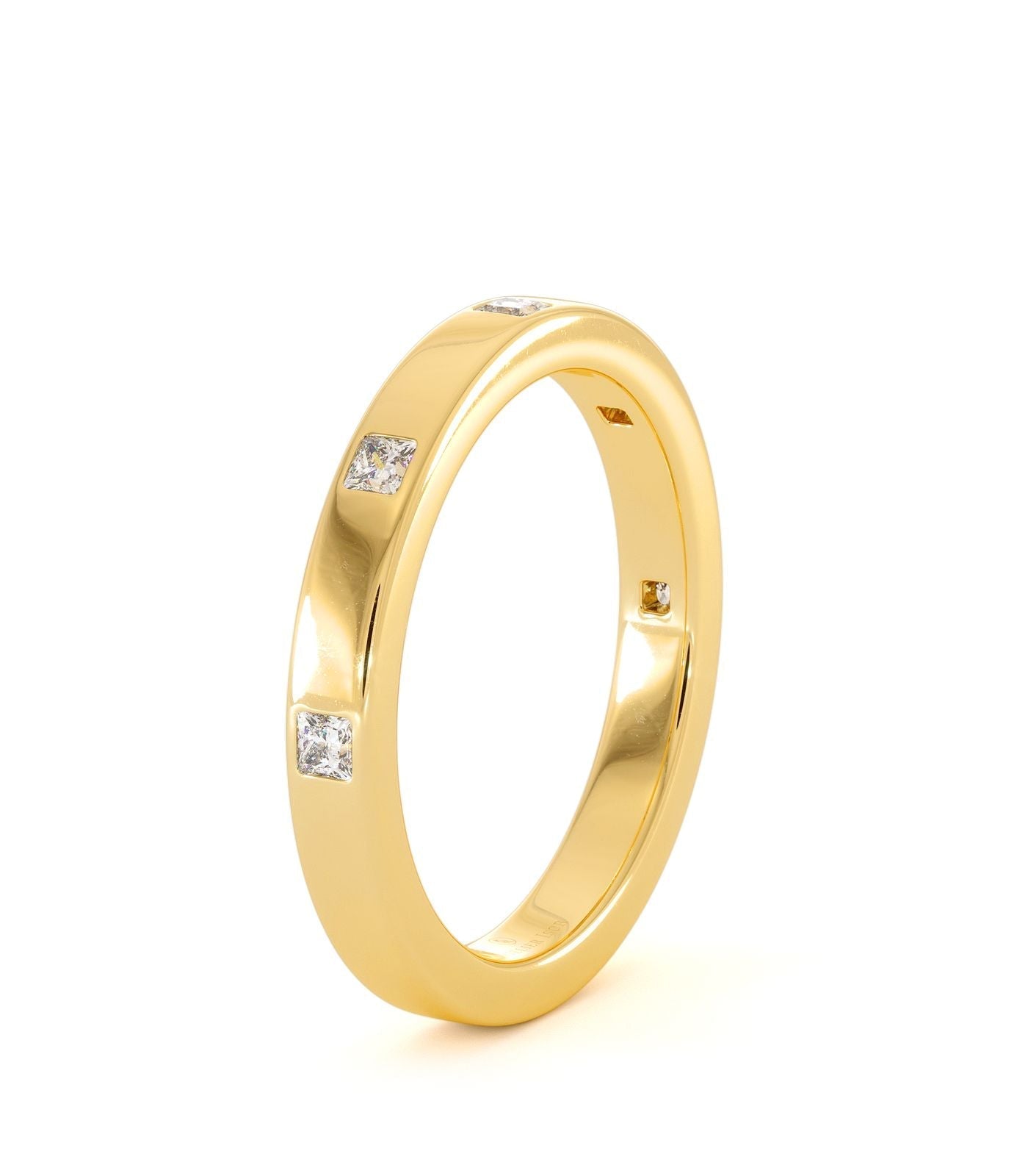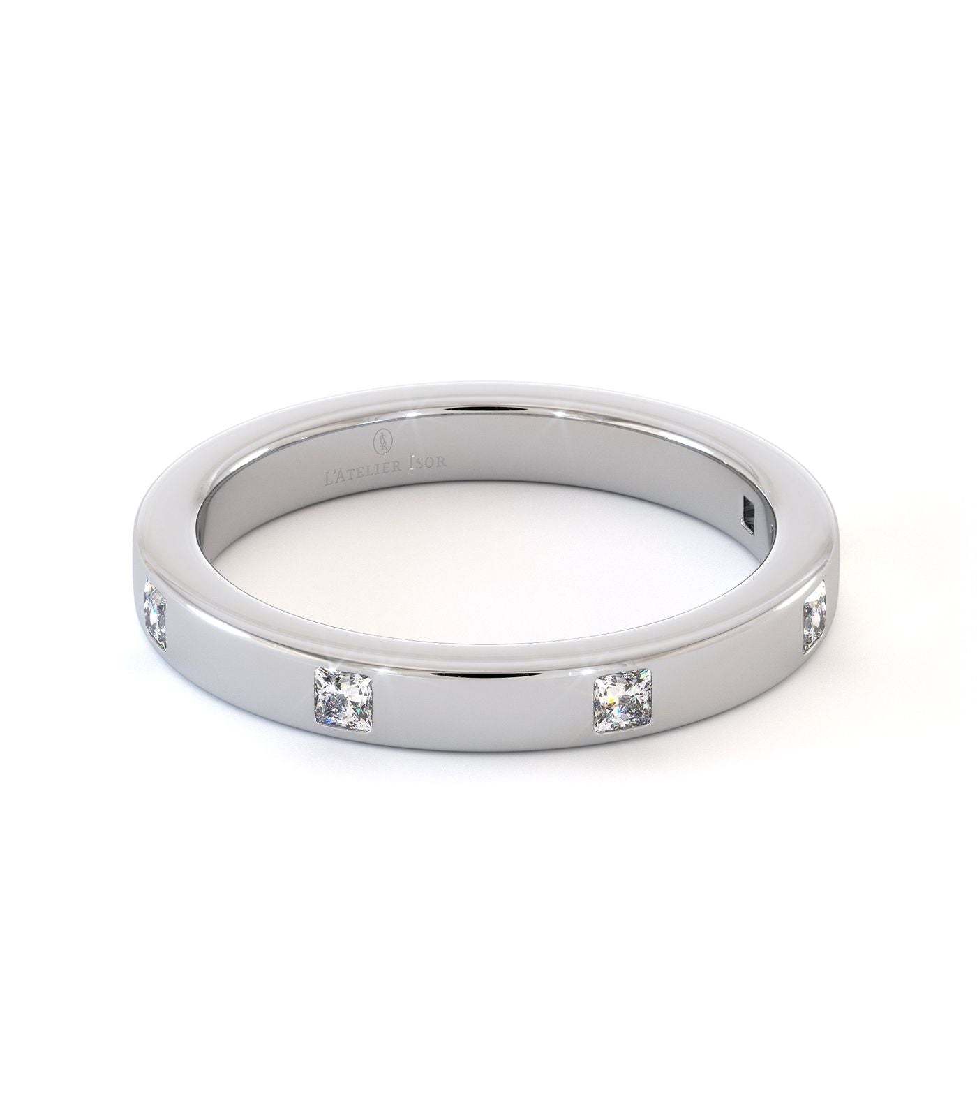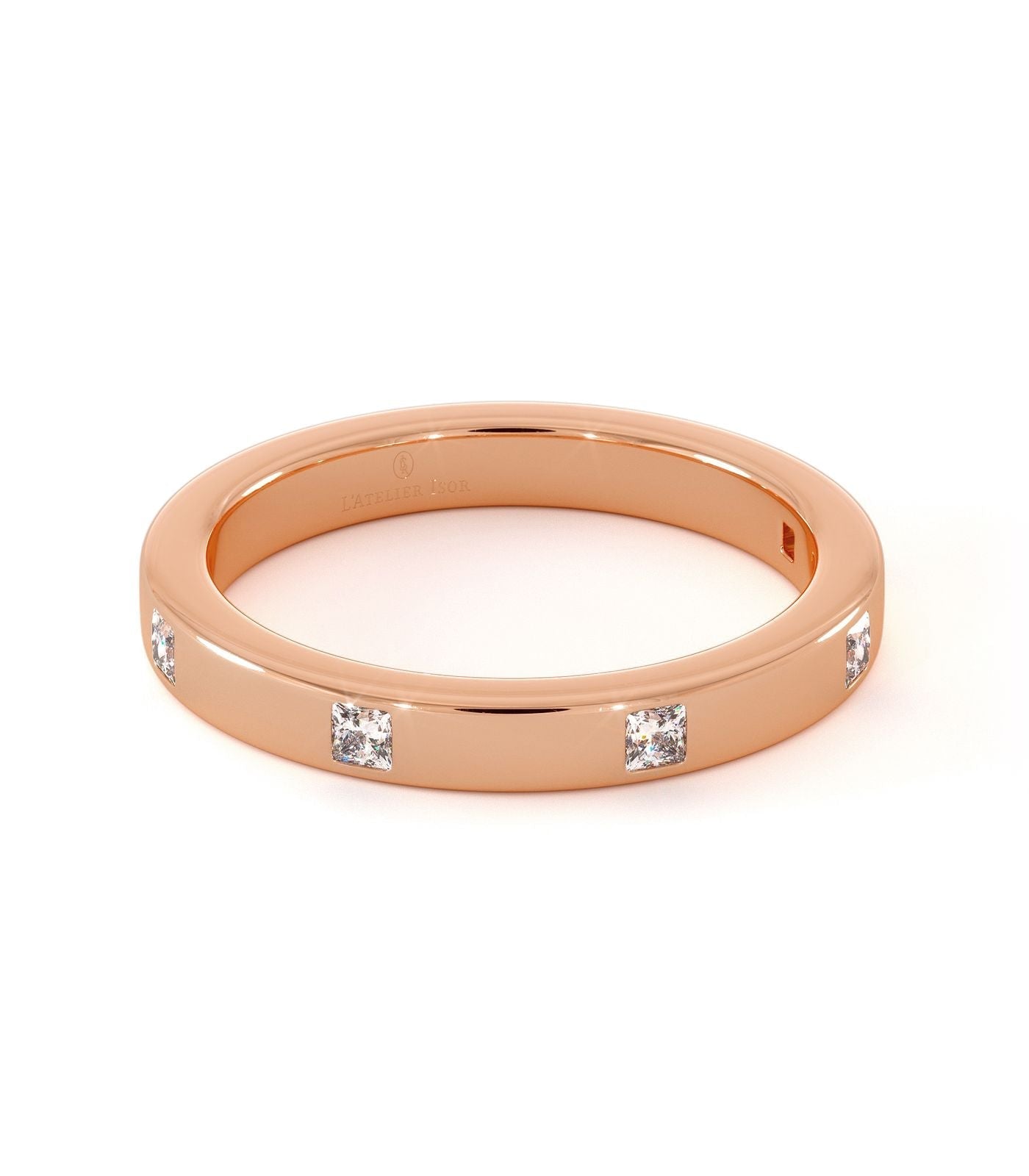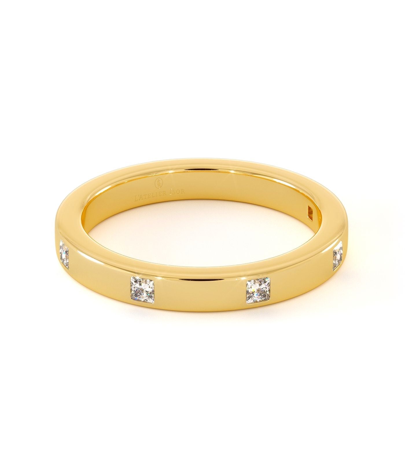 Alliance Malta en or 750/1000, sertie de cinq diamants taille princesse. Un design épuré et lumineux, parfait pour un porté quotidien.