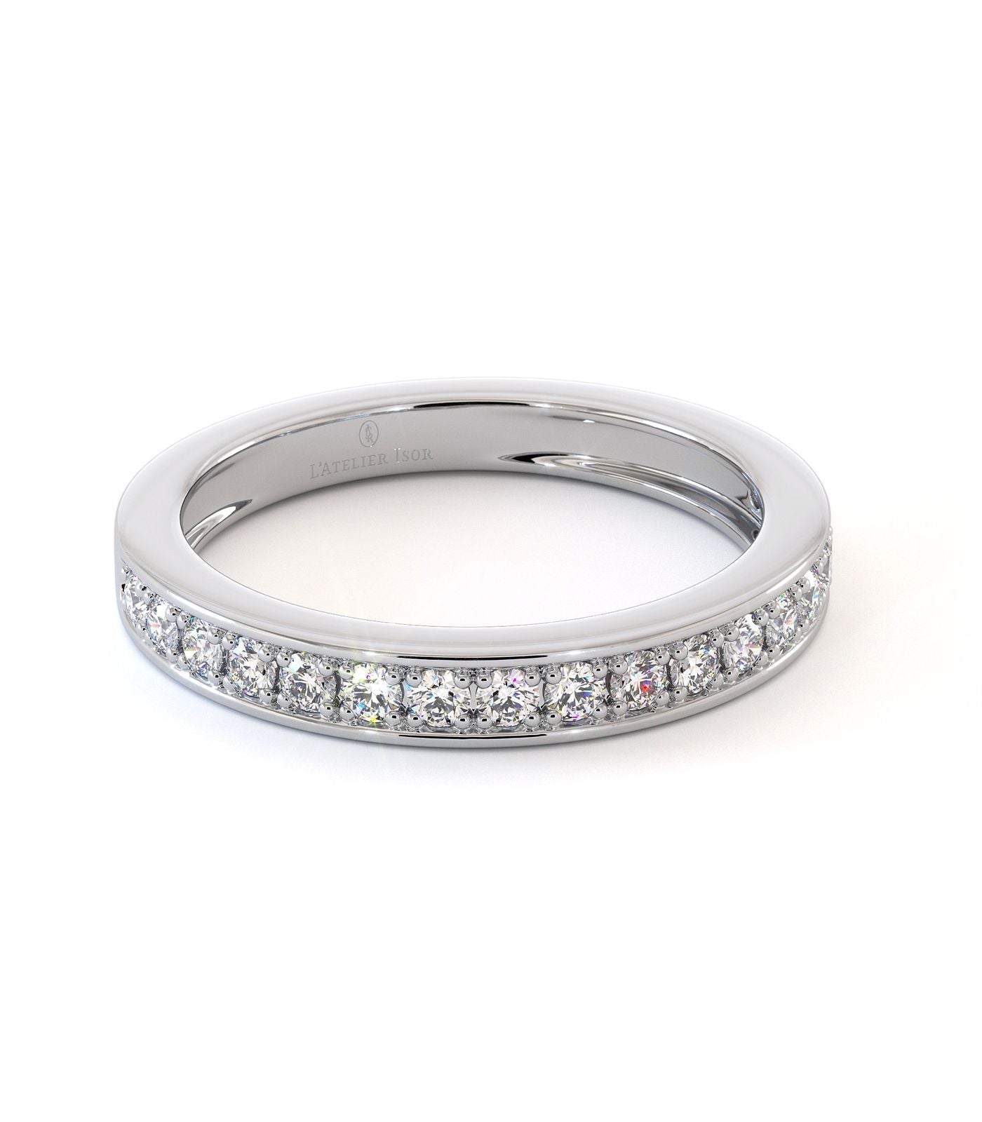 Alliance Mira en or 750/1000, sertie grain de diamants taille brillant. Un style raffiné et équilibré, idéal avec le solitaire Sisley. Poids total diamant : 0,20 à 0,40 ct.