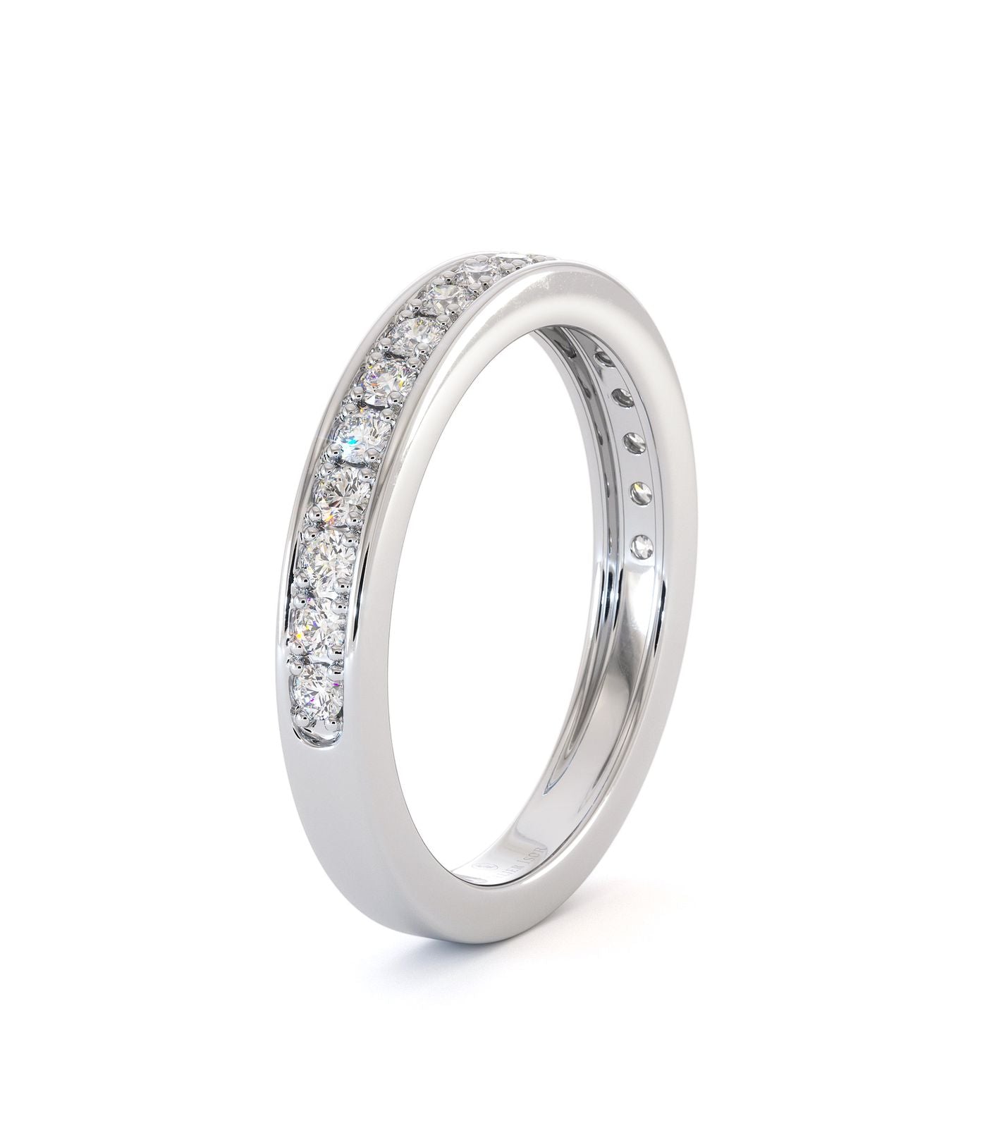 L’alliance MIRA en or 18 carats est sertie grain par de petits diamants méticuleusement disposés pour un effet lumineux intense. Allant de 0,20 à 0,40 poids carat total, l’alliance MIRA, par sa régularité géométrique, se distingue par son style sophistiqué et élégant. Cette bague de mariage se porte à merveille avec le solitaire SISLEY.