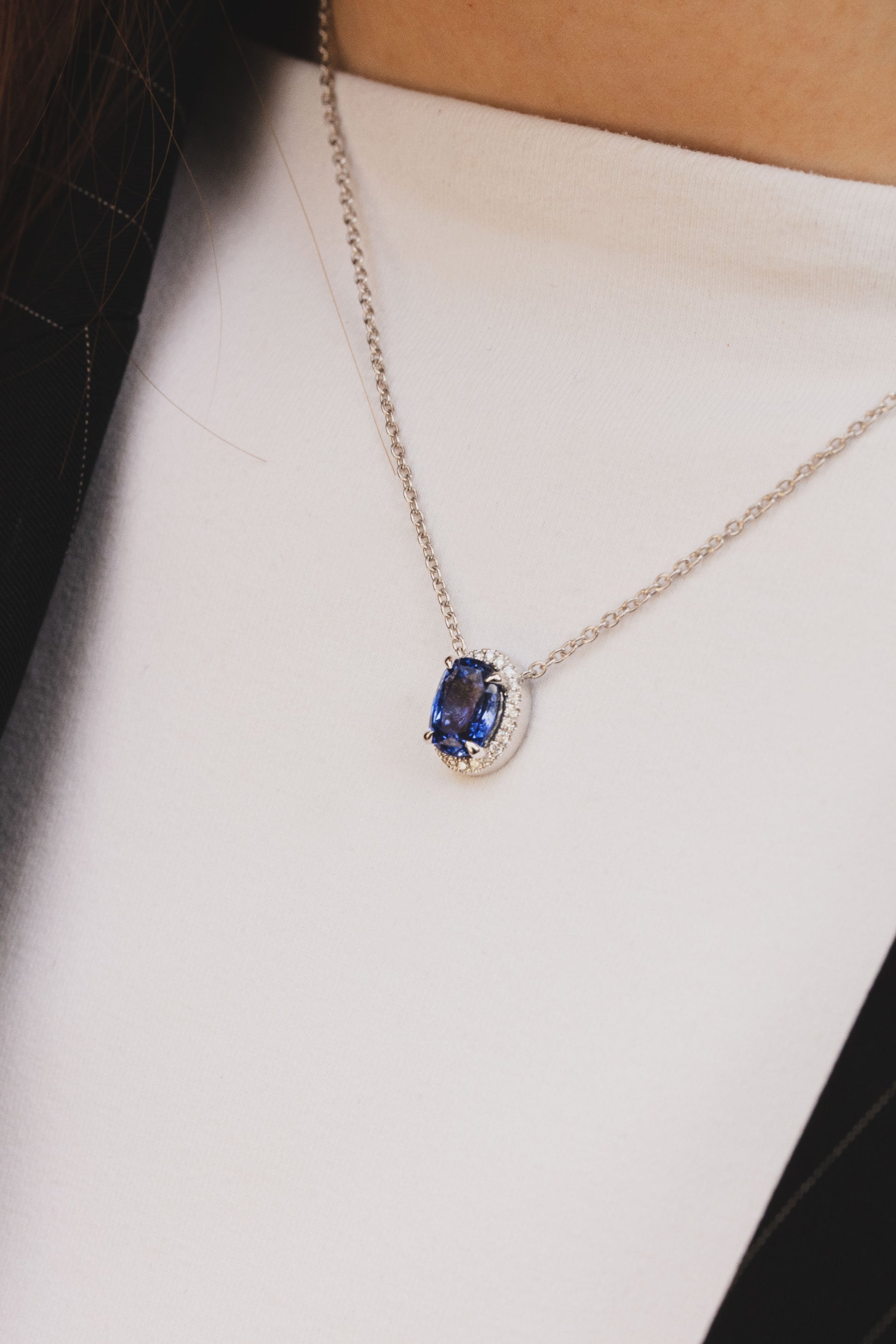 Collier en or blanc avec un saphir ovale bleu profond entouré de diamants étincelants. Pièce unique en édition limitée, possibilité de création sur mesure si rupture de stock.