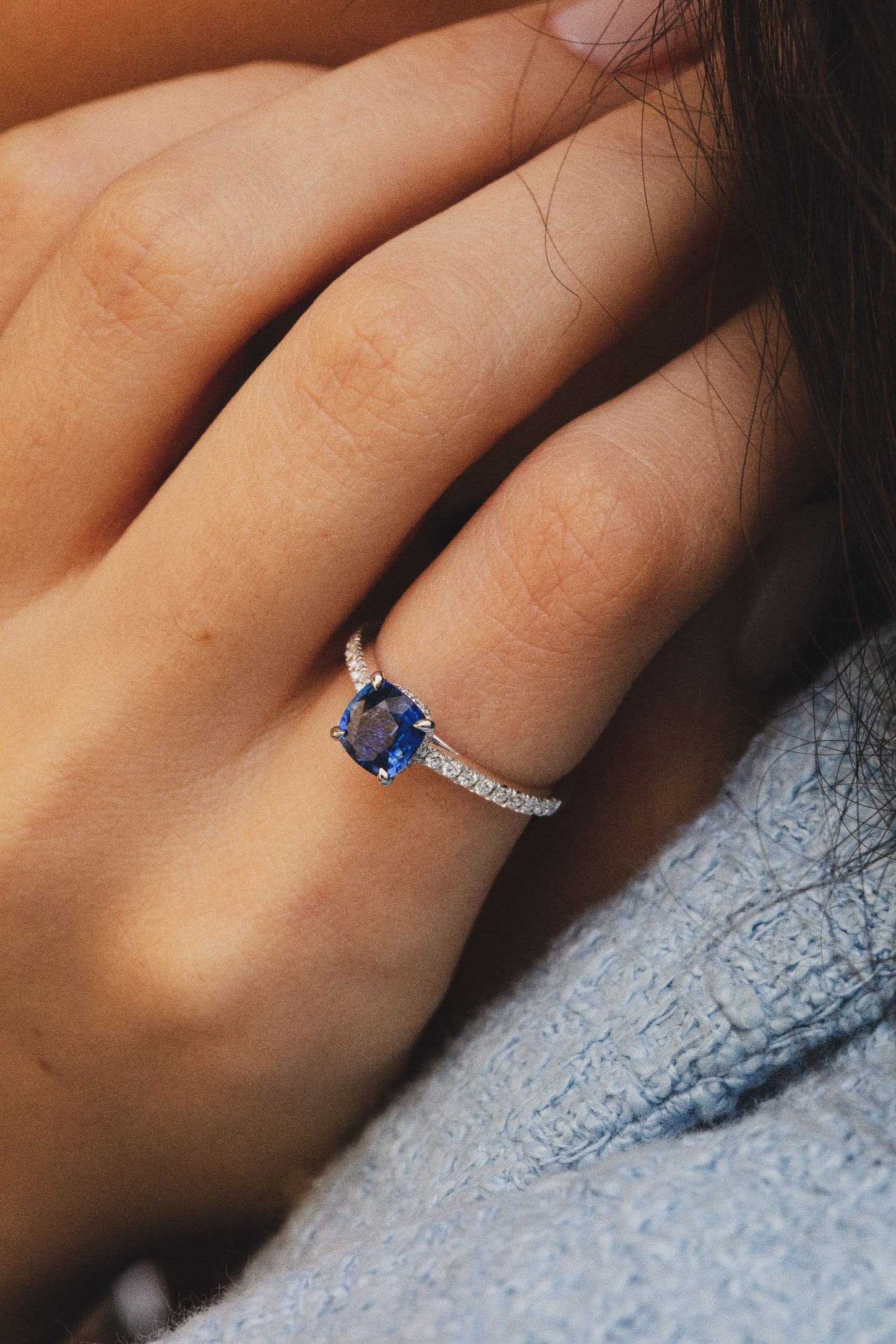 Cette bague met en valeur un saphir de forme coussin, entouré d'une ceinture sertie de diamants étincelants. La ceinture sertie ajoute une touche de sophistication et crée un contraste élégant avec le saphir central. Cette bague en saphir et diamants est un bijou d'une beauté exquise, combinant la splendeur intemporelle du saphir avec l'éclat des diamants, pour un résultat à la fois classique et contemporain.