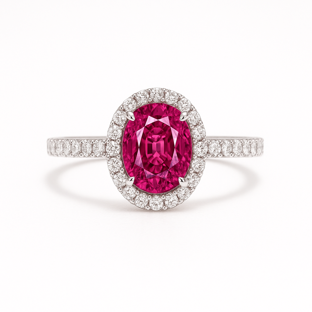 Cette bague en or blanc 18 carats met en valeur un saphir rose ovale, entouré d’un halo de diamants étincelants.
