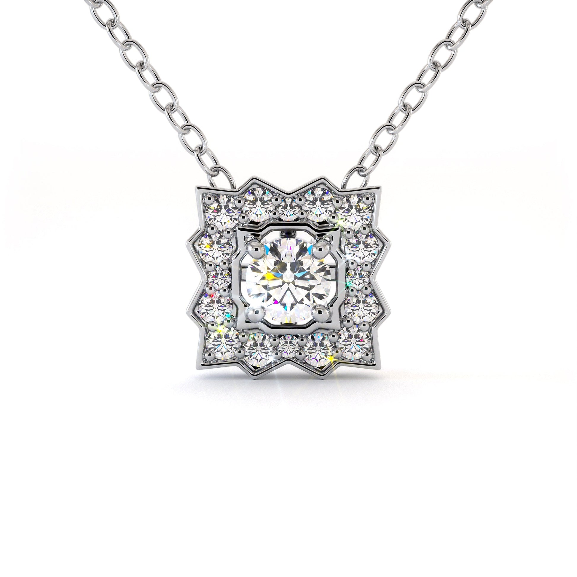 Le collier MARTA est une pièce exceptionnelle qui marie l'éclat pur d'un diamant central de 0.25 Carats à un halo scintillant évoquant une étoilé. La monture délicate ajoute une touche d'élégance, faisant de ce collier un bijou intemporel, un hommage à la grâce et à la sophistication.