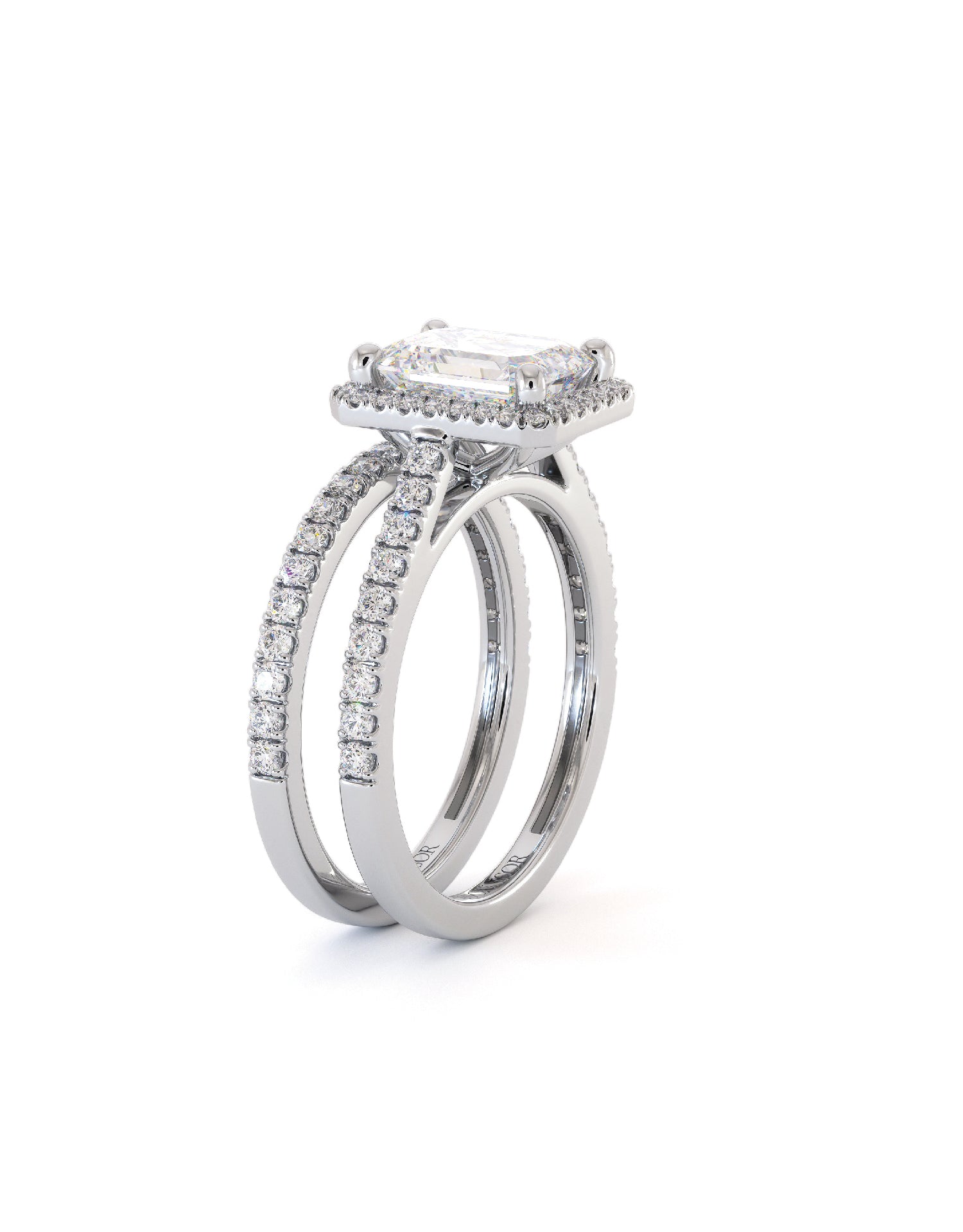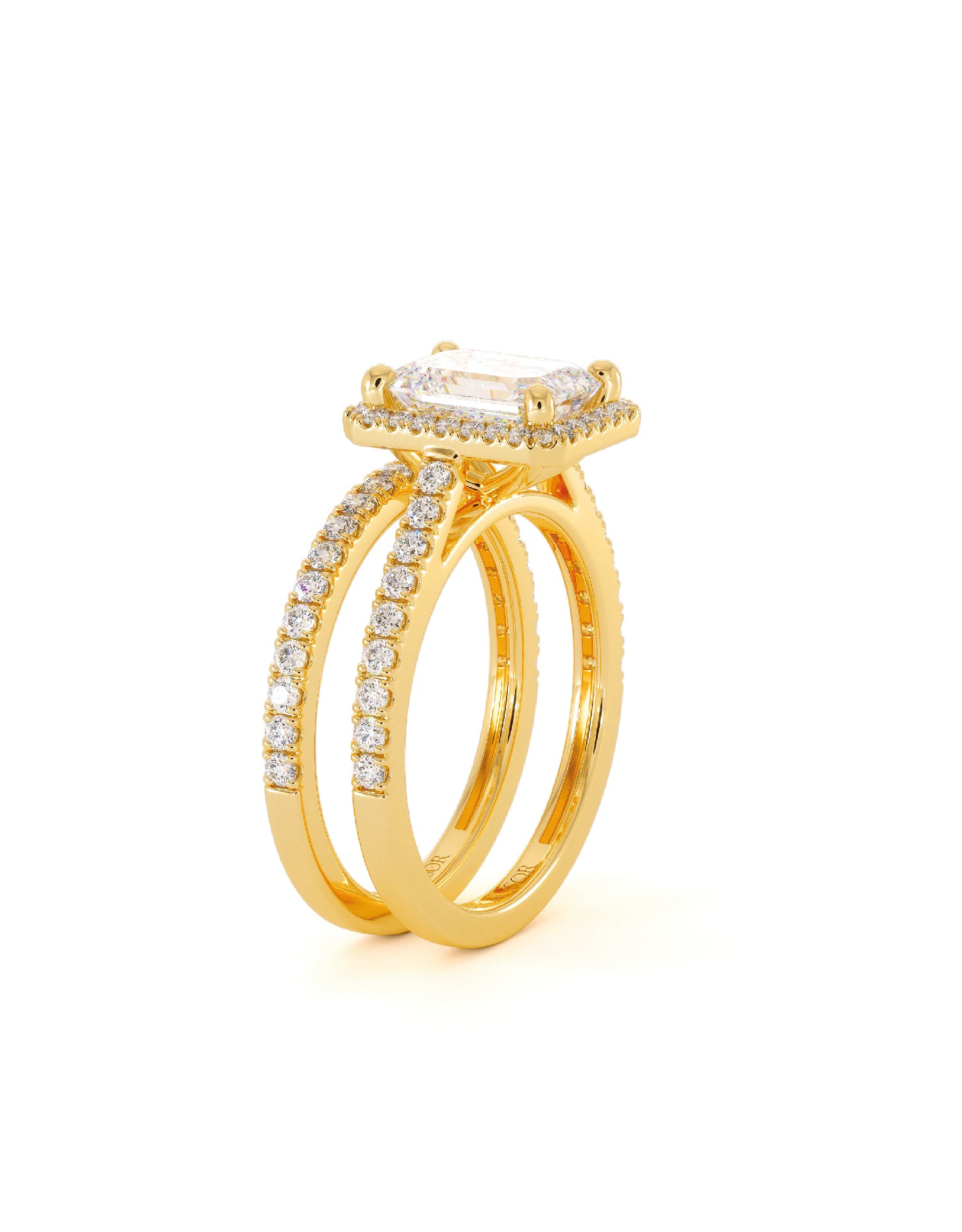 Duo en or 18 carats composé d’une bague de fiançailles sertie d’un oxyde de zirconium taille émeraude, sublimé par un halo pavé de pierres scintillantes, et d’une alliance assortie entièrement sertie de brillants. Un duo éclatant au caractère affirmé.