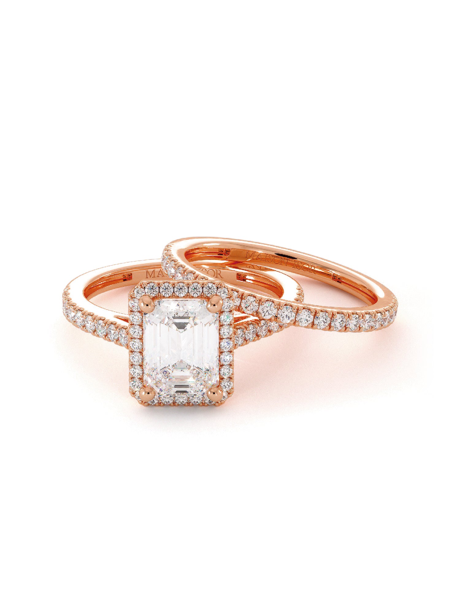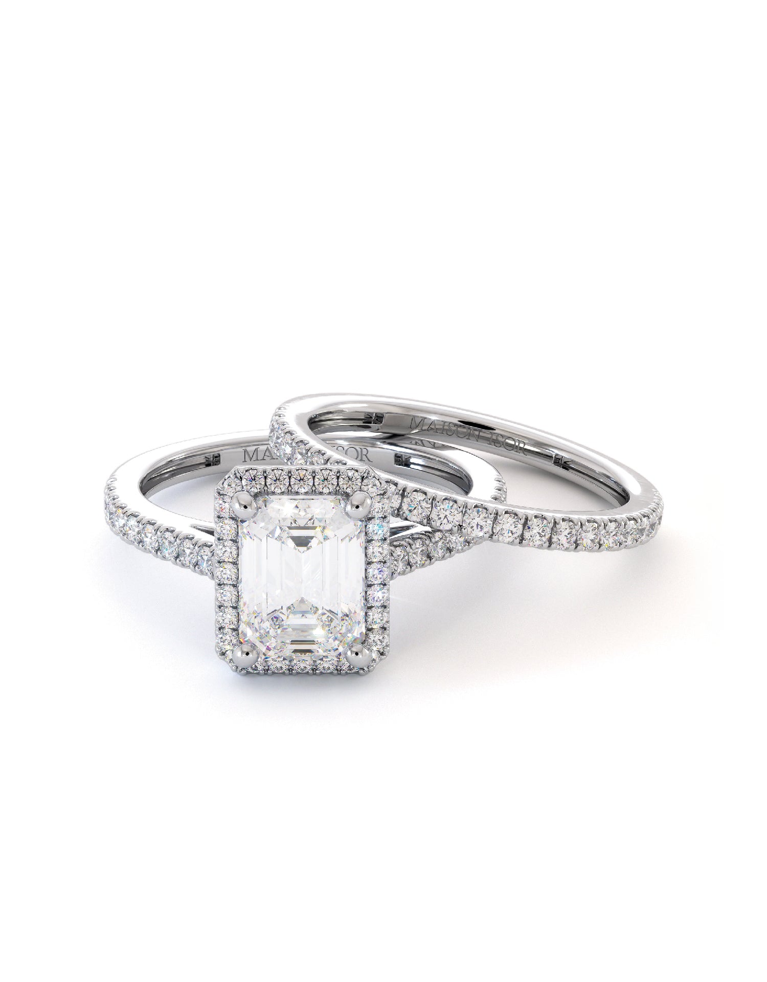 Duo en or 18 carats composé d’une bague de fiançailles sertie d’un oxyde de zirconium taille émeraude, sublimé par un halo pavé de pierres scintillantes, et d’une alliance assortie entièrement sertie de brillants. Un duo éclatant au caractère affirmé.
