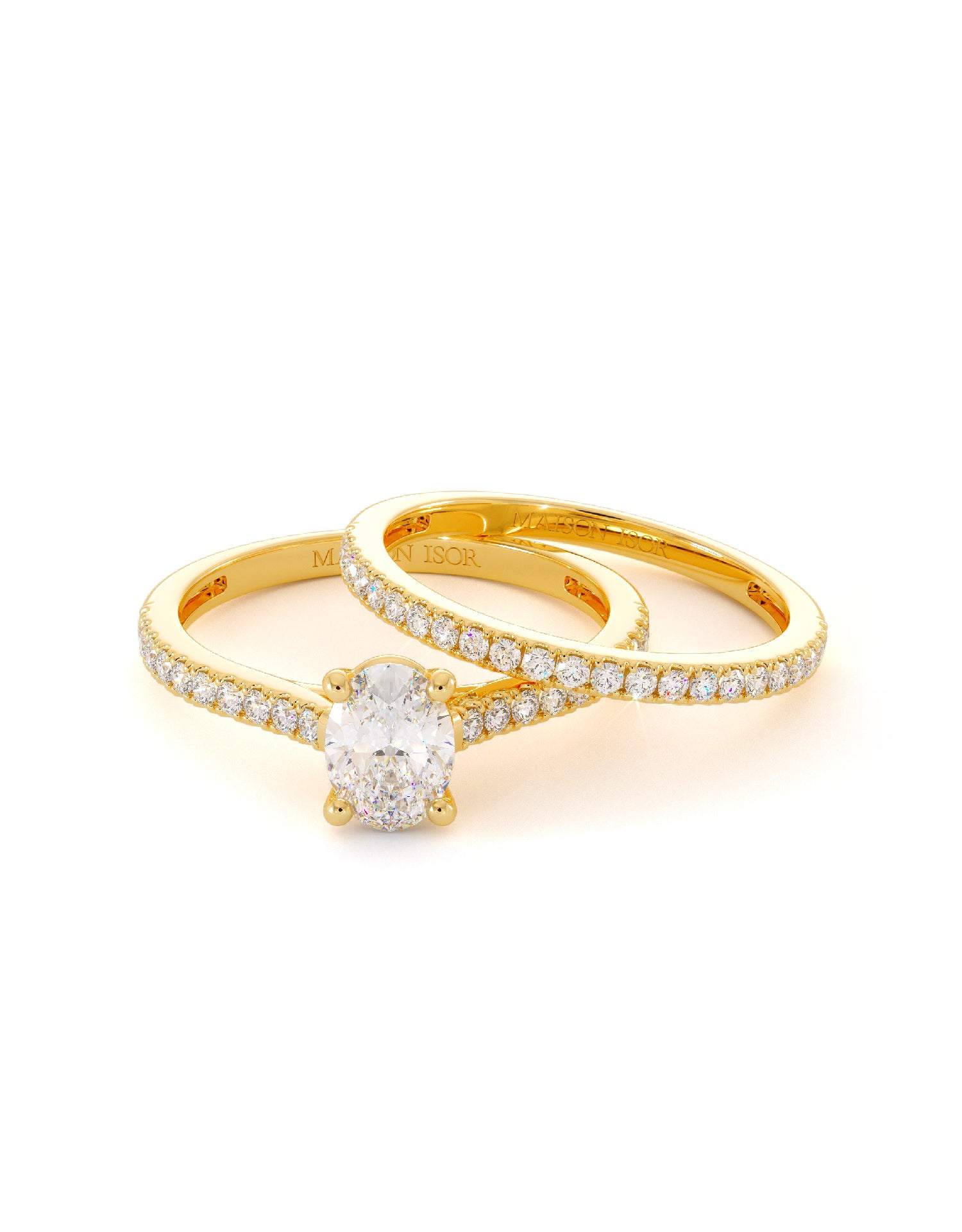 Duo en or 18 carats composé d’une bague de fiançailles sertie d’un oxyde de zirconium taille ovale à quatre griffes et d’une alliance assortie pavée de pierres scintillantes. Un duo raffiné pour symboliser l’éclat de l’union éternelle.