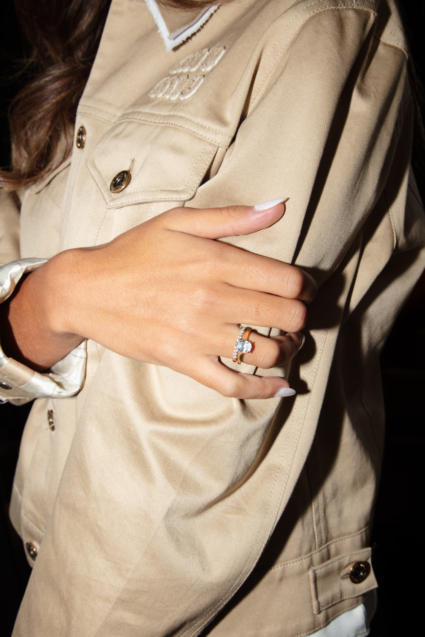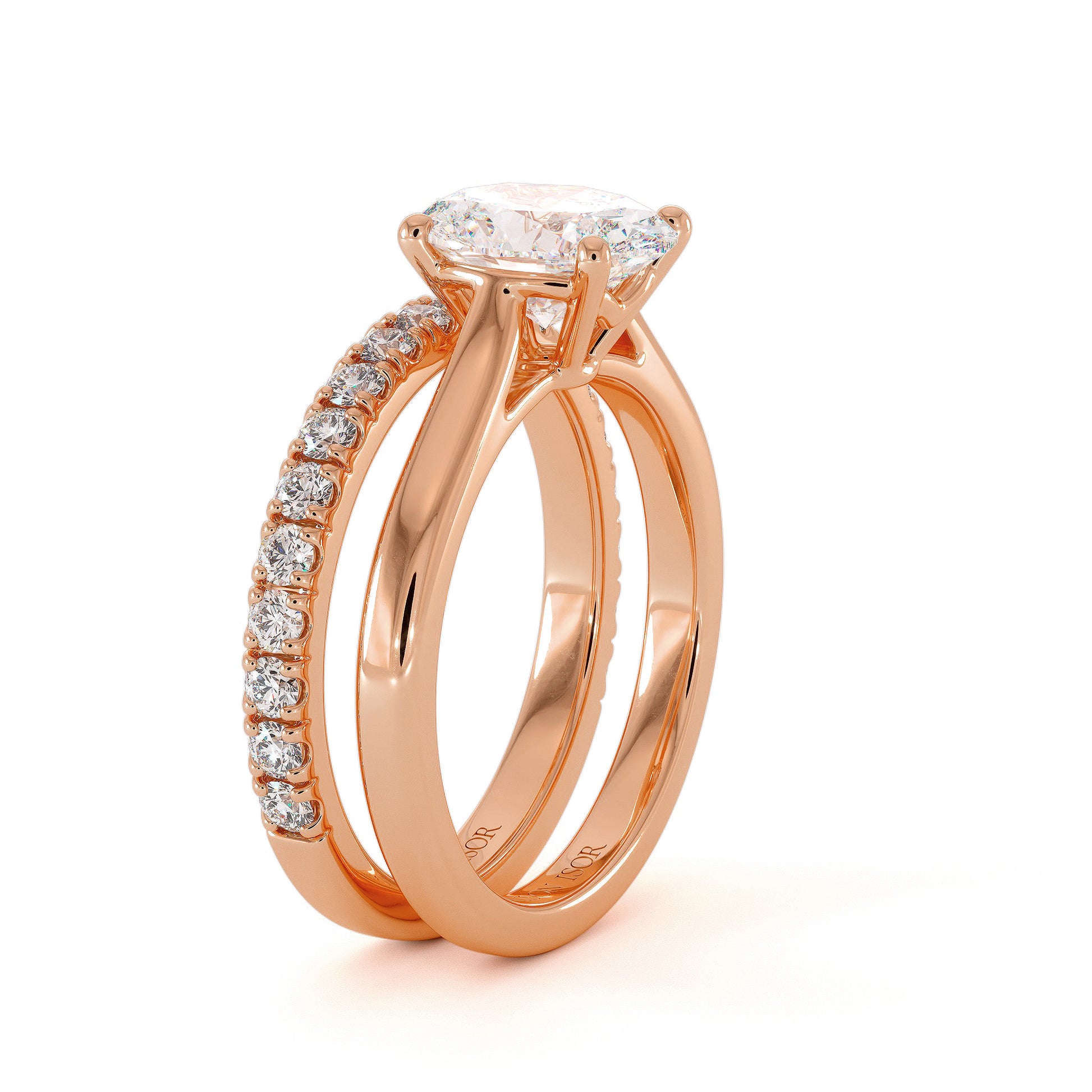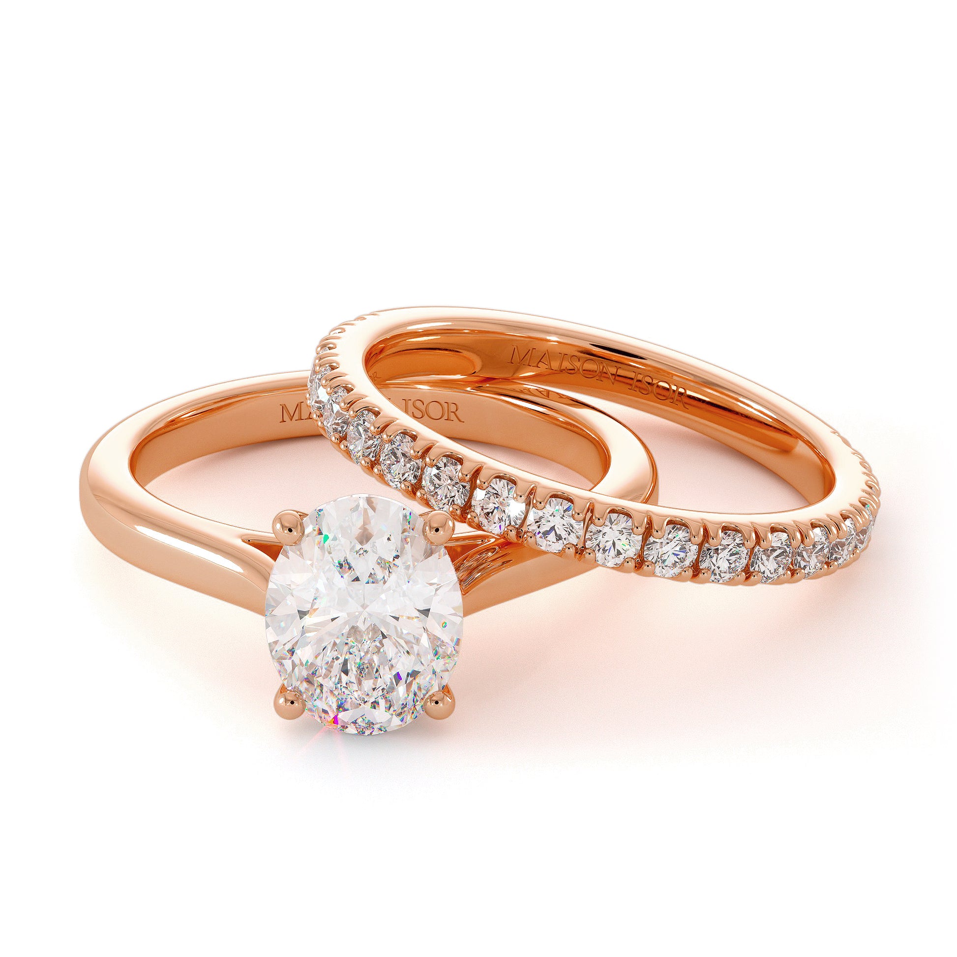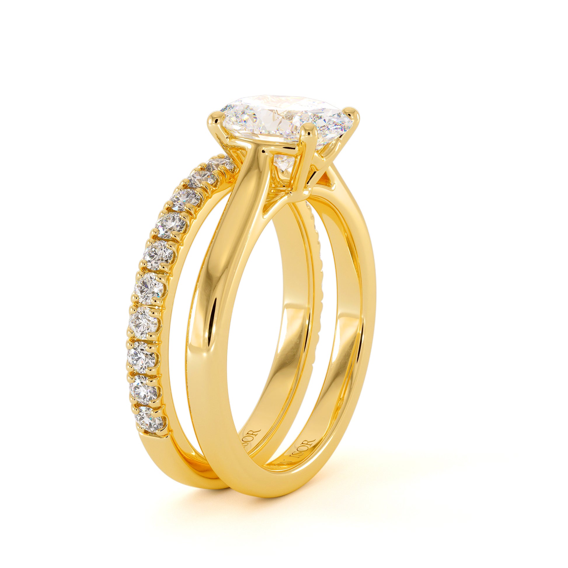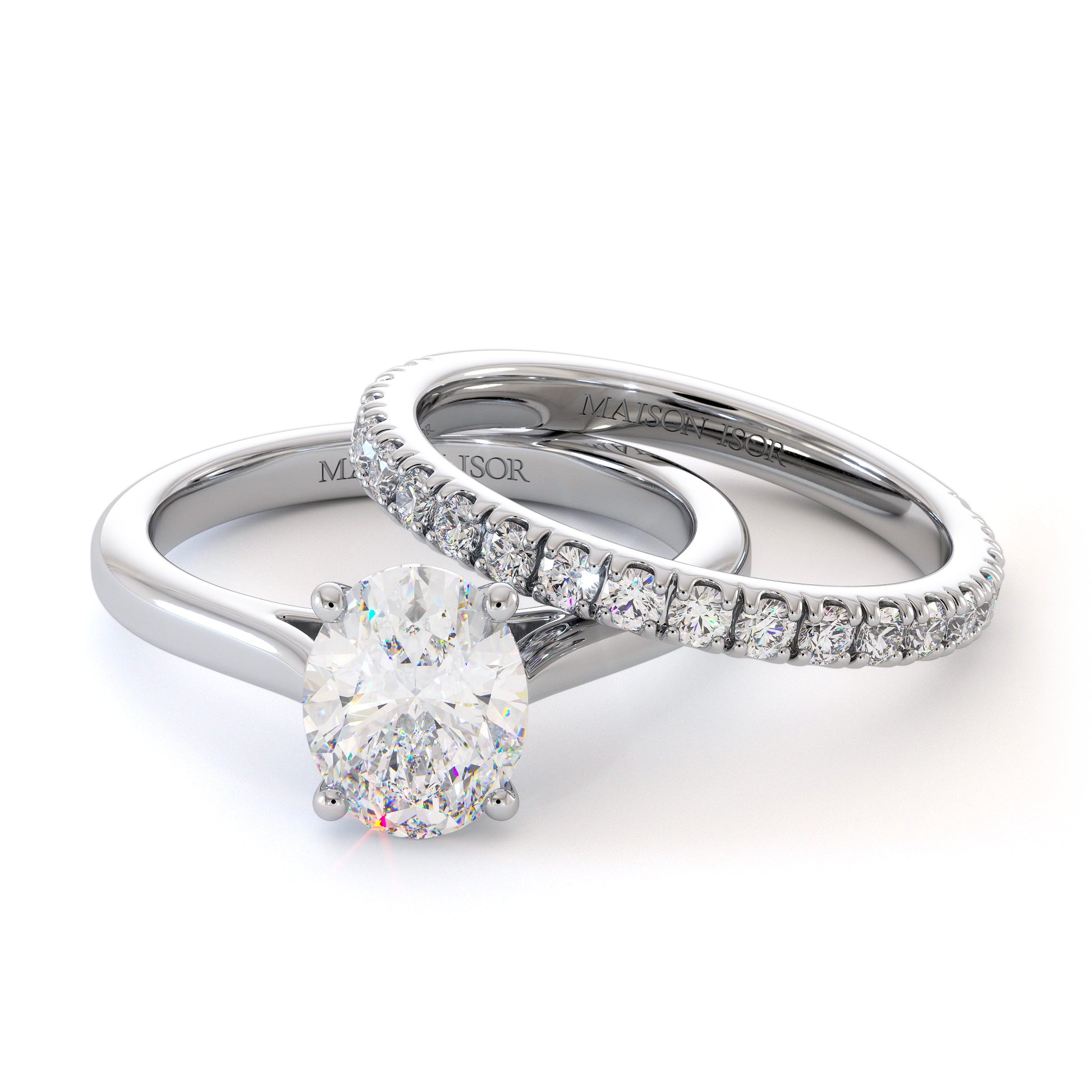 Duo en or 18 carats composé d’un solitaire classique serti d’un oxyde de zirconium taille ovale et d’une alliance assortie pavée de pierres scintillantes.