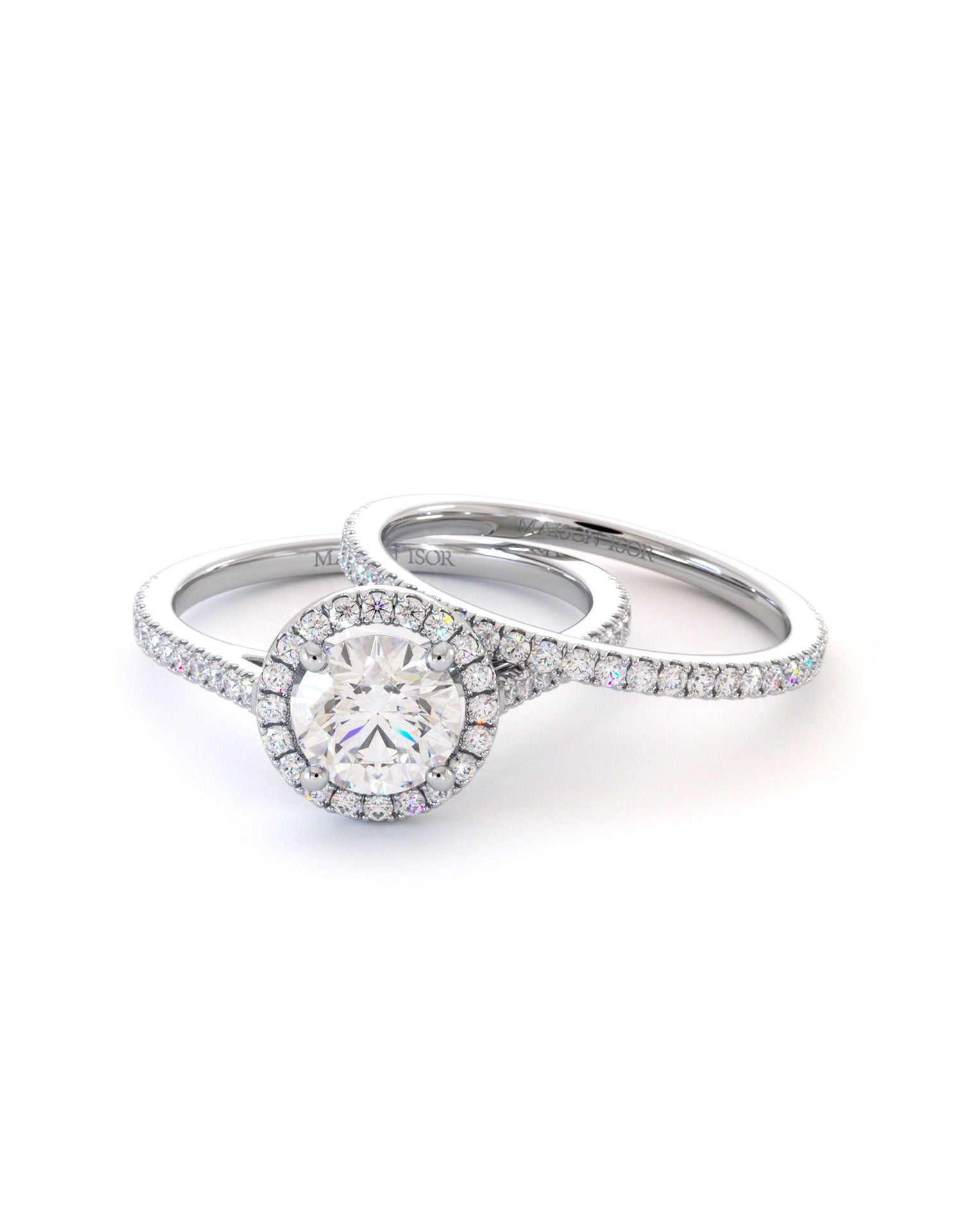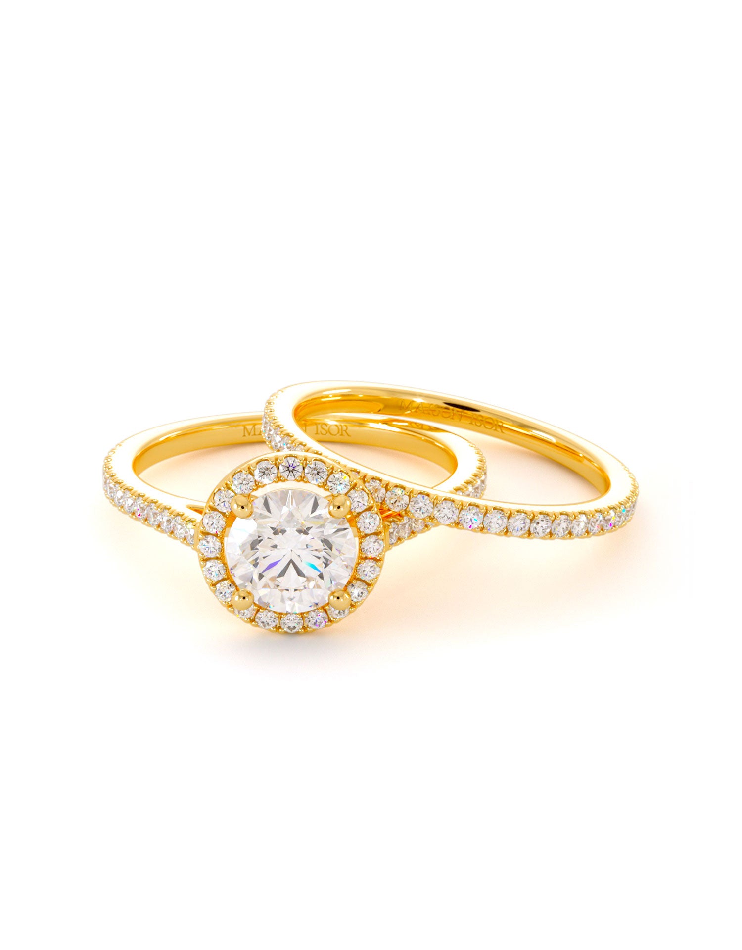 Duo en or 18 carats composé d’une bague de fiançailles sertie d’un oxyde de zirconium rond taille brillant, entouré d’un halo pavé de pierres scintillantes, et d’une alliance classique entièrement sertie de brillants. Un duo raffiné au charme intemporel.