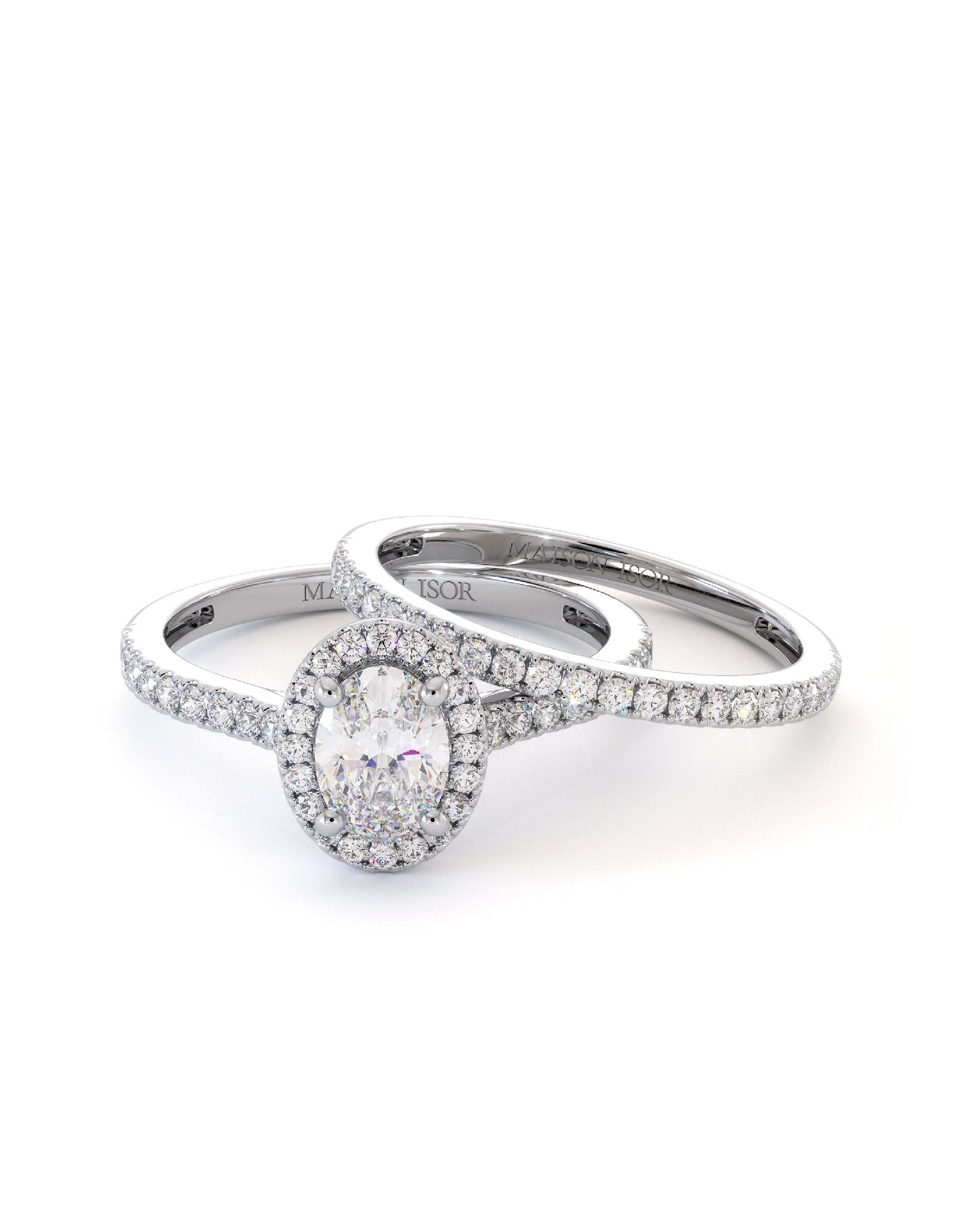 Duo en or 18 carats composé d’une bague de fiançailles sertie d’un oxyde de zirconium taille ovale, entourée d’un halo pavé de pierres, et d’une alliance assortie entièrement pavée. Une création lumineuse et raffinée.