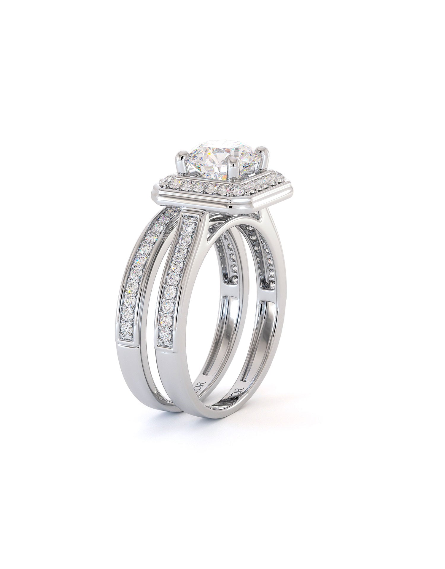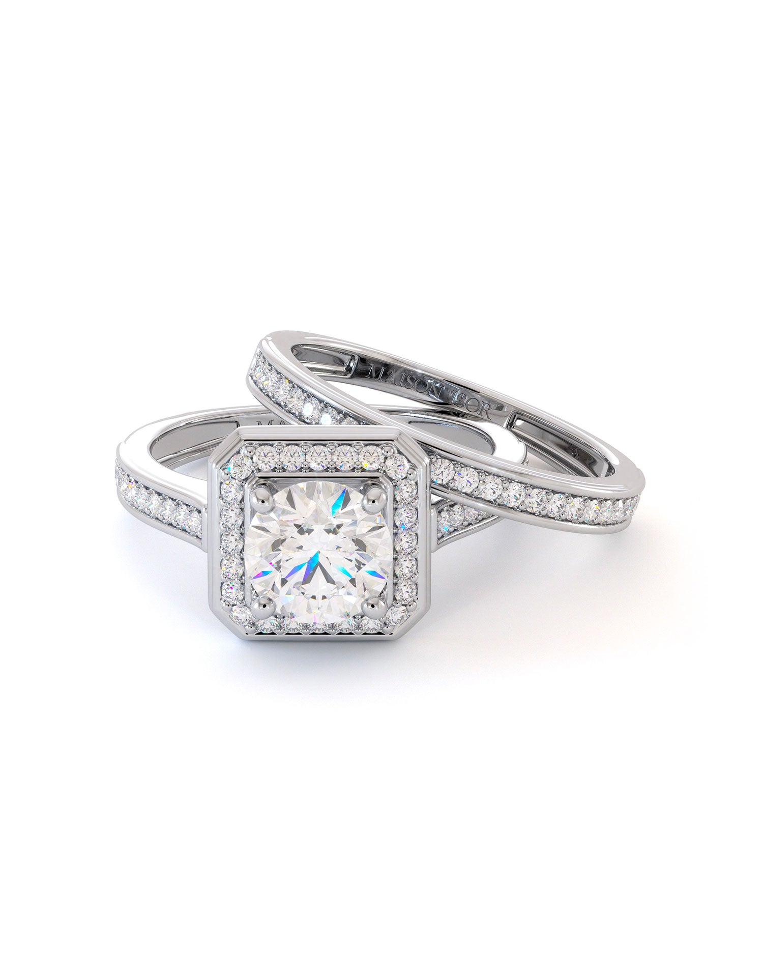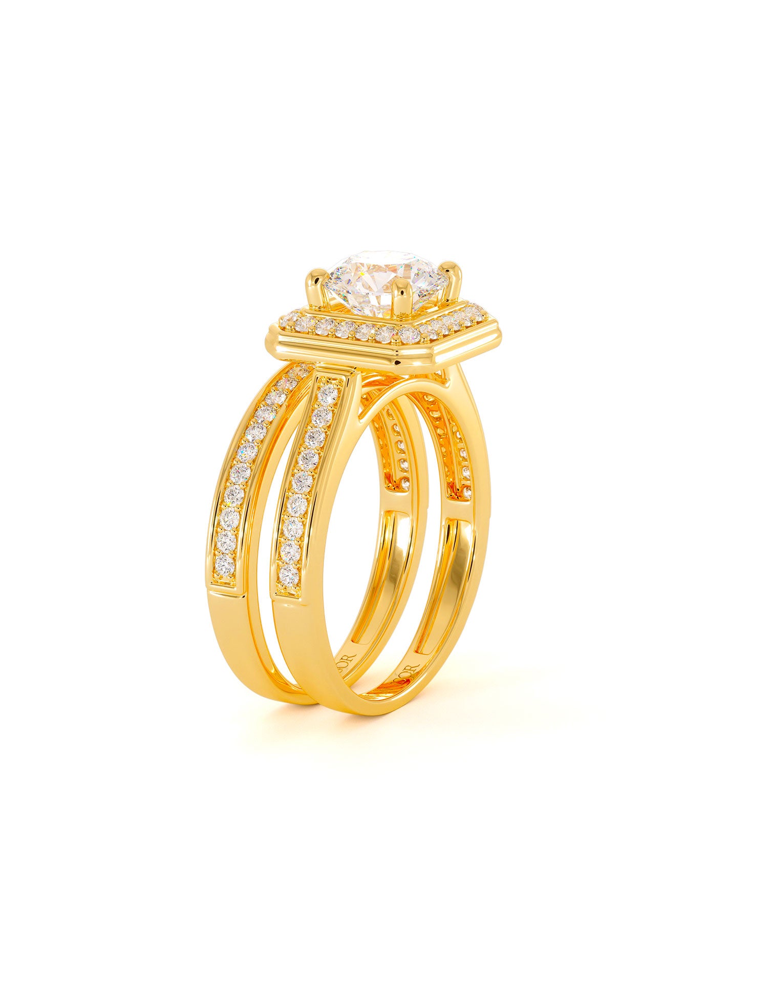 Duo en or 18 carats composé d’une bague de fiançailles sertie d’un oxyde de zirconium rond taille brillant, mis en valeur par un halo géométrique en serti grain, et d’une alliance assortie également pavée de pierres scintillantes.