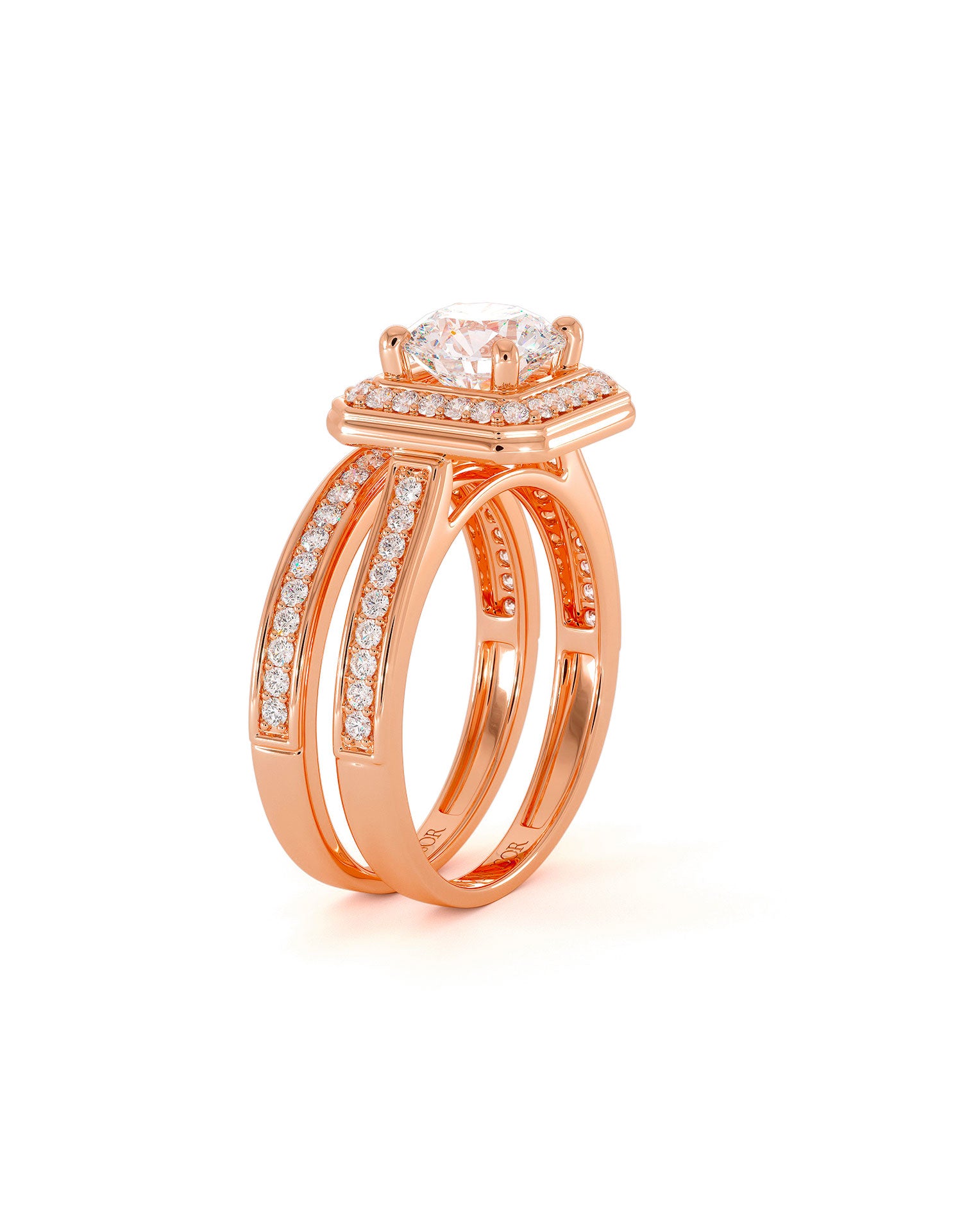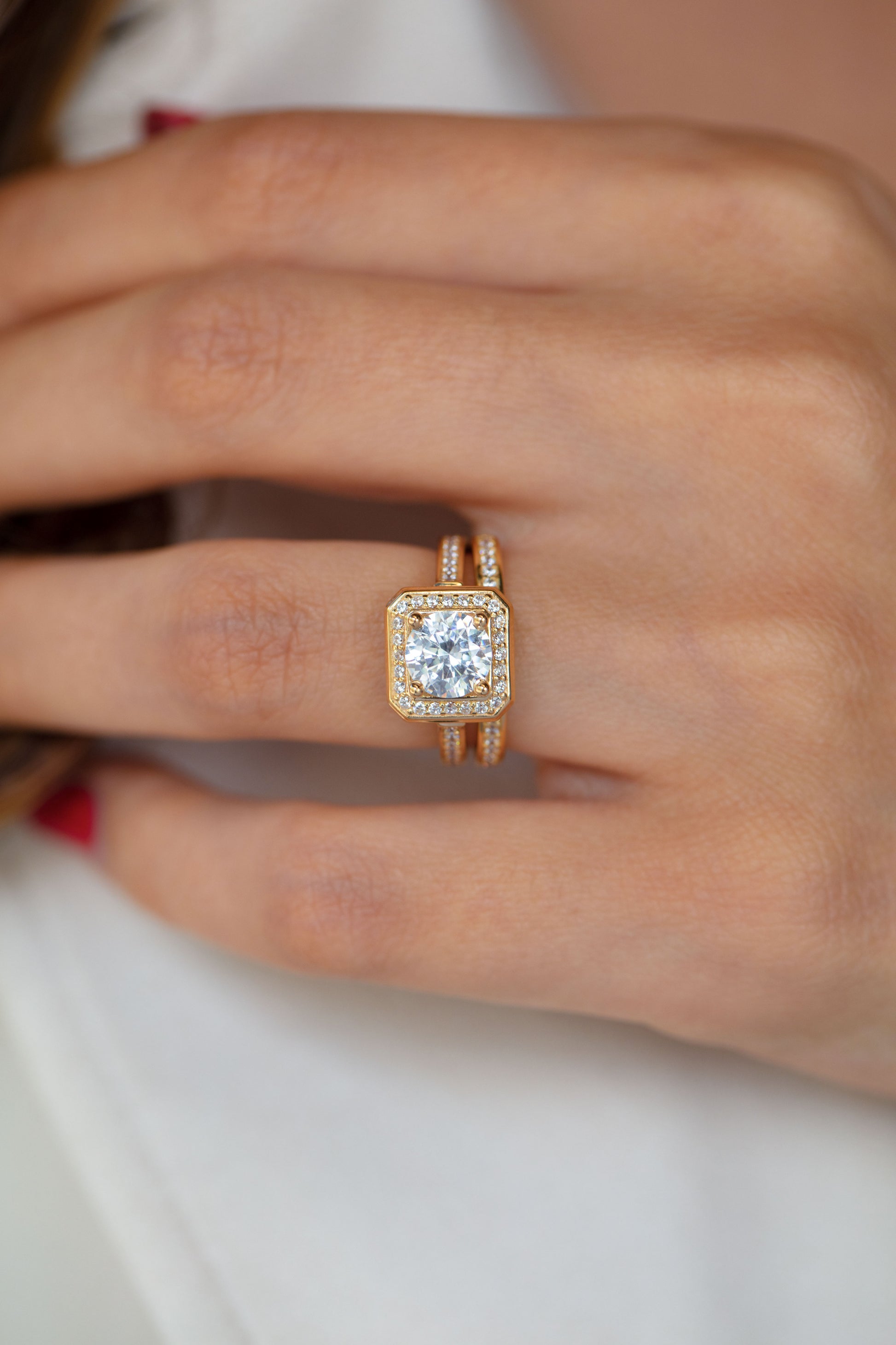 Duo en or 18 carats composé d’une bague de fiançailles sertie d’un oxyde de zirconium rond taille brillant, mis en valeur par un halo géométrique en serti grain, et d’une alliance assortie également pavée de pierres scintillantes.