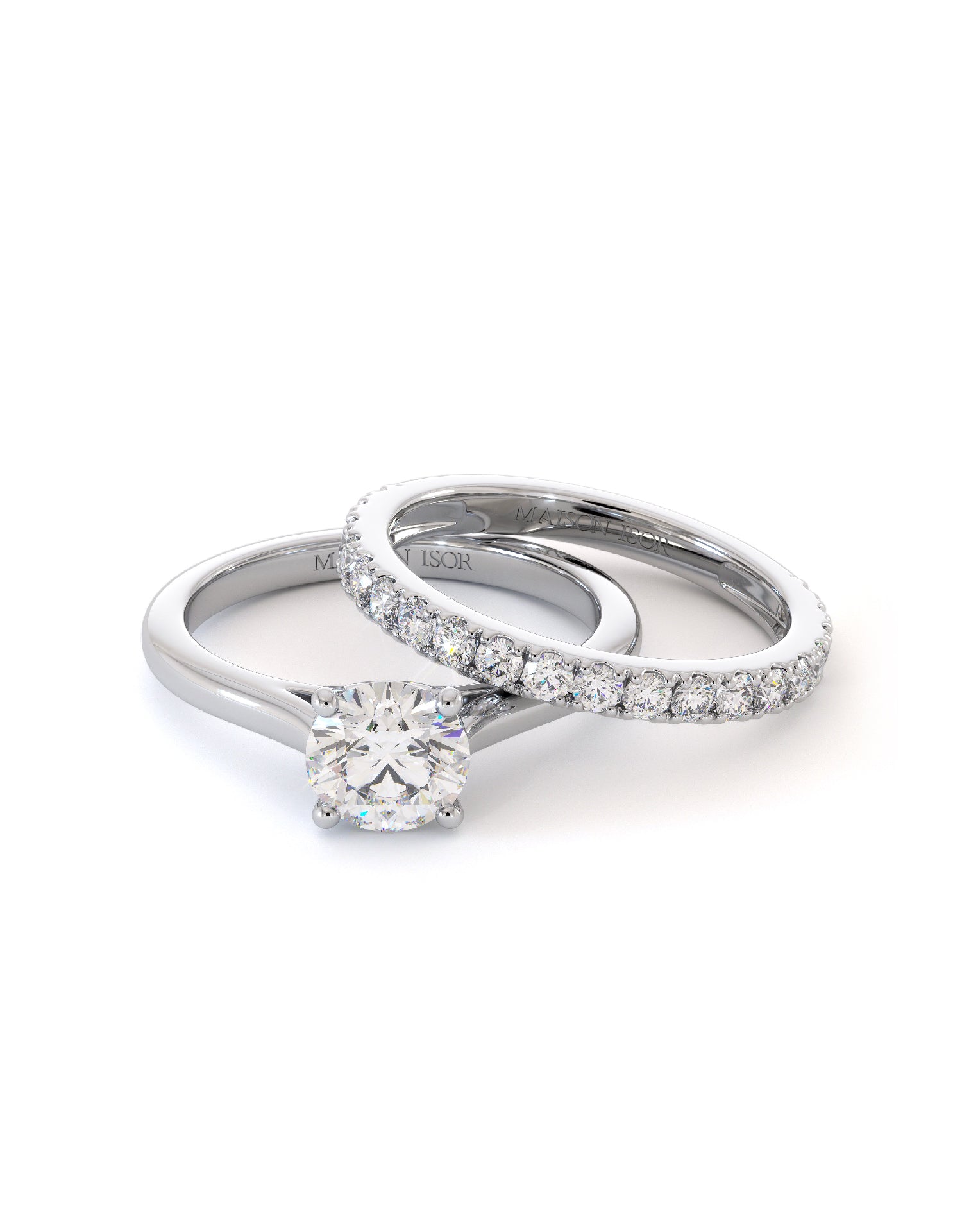 Duo en or 18 carats composé d’une bague de fiançailles sertie d’un oxyde de zirconium rond taille brillant à quatre griffes et d’une alliance assortie pavée de pierres scintillantes. Un design épuré et intemporel.