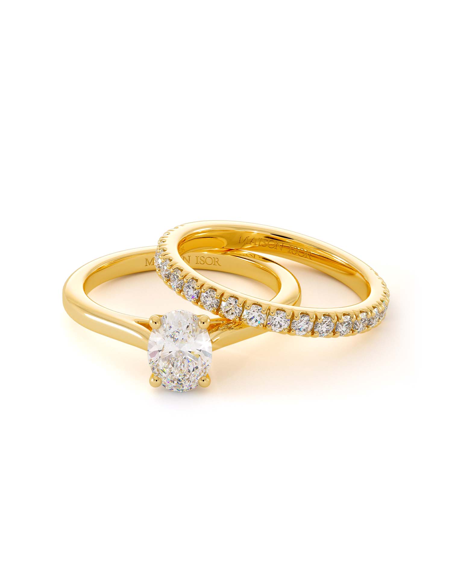 Duo en or 18 carats composé d’un solitaire classique serti d’un oxyde de zirconium taille ovale et d’une alliance assortie pavée de pierres scintillantes.