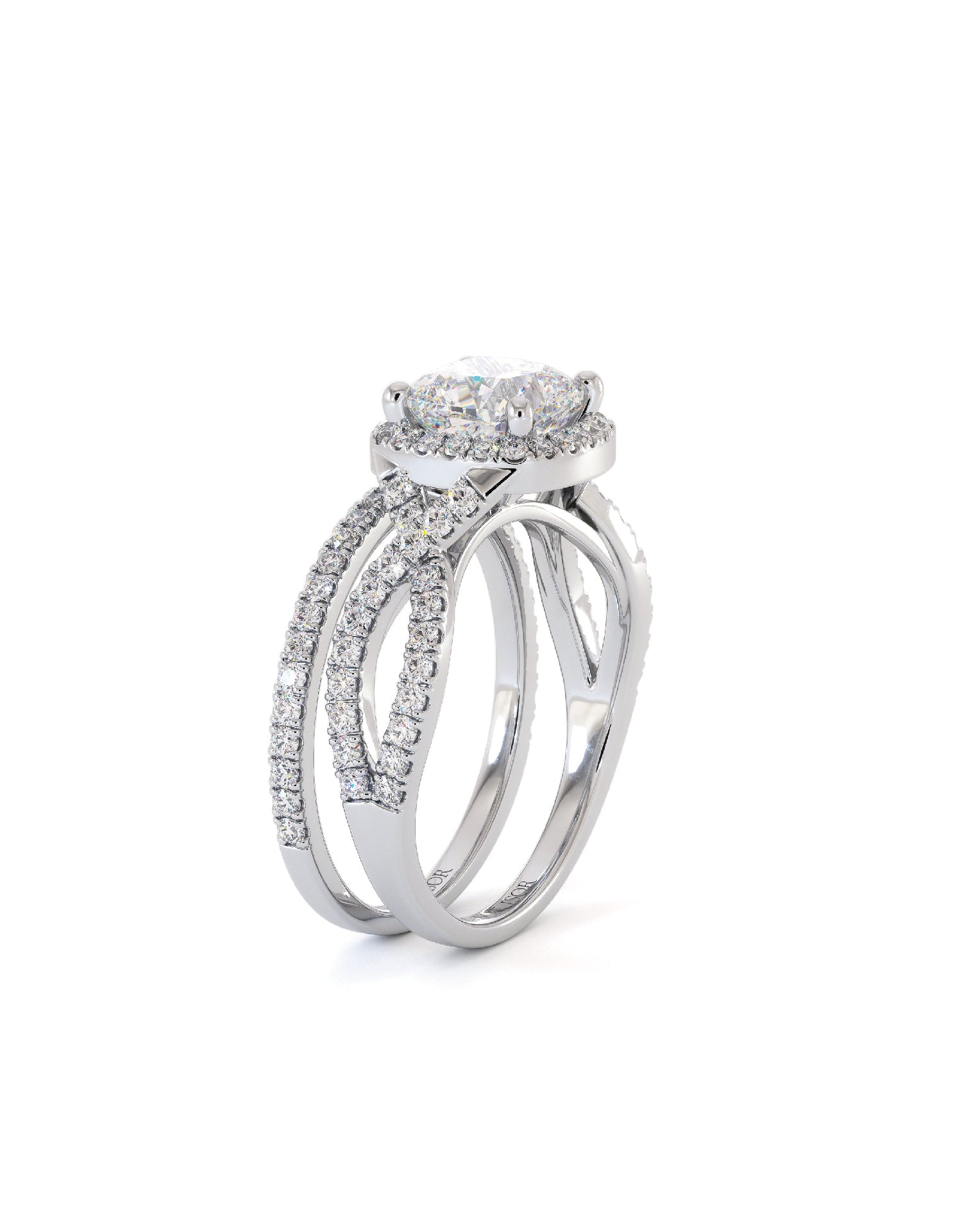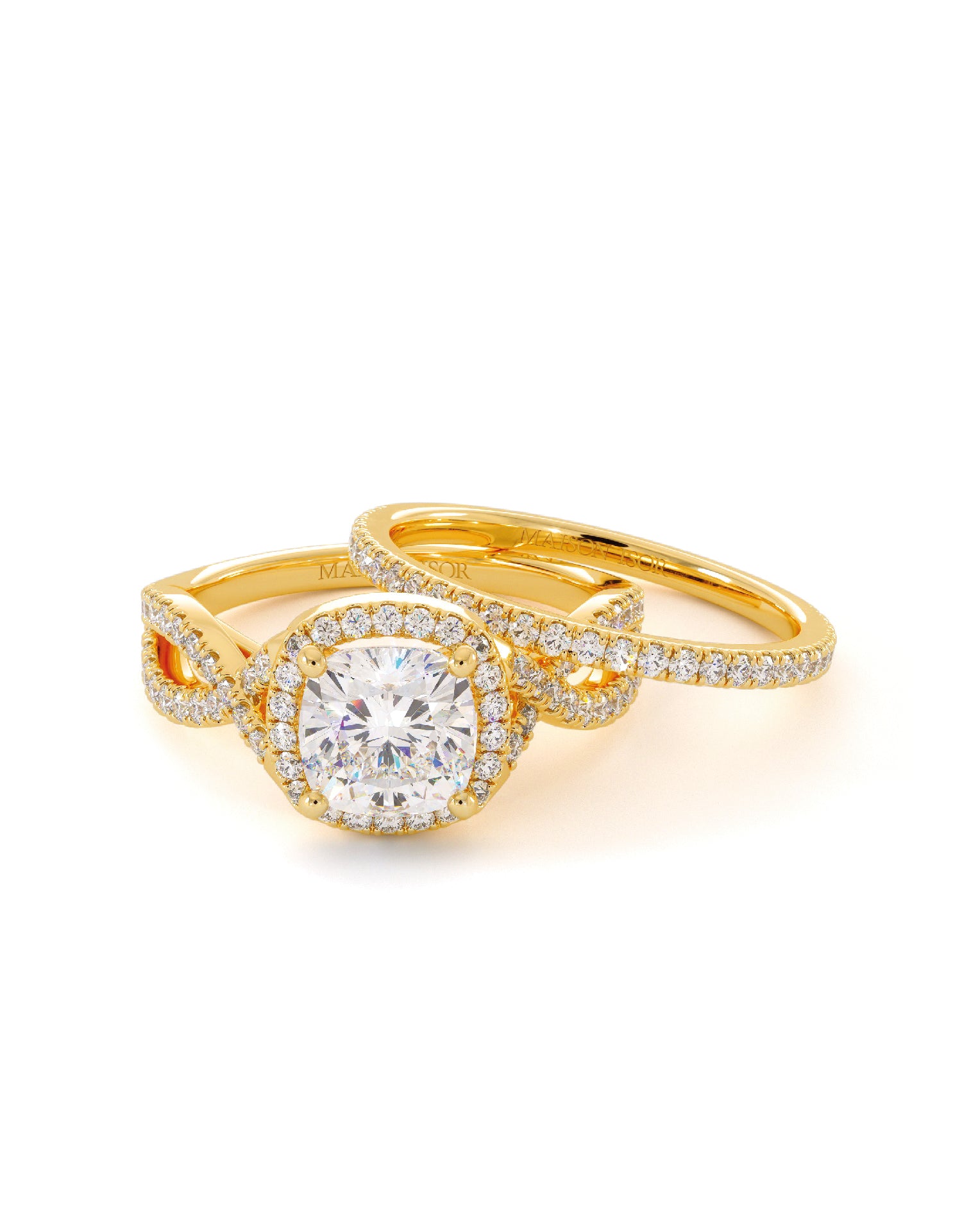 Duo en or 18 carats composé d’une bague de fiançailles sertie d’un oxyde de zirconium rond taille brillant, sublimé par un halo et un anneau pavé de pierres aux lignes entrelacées, et d’une alliance assortie délicatement sertie de pierres scintillantes.