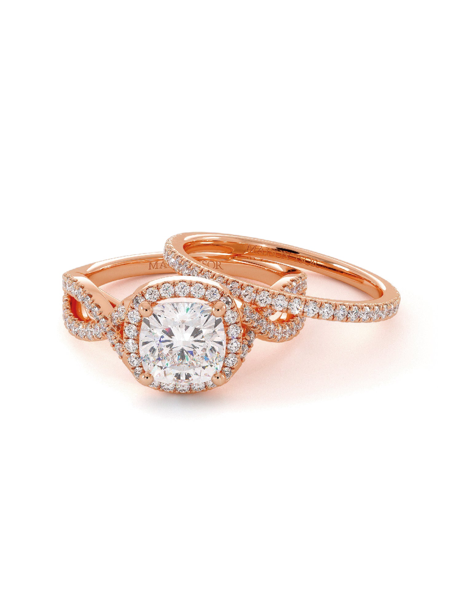 Duo en or 18 carats composé d’une bague de fiançailles sertie d’un oxyde de zirconium rond taille brillant, sublimé par un halo et un anneau pavé de pierres aux lignes entrelacées, et d’une alliance assortie délicatement sertie de pierres scintillantes.