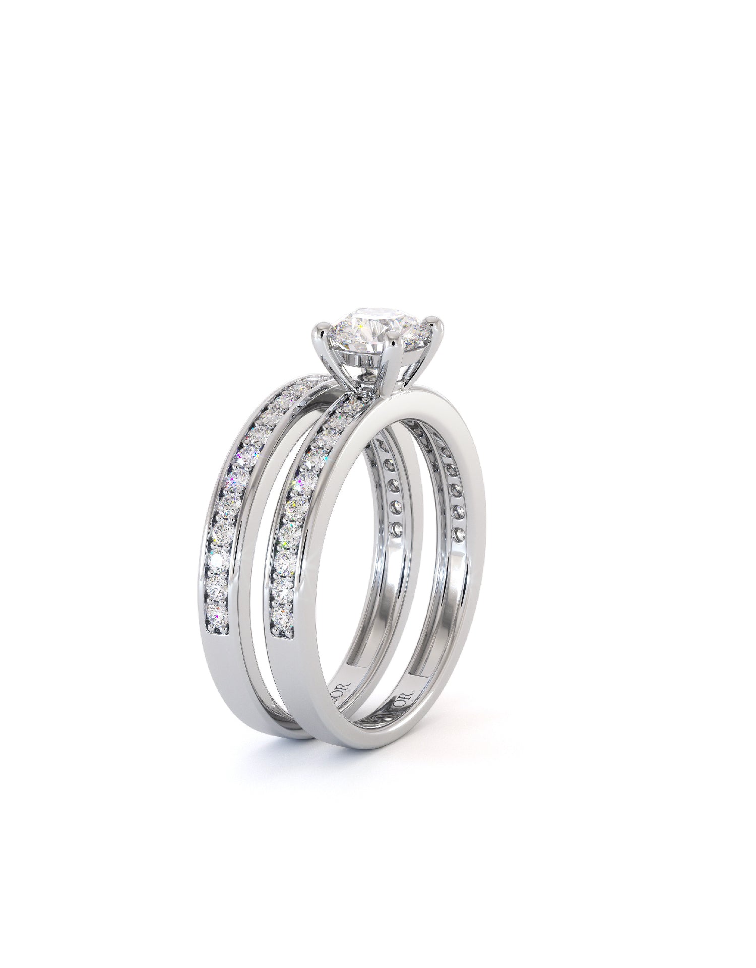 Duo en or 18 carats composé d’une bague de fiançailles sertie d’un oxyde de zirconium rond taille brillant, mise en valeur par un pavage serti rail sur l’anneau, et d’une alliance assortie également sertie rail de pierres scintillantes. Un duo gracieux et raffiné.