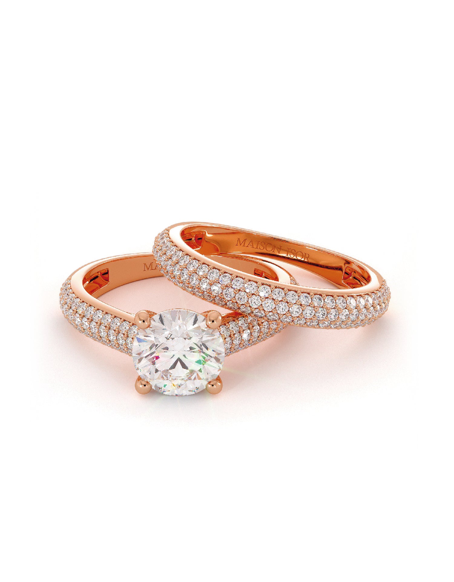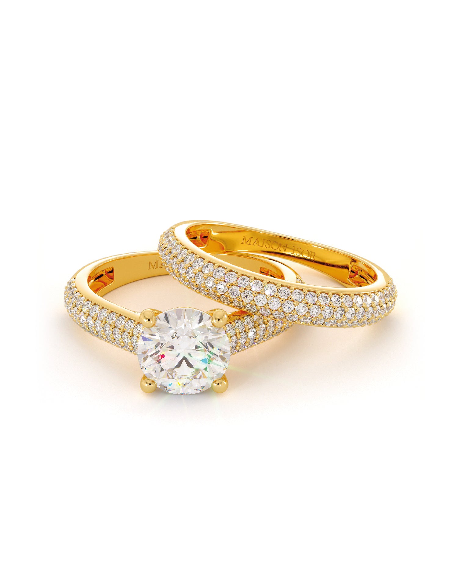 Duo en or 18 carats composé d’une bague de fiançailles sertie d’un oxyde de zirconium rond taille brillant, sublimée par un triple pavage de pierres scintillantes sur l’anneau, et d’une alliance assortie pavée de trois rangs pour un éclat exceptionnel.