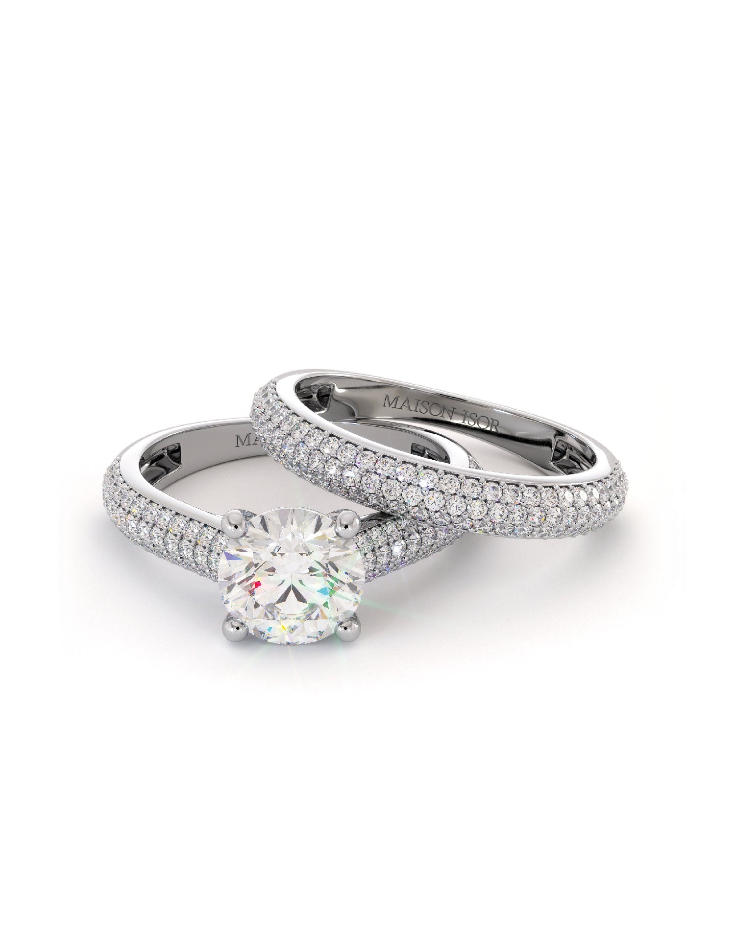 Duo en or 18 carats composé d’une bague de fiançailles sertie d’un oxyde de zirconium rond taille brillant, sublimée par un triple pavage de pierres scintillantes sur l’anneau, et d’une alliance assortie pavée de trois rangs pour un éclat exceptionnel.