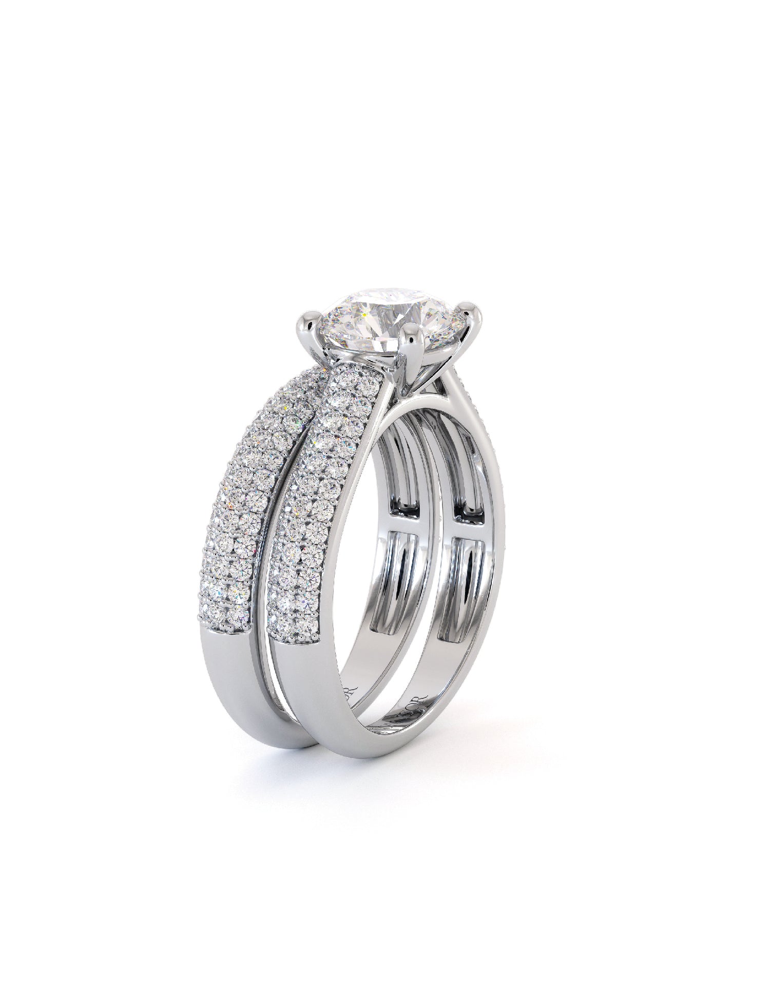 Duo en or 18 carats composé d’une bague de fiançailles sertie d’un oxyde de zirconium rond taille brillant, sublimée par un triple pavage de pierres scintillantes sur l’anneau, et d’une alliance assortie pavée de trois rangs pour un éclat exceptionnel.