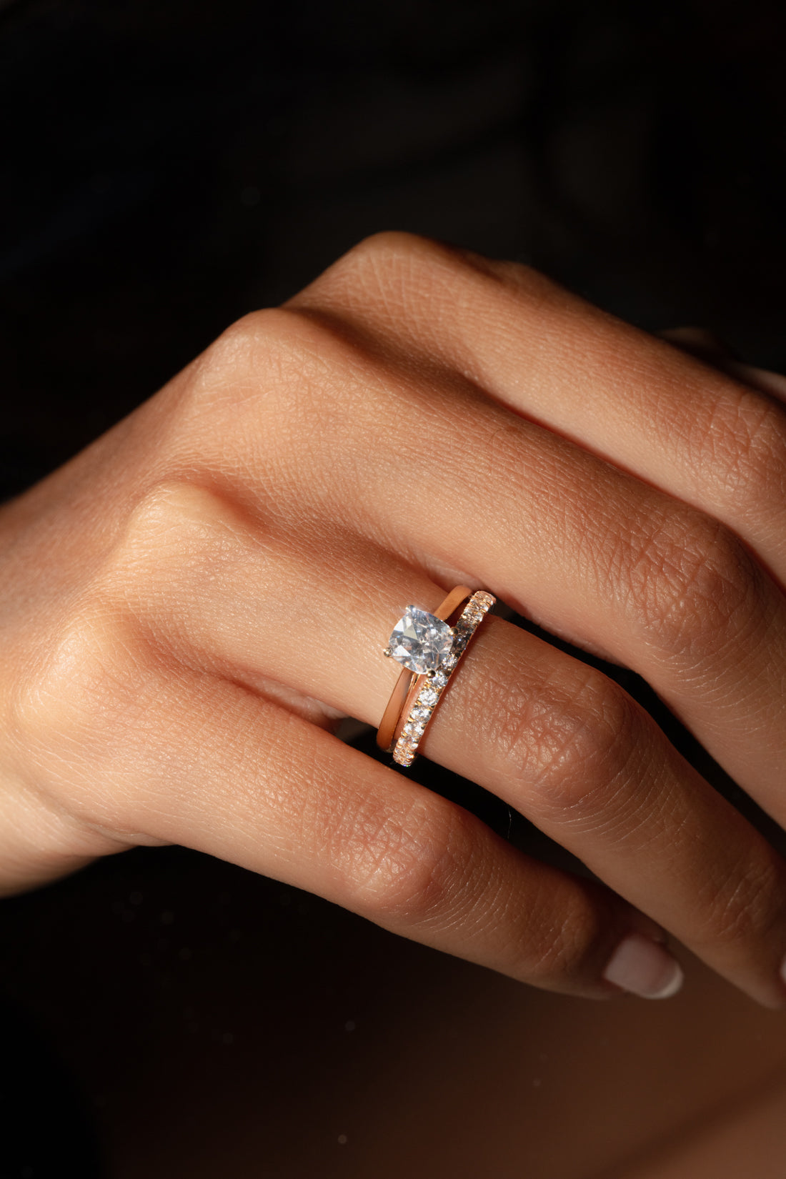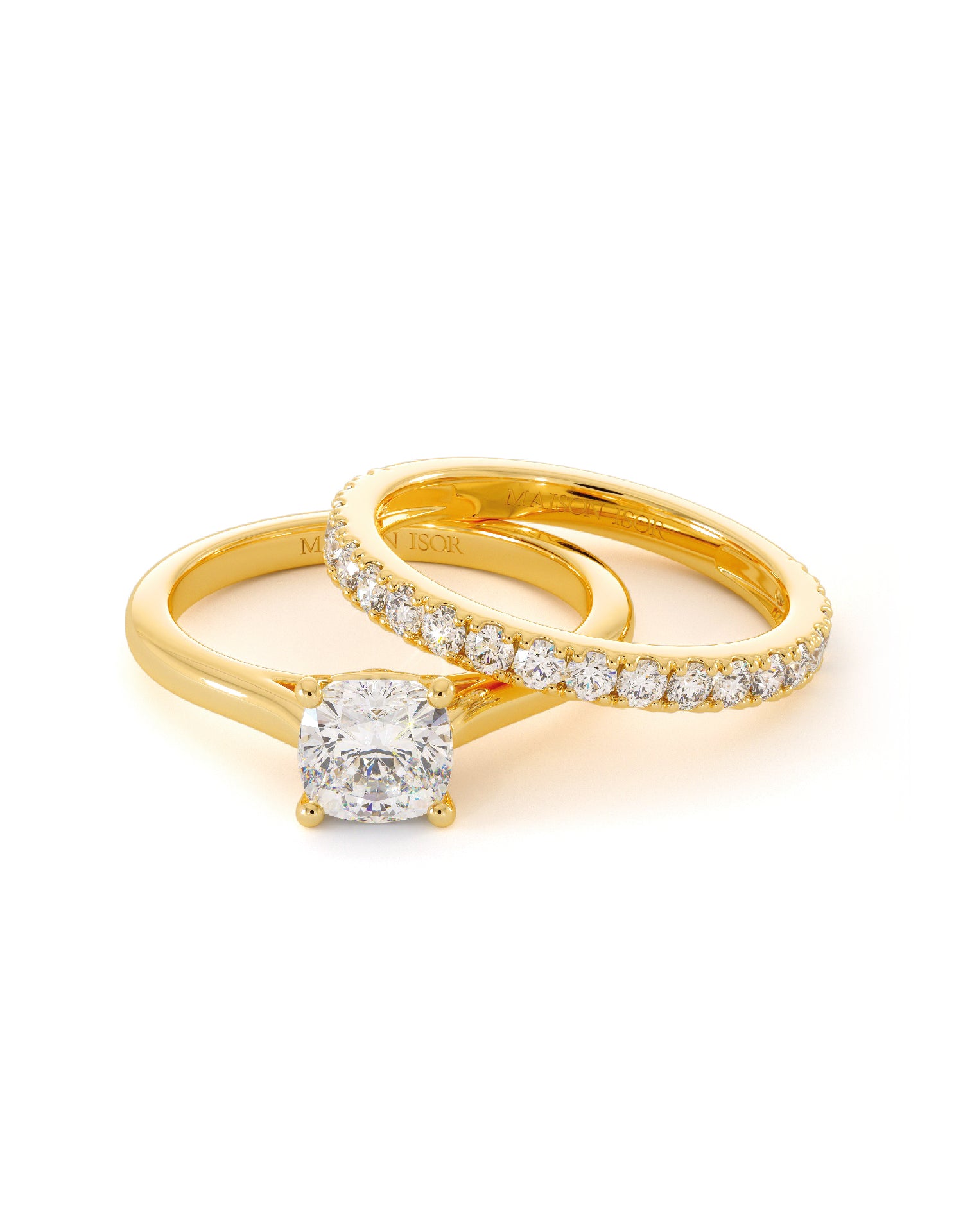 Duo en or 18 carats réunissant une bague de fiançailles sertie d’un oxyde de zirconium taille coussin à quatre griffes et une alliance pavée de pierres scintillantes. Une silhouette moderne et lumineuse.