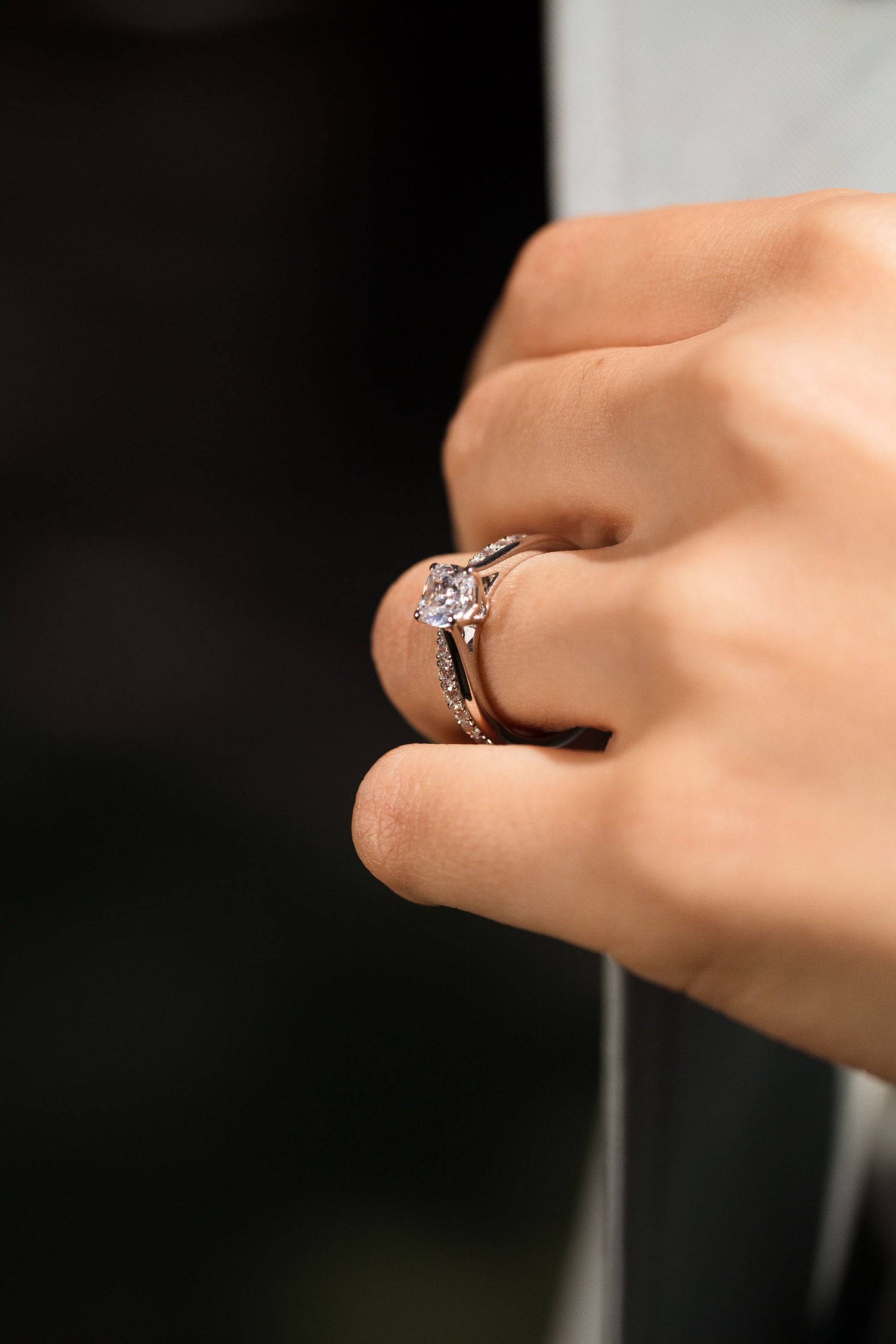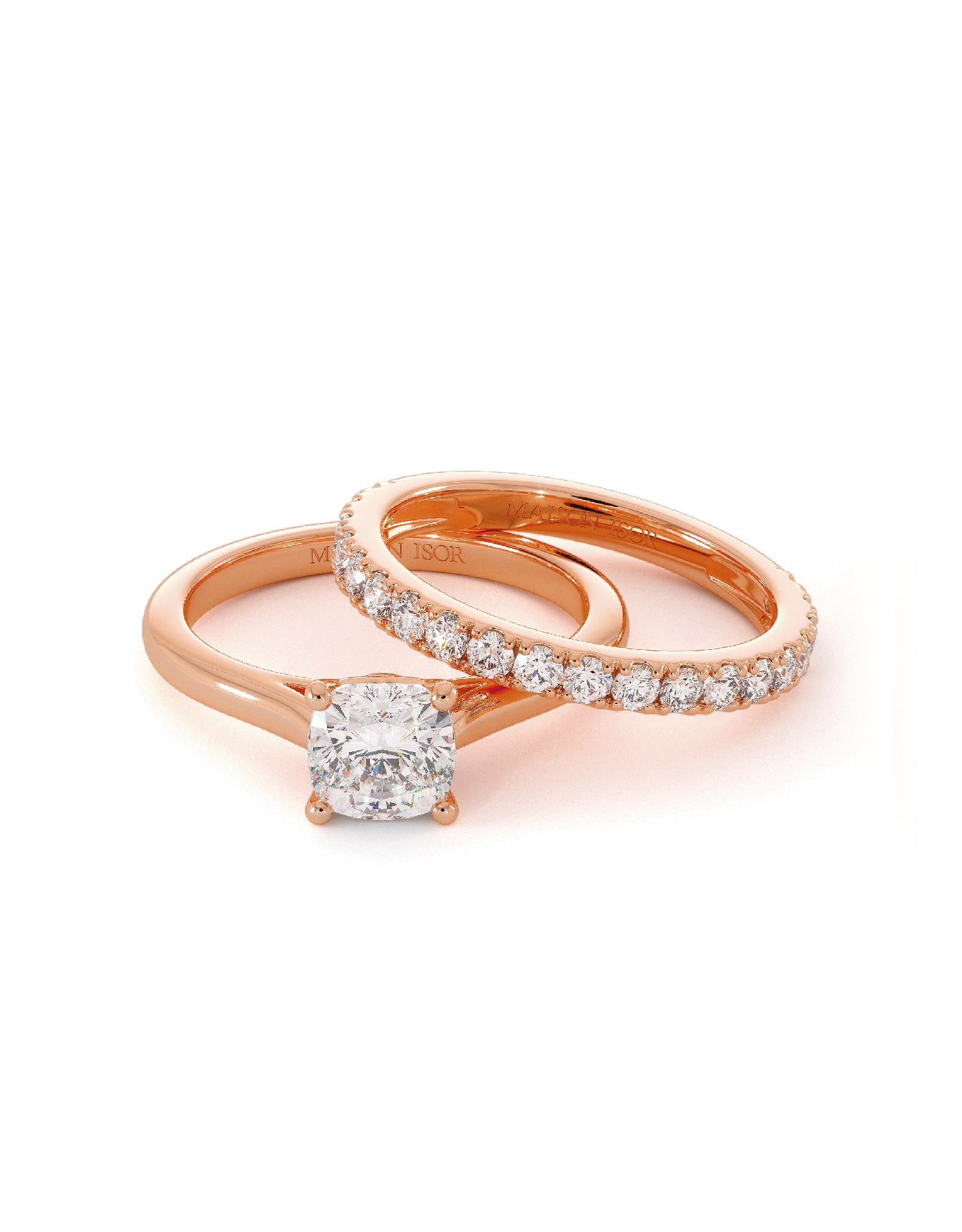 Duo en or 18 carats réunissant une bague de fiançailles sertie d’un oxyde de zirconium taille coussin à quatre griffes et une alliance pavée de pierres scintillantes. Une silhouette moderne et lumineuse.