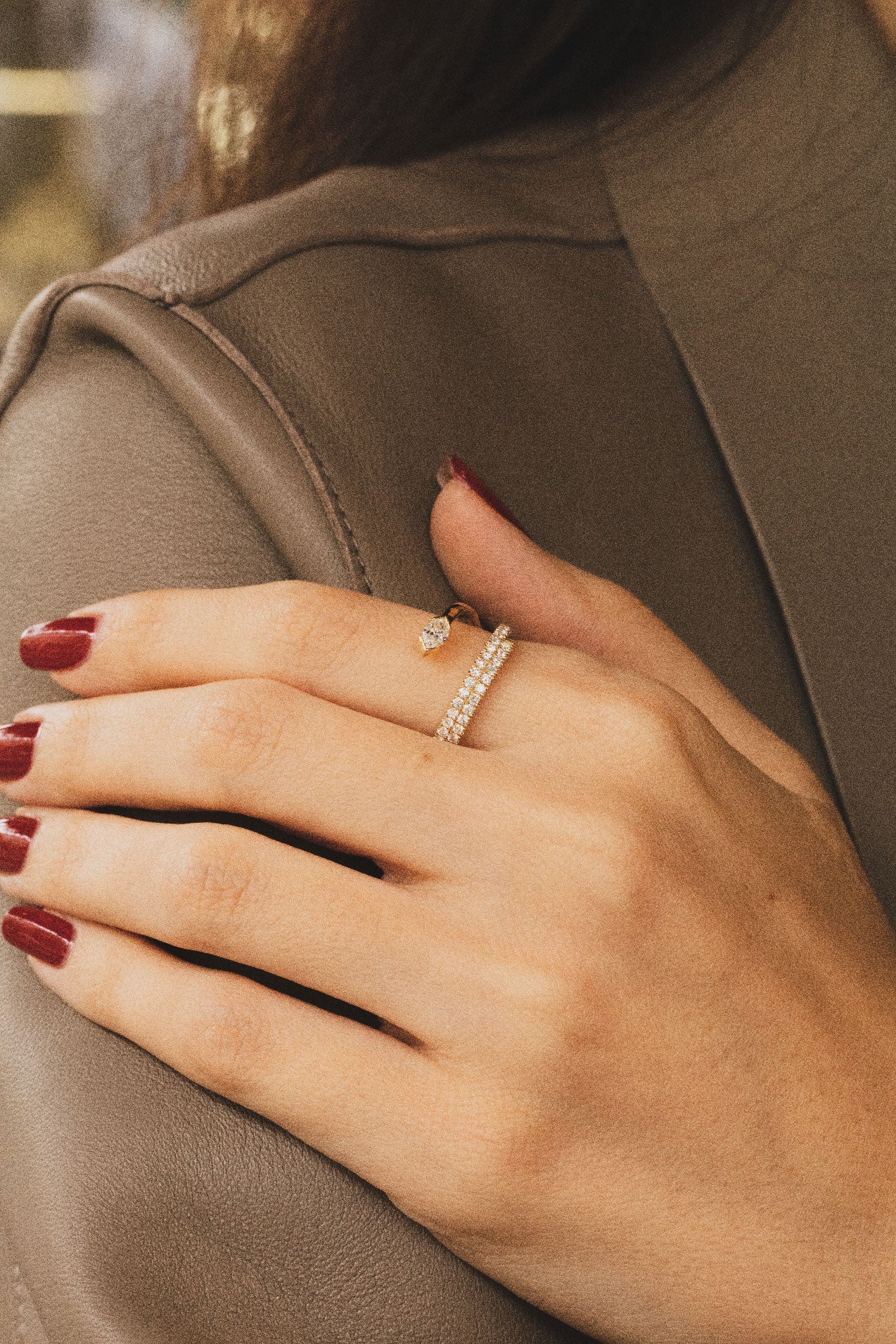 Cette bague en or jaune présente une conception unique et originale, inspirée d'un serpent enroulé autour de votre doigt. L'aspect serpent se manifeste par des détails subtils et élégants dans la forme de la bague, créant une esthétique saisissante et audacieuse. Cette bague en or jaune avec sa forme originale façon serpent et une marquise à son bout est un choix audacieux pour celles et ceux qui recherchent un bijou à la fois unique et sophistiqué. Elle est parfaite pour ajouter une touche de glamour et de mystère à votre style et attirer tous les regards.