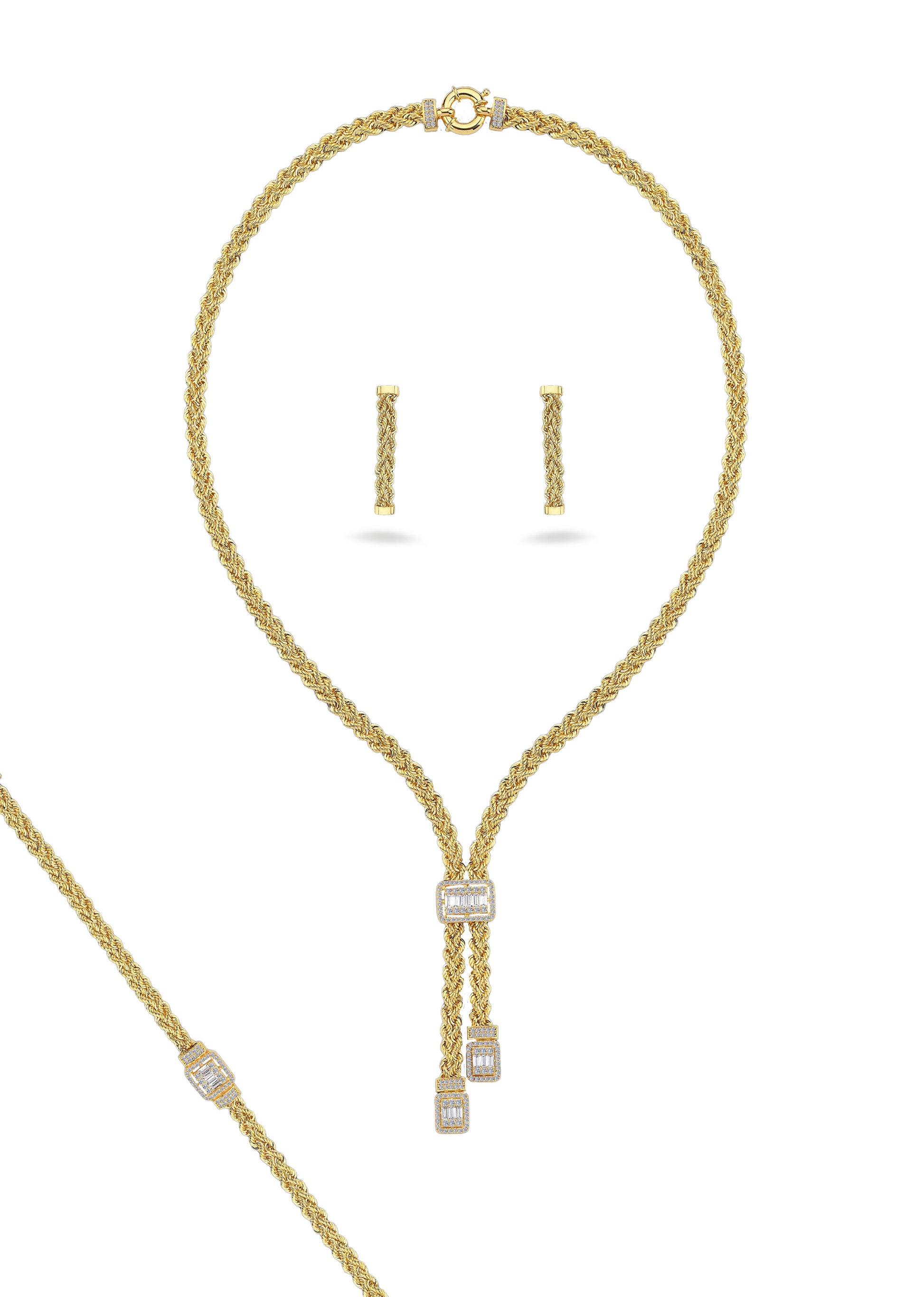 La parure ELYN en or 18 carats illumine vos tenues avec élégance. Son collier à pendentif rectangulaire, son bracelet délicat et ses boucles d’oreilles épurées créent un ensemble raffiné, parfait pour les occasions festives.
