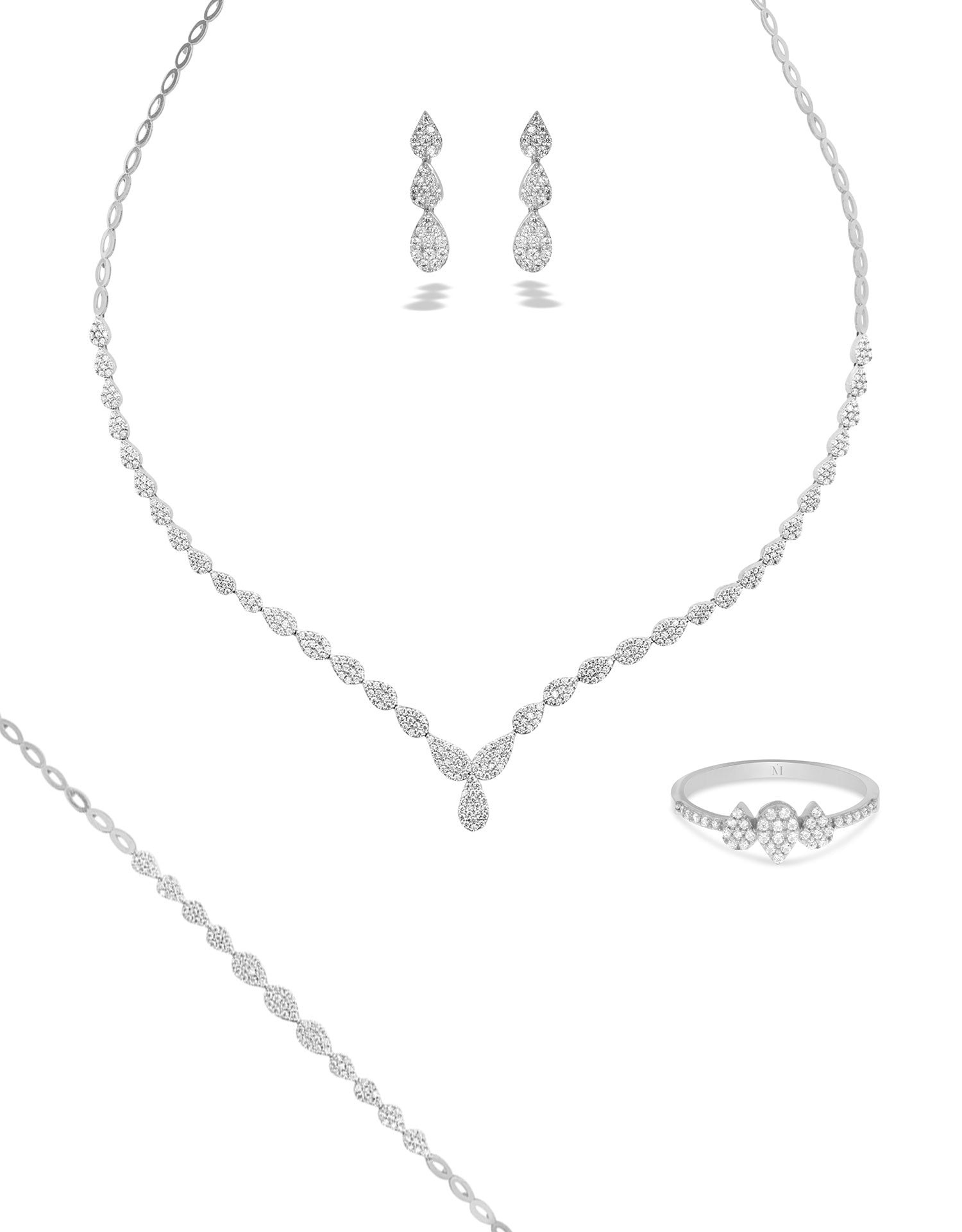 Affichant une élégance raffinée la parure HOLLY en or 18 carat associe simplicité et modernité. HOLLY se compose de 4 pièces ; un magnifique collier et des boucles d’oreille tombante laissant apparaitre un dégradé de goutte, ainsi qu’une gourmette et une bague venant compléter la parure.