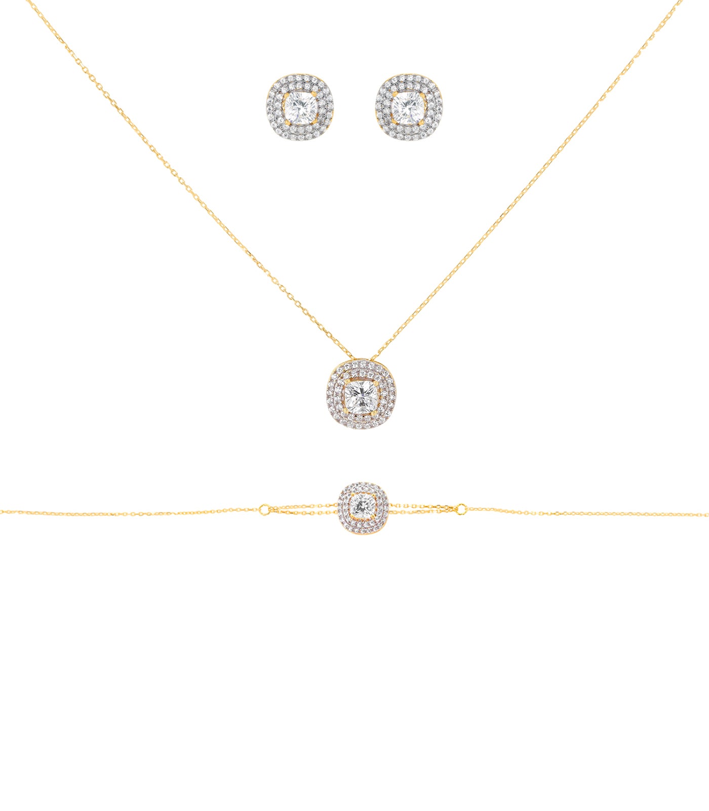 Le mini set ISLA en or jaune 18 carats va vous rendre éblouissante. Sur la peau, la pierre centrale taille coussin scintille tandis qu'un cercle est orné de petites pierres taille brillant pour un effet captivant. Ce mini set est composé d'un pendentif et d'une paire de boucle d'oreille.