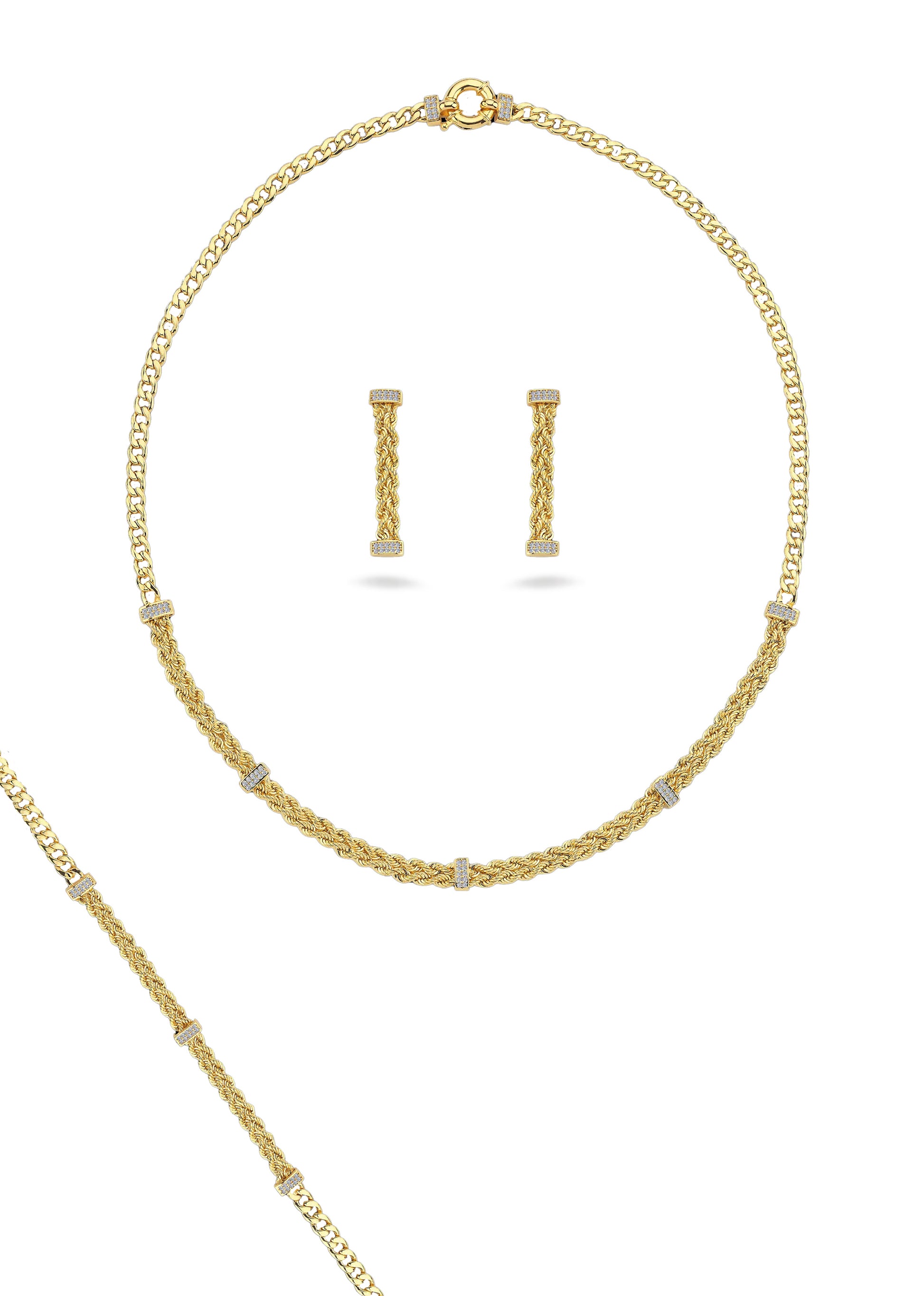La parure NAOMI en or 18 carats allie élégance et brillance. Ses mailles torsadées, rehaussées d’anneaux pavés de zircon, se déclinent en collier, bracelet et boucles d’oreilles pour un ensemble raffiné et intemporel.