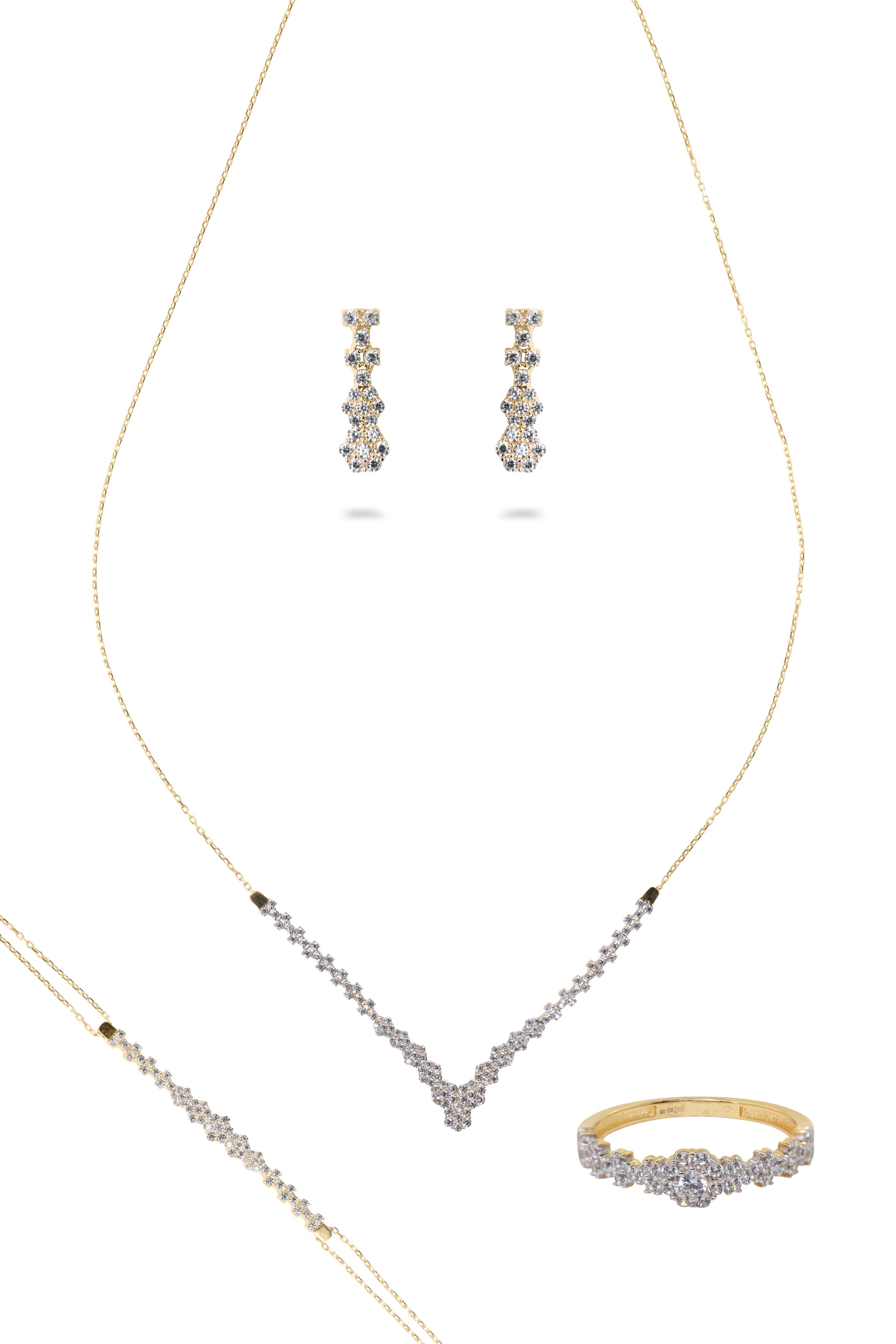 Notre parure PETUNIA en or 18 carats et oxyde de zirconium, composée de quatre pièces, marie avec élégance l'éclat de l'or à la brillance des pierres. Le collier, le bracelet, les boucles d’oreilles et la bague sont ornés de zirconium étincelant, apportant une touche de sophistication et de modernité à cette création raffinée.