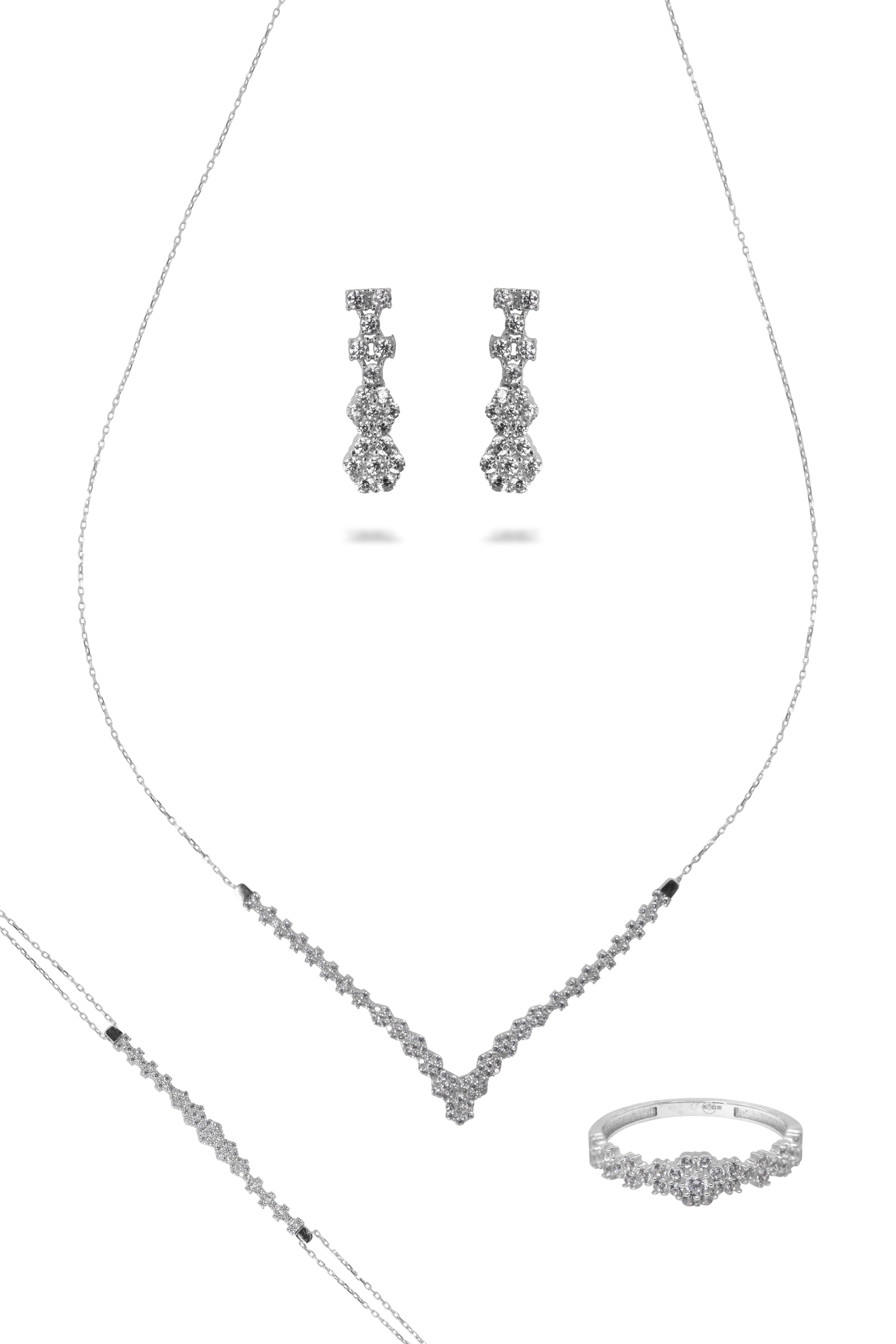 Notre parure PETUNIA en or 18 carats et oxyde de zirconium, composée de quatre pièces, marie avec élégance l'éclat de l'or à la brillance des pierres. Le collier, le bracelet, les boucles d’oreilles et la bague sont ornés de zirconium étincelant, apportant une touche de sophistication et de modernité à cette création raffinée.