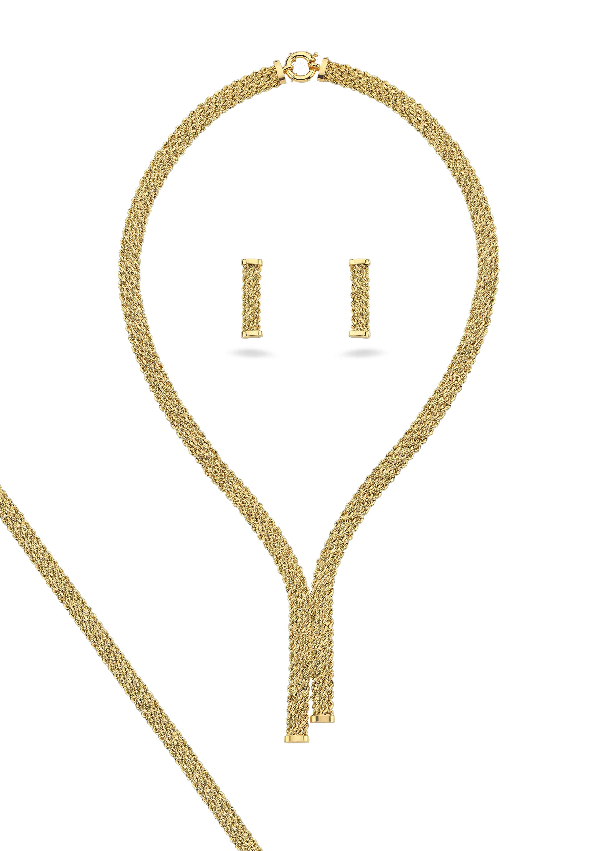 La parure ROSA en or 18 carats allie modernité et finesse. Ses lignes de maille corde s’assemblent pour former un collier, un bracelet et des boucles d’oreilles harmonieux, créant un ensemble élégant et raffiné.