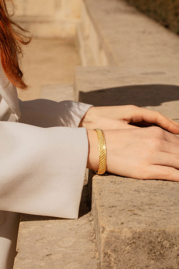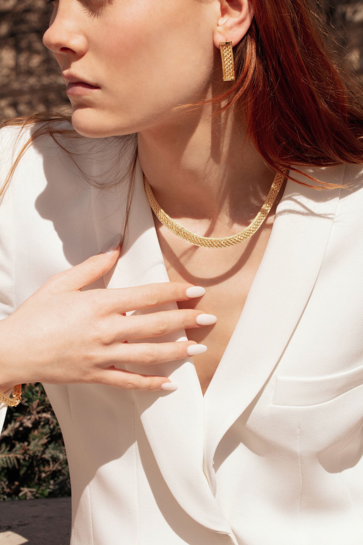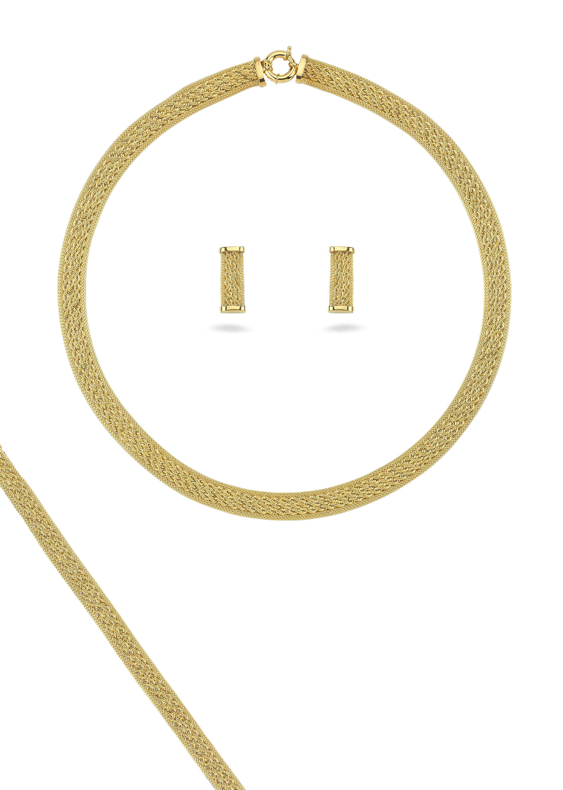 La parure SOHANNA en or 18 carats allie modernité et élégance. Sa maille torsadée réinvente le classique avec audace, et se compose d’un collier, d’un bracelet et de boucles d’oreilles pour un ensemble lumineux et raffiné.