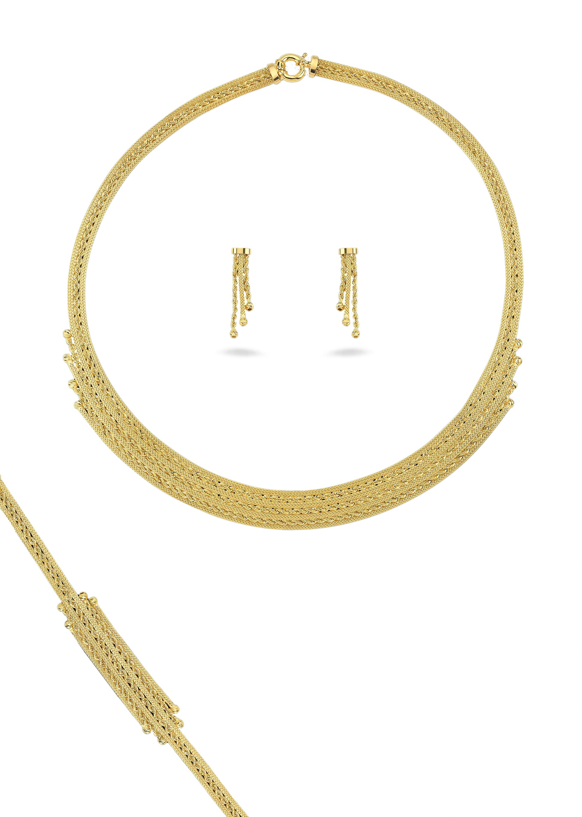 La parure SWANN en or 18 carats allie modernité et élégance. Ses mailles subtilement assemblées créent un jeu de longueurs harmonieux, déclinées en collier, bracelet et boucles d’oreilles pour un ensemble raffiné et unique.