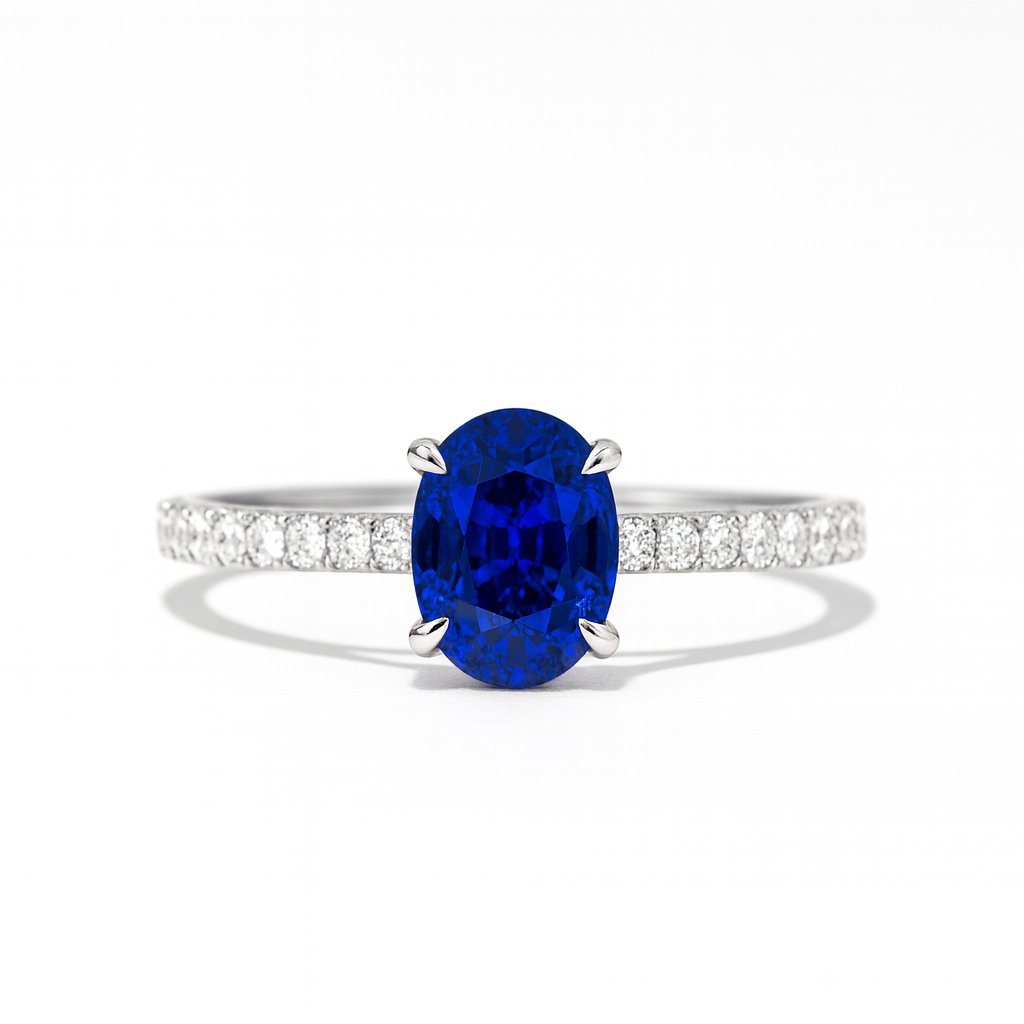 Bague en or blanc 18 carats ornée d’un saphir ovale intense, serti par quatre griffes et accompagné de diamants sur les épaules.