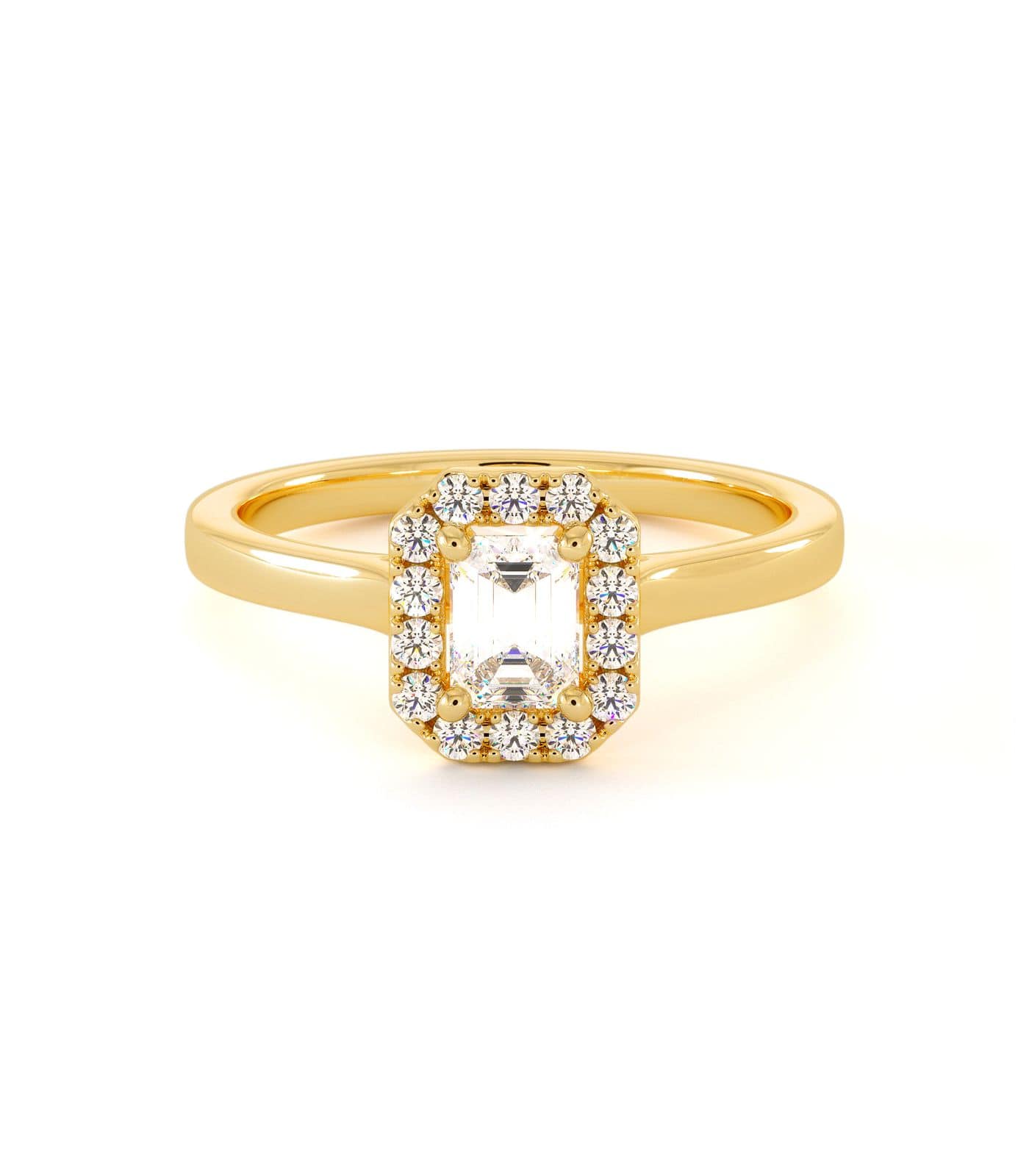 Solitaire Abuja en or 750/1000, orné d’un diamant central taille émeraude entouré d’un halo de diamants éclatants.