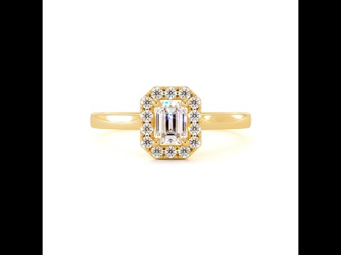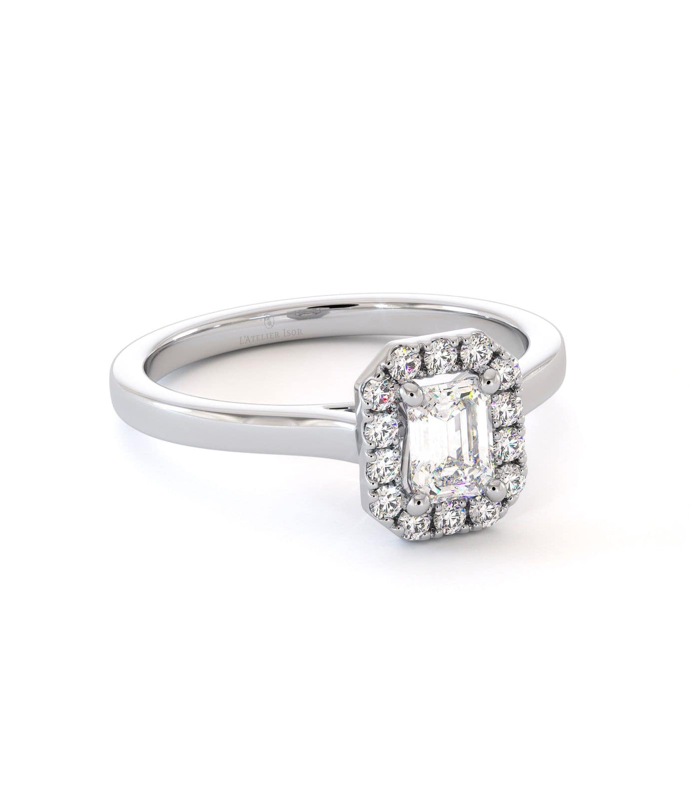 Solitaire Abuja en or 750/1000, orné d’un diamant central taille émeraude entouré d’un halo de diamants éclatants.