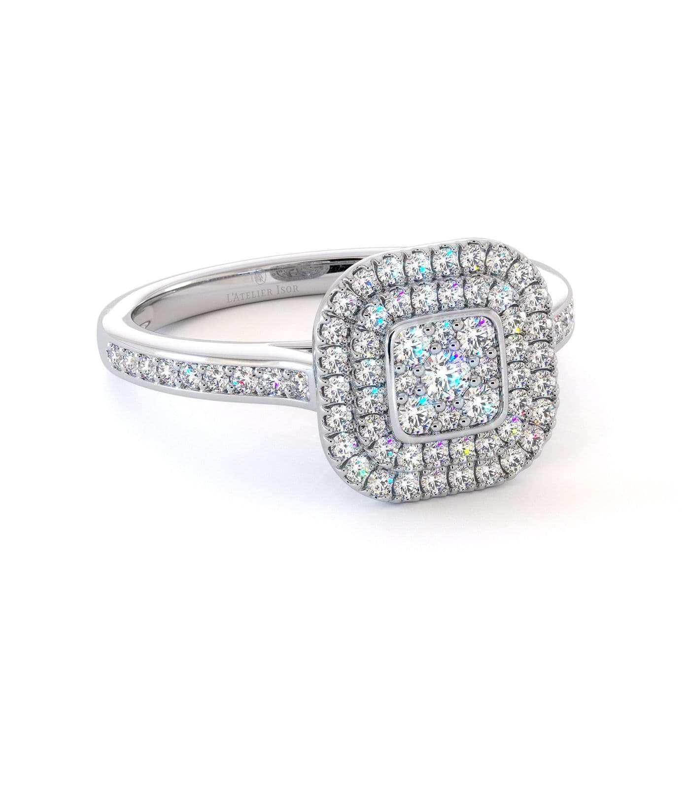 Solitaire Alicia en or 750/1000, composé de diamants (0,50 ct) formant l’illusion d’une pierre centrale aux reflets multiples, rehaussée d’un halo éclatant.
