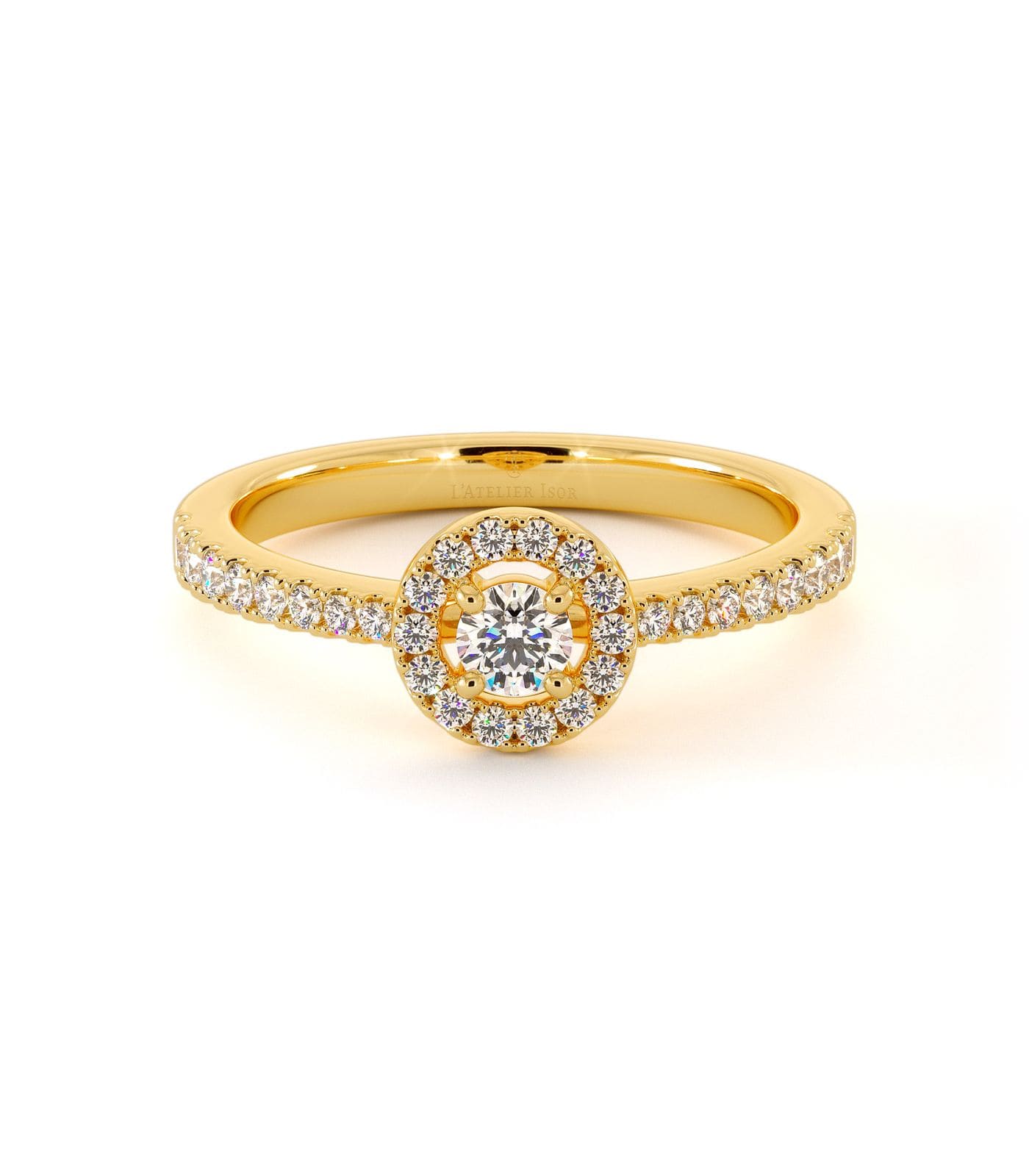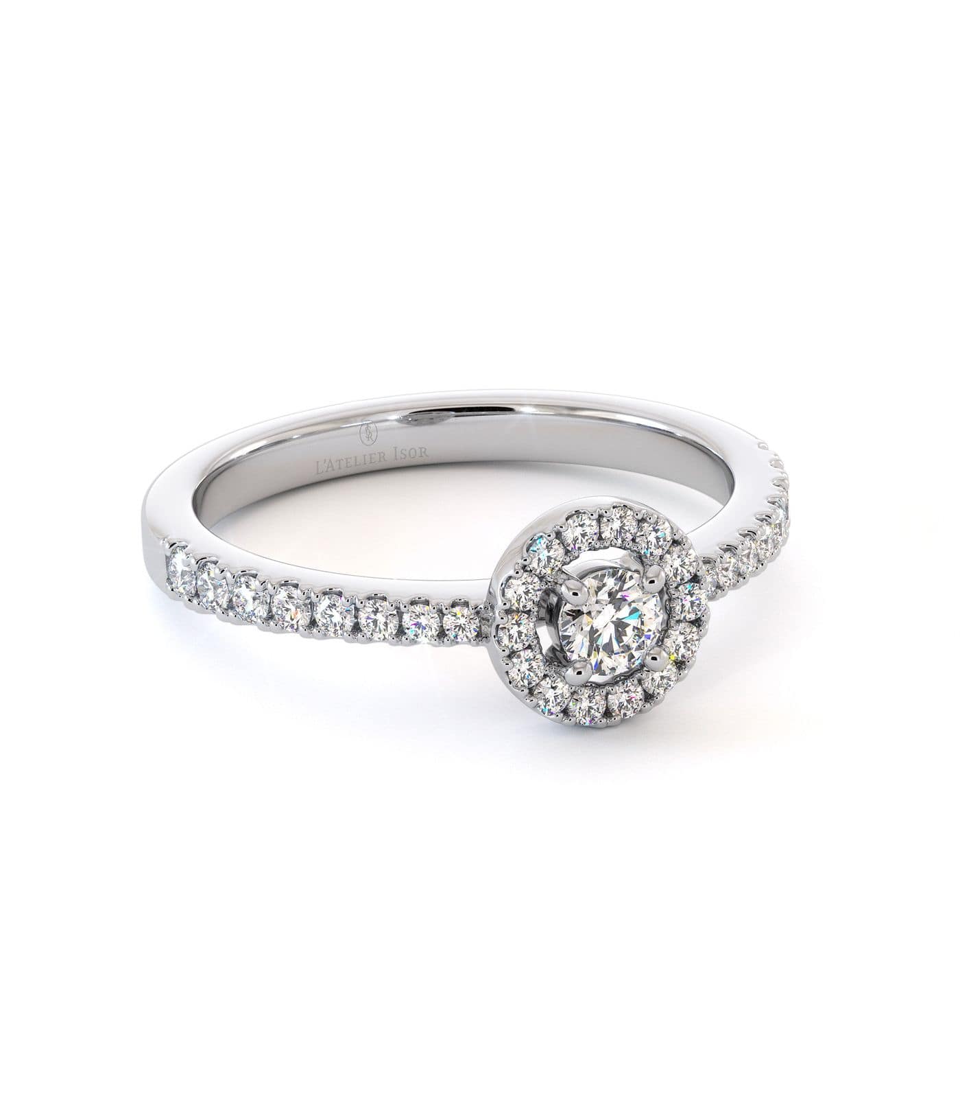 Délicate et raffinée, la bague de fiançailles BLUE MOON en or 18 carats, symbole d'amour et de passion, promet une lueur flamboyante à  votre bijou. Grâce à  son diamant central scintillant taille brillant, son halo de petits diamants et son pavage délicat le long de son anneau, ce solitaire vous fera rêver au premier regard. Le solitaire BLUE MOON irradie la féminité et la délicatesse de votre main. Elle s'associe parfaitement en termes de style et de finesse avec l'alliance MAKIAN ou une alliance créée sur-mesure pour épouser ce bijou.
