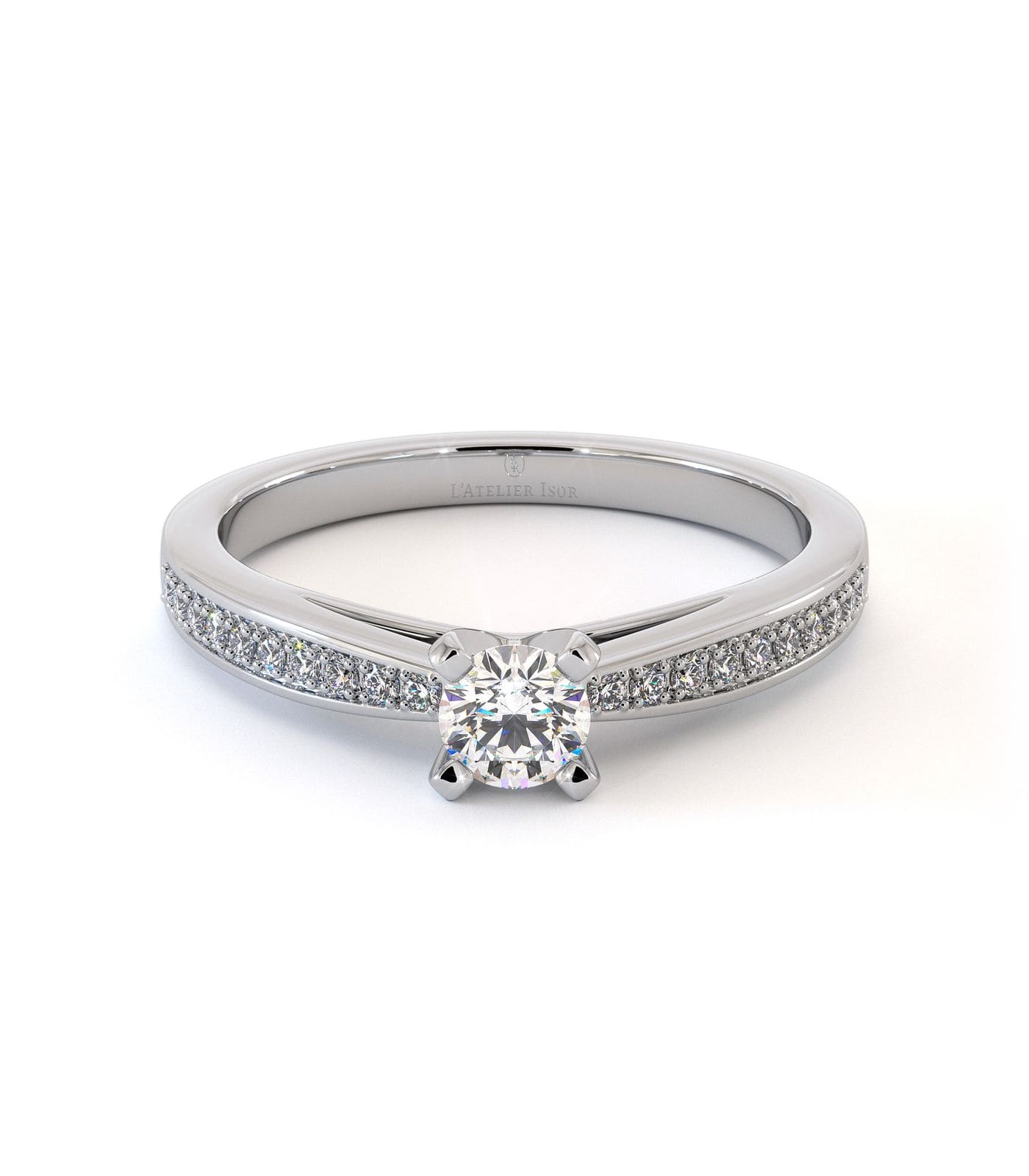 Alliant charme et délicatesse, le magnifique solitaire CAPRIA saura certainement vous séduire. En or 18 carats serti d'un scintillant diamant central de forme ronde. Une pierre précieuse accompagnée d'un gracieux pavage de petits diamants brillants épousant parfaitement le long de son corps de bague, lui offrant un horizon radieux. Le solitaire CAPRIA se distingue par son allure luxueuse et son style sophistiqué qui sublimera divinement la main d'une femme délicate et glamour. Cette bague de fiançailles s'associe à merveille avec l'alliance PALMYRE, une bague de mariage qui se distingue par sa finesse. Vous pouvez également vous laisser tenter par notre service de création sur-mesure qui vous aidera à exprimer vos envies.