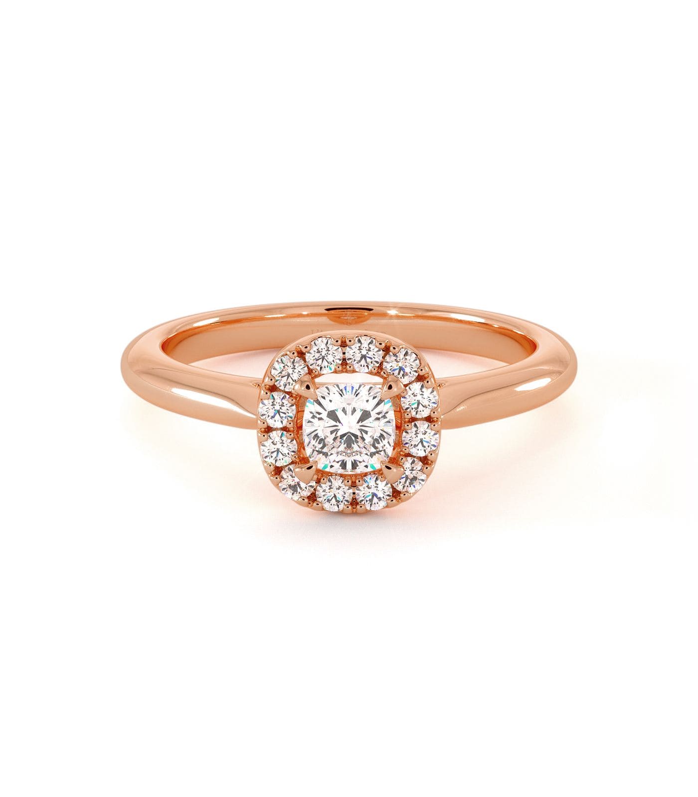 Solitaire Galil en or 750/1000, serti d’un diamant taille coussin de 0,35 ct, souligné par un halo ajouré.Un design raffiné et structuré, idéal avec l’alliance Riviera.