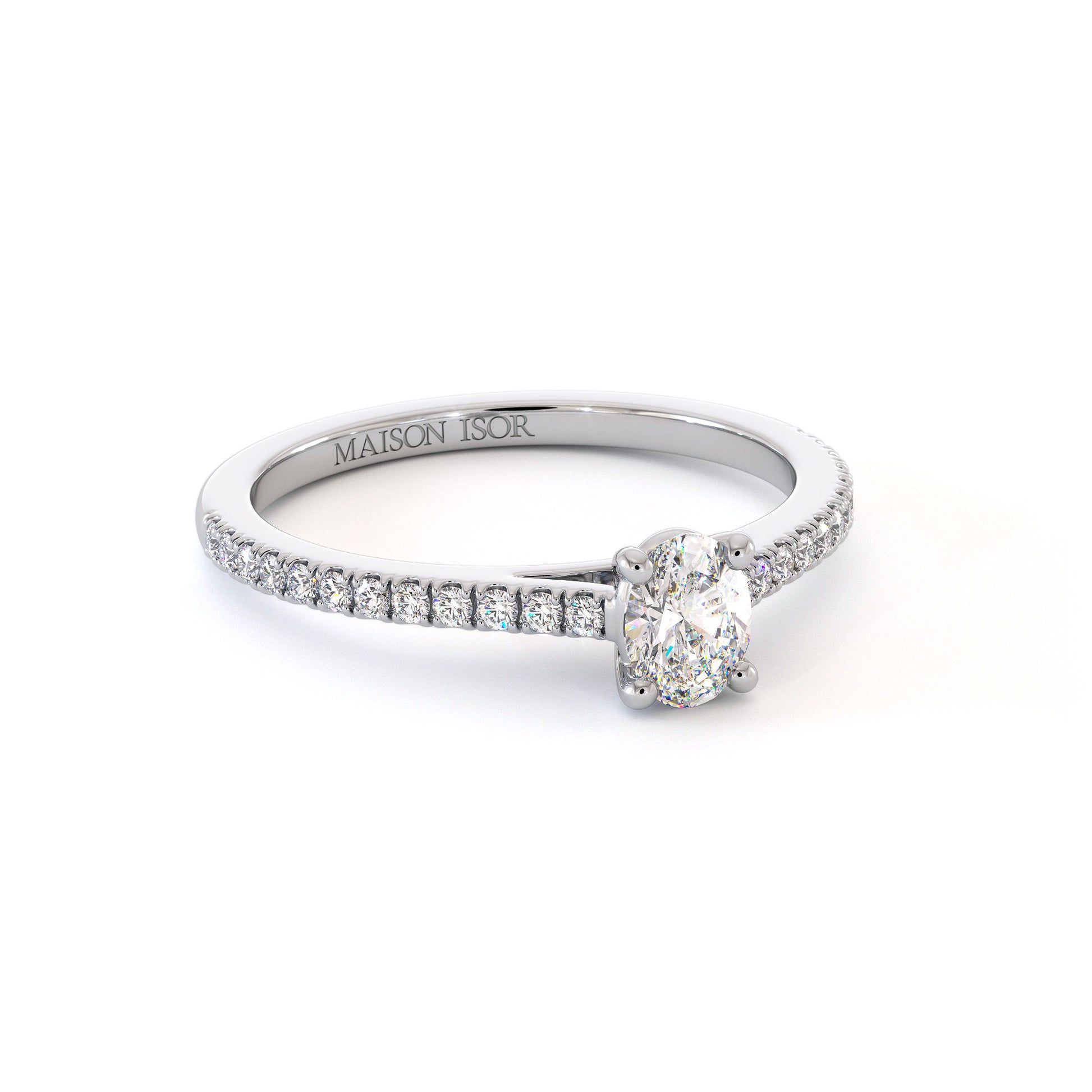 Élégance et éclat se rencontrent dans le solitaire MYLAH en diamant taille ovale accompagné. La pierre centrale, taillée en ovale, offre une silhouette allongée et lumineuse, sublimant la beauté naturelle du diamant.