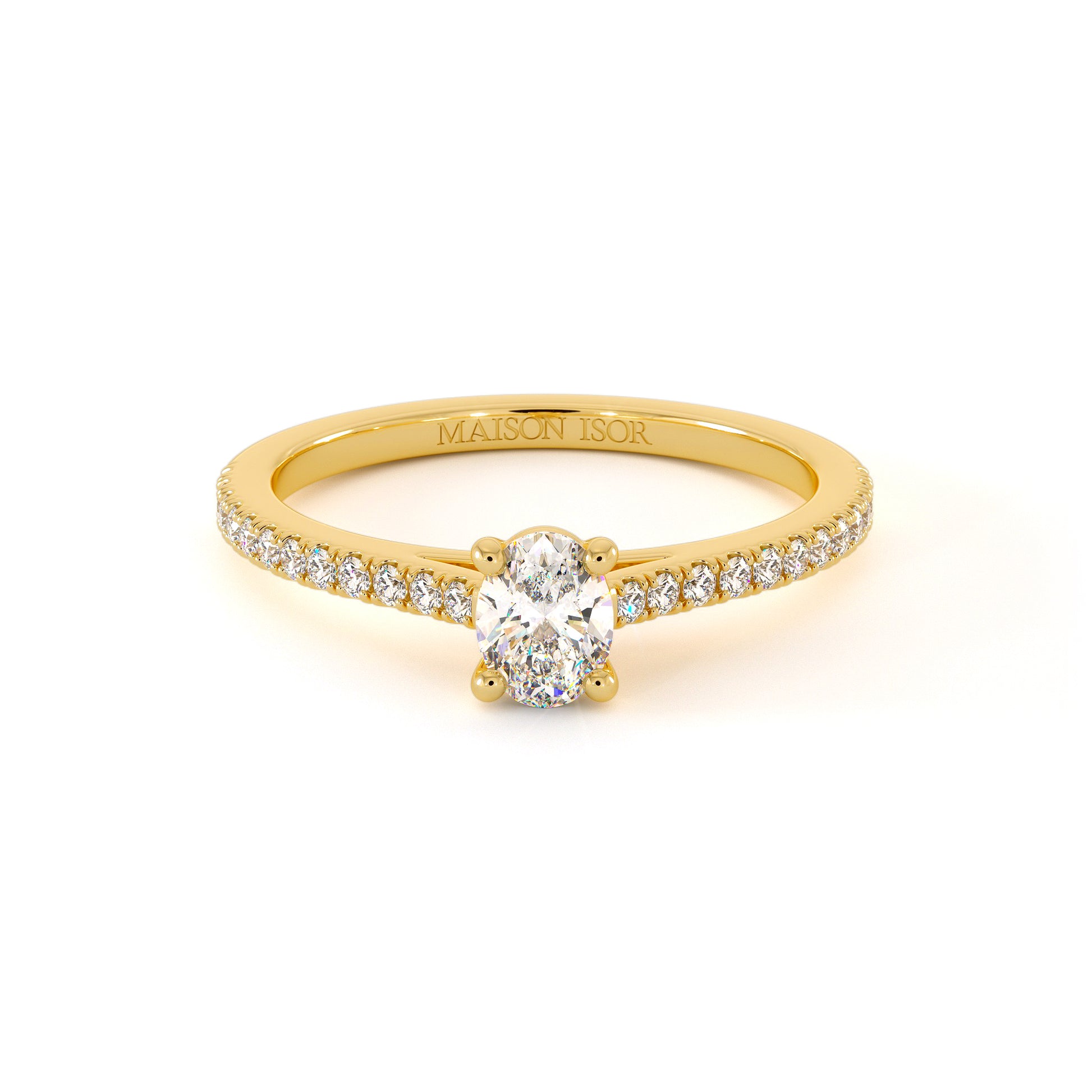 Élégance et éclat se rencontrent dans le solitaire MYLAH en diamant taille ovale accompagné. La pierre centrale, taillée en ovale, offre une silhouette allongée et lumineuse, sublimant la beauté naturelle du diamant.
