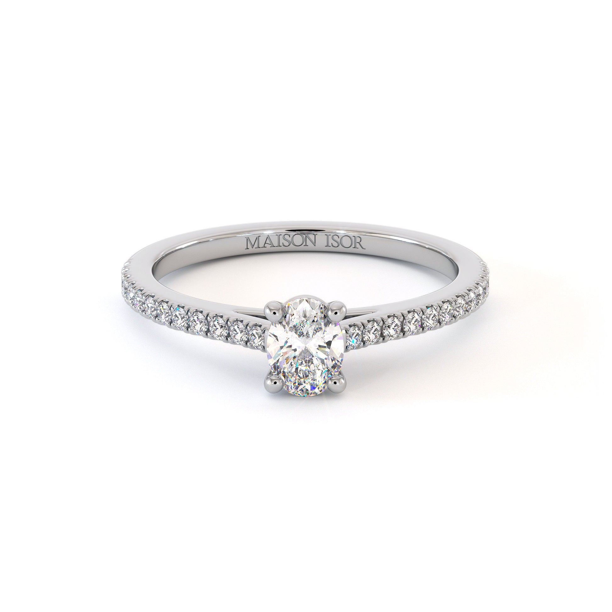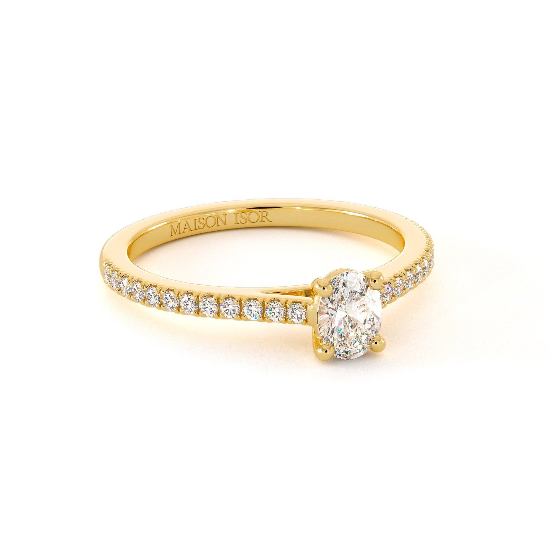 Élégance et éclat se rencontrent dans le solitaire MYLAH en diamant taille ovale accompagné. La pierre centrale, taillée en ovale, offre une silhouette allongée et lumineuse, sublimant la beauté naturelle du diamant.